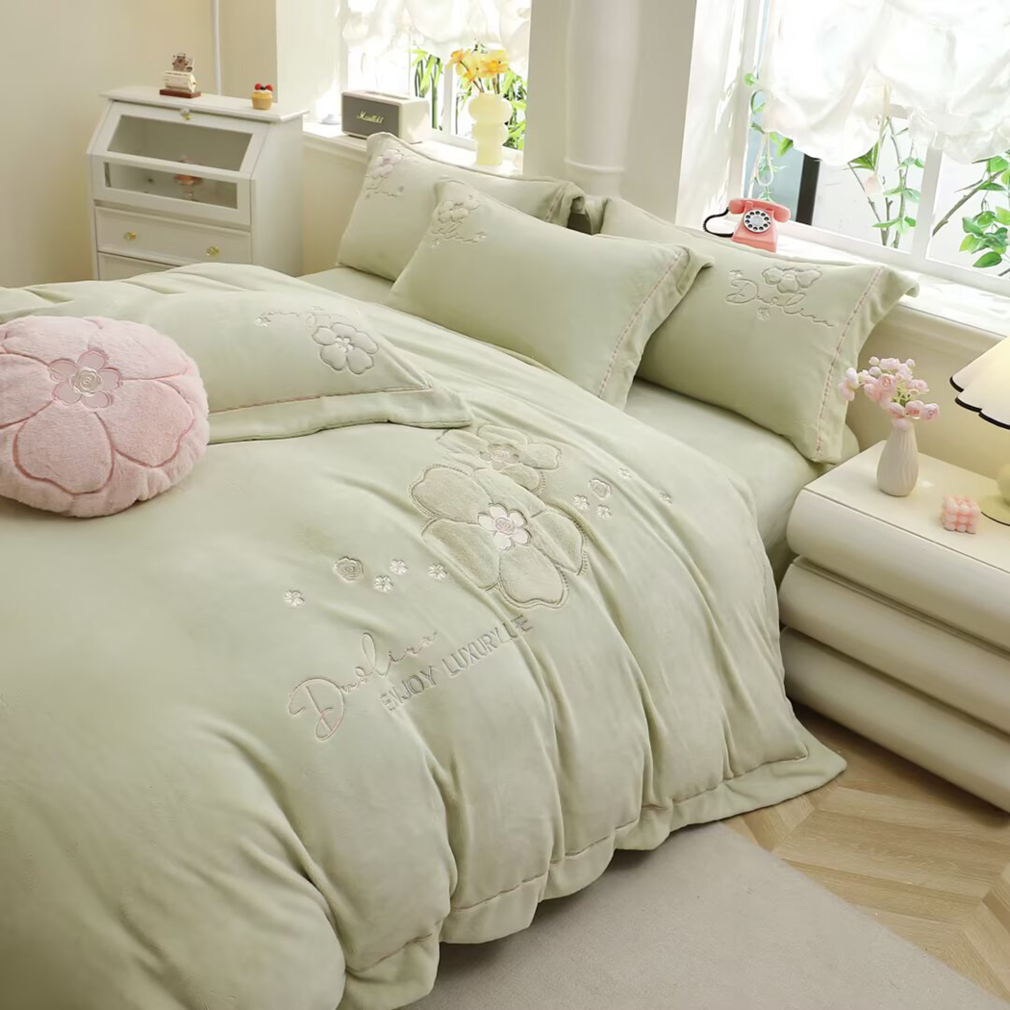 棉生活家纺 2025新款高奢工艺260克A类牛奶绒兔毛贴布绣四件套-秀妍 秀妍-青草绿