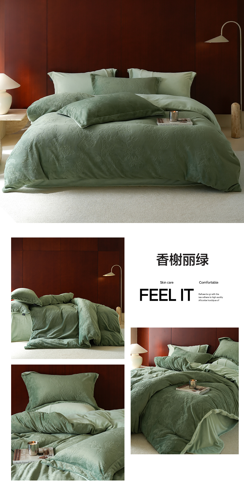 商品名称:三味舒屋 2025新款全消光雕花牛奶绒四件套-香榭丽 香榭丽绿
