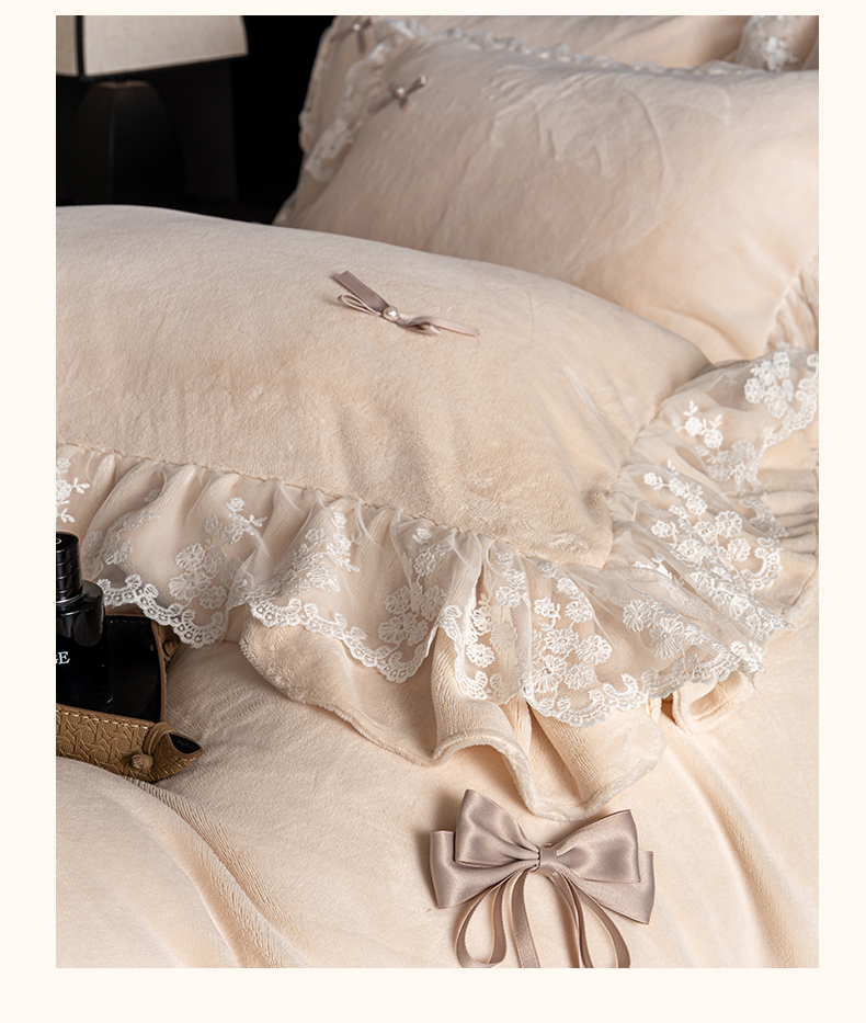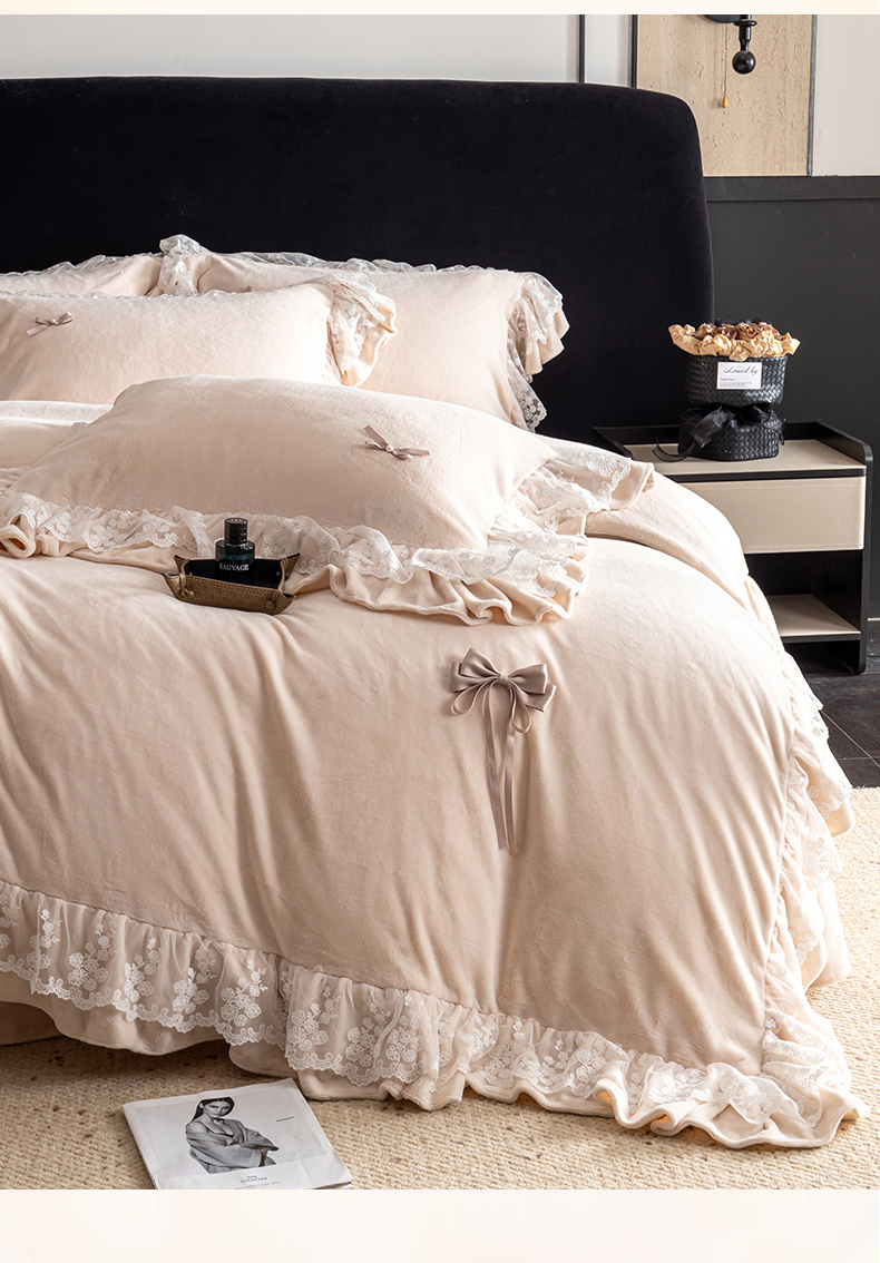 商品名称:罗优家纺 2025新款柔梦花边款暖绒四件套 暖杏色