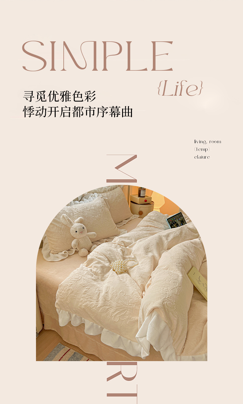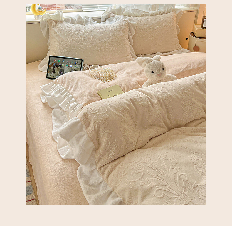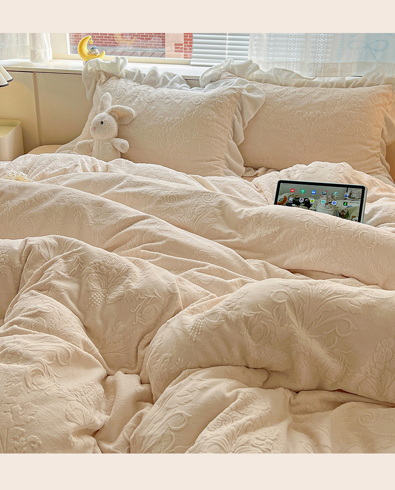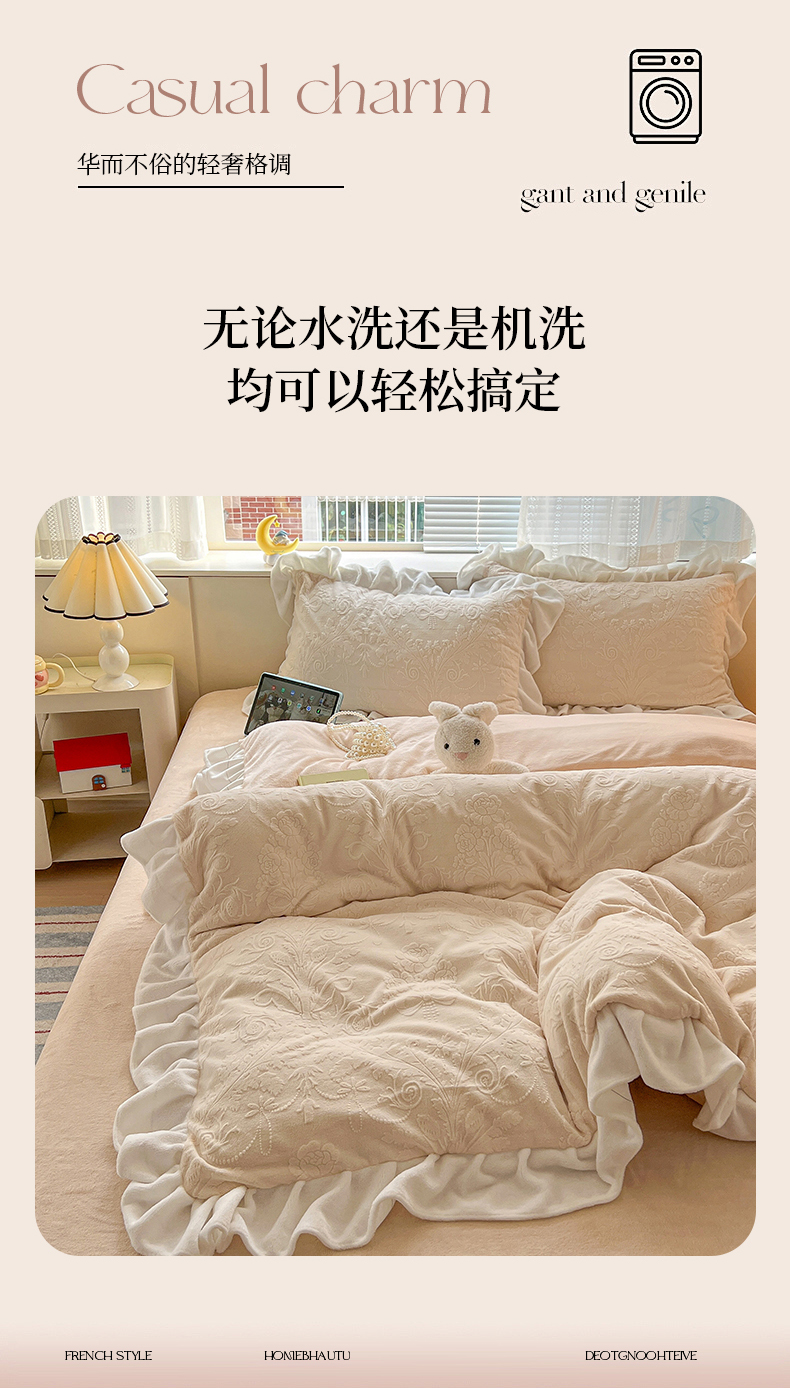 当前位置: 91家纺网 > 商品网购 > 床品套件 > 四件套 > 牛奶绒四件套 > 亿梵家居 2025新款法式花边款A类5D牛奶绒立体雕花四件套(提供买家秀) 花边款 芙洛拉-奶油白
