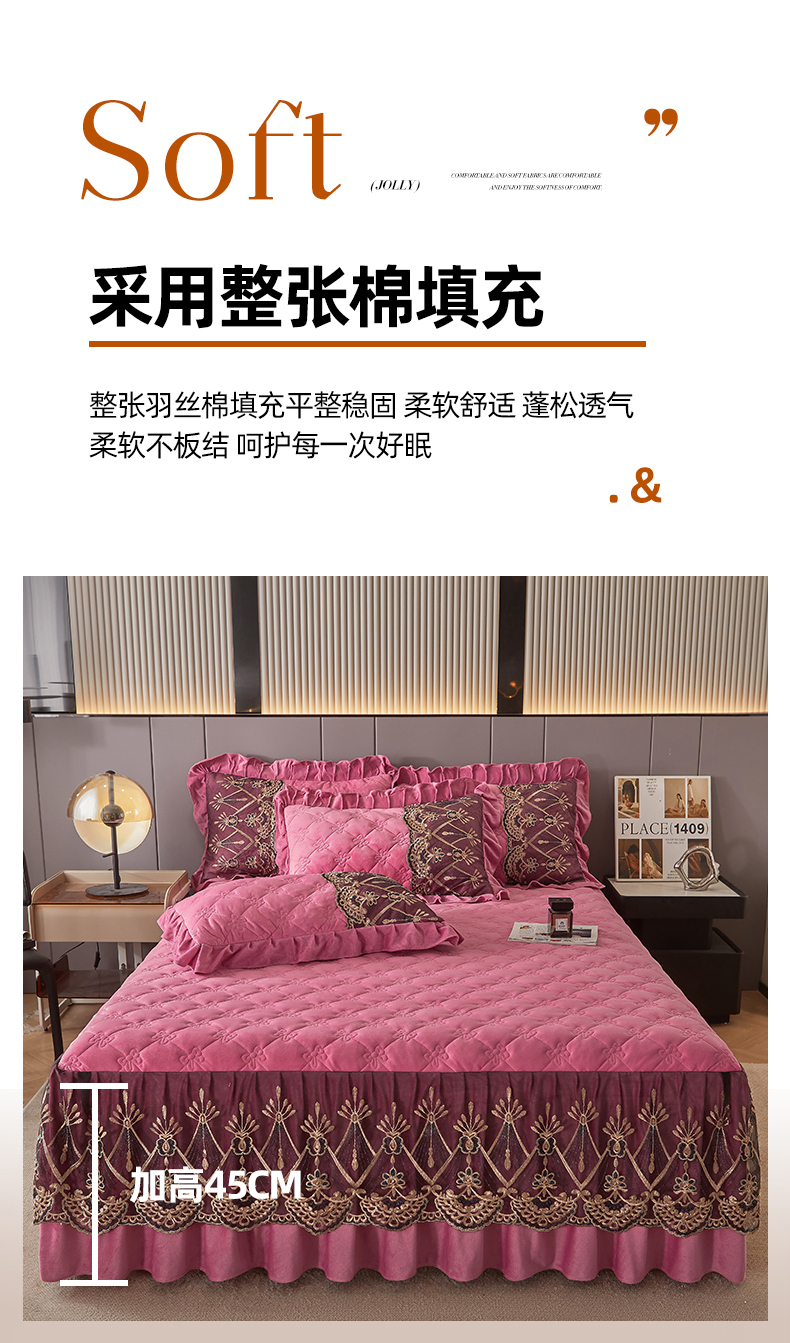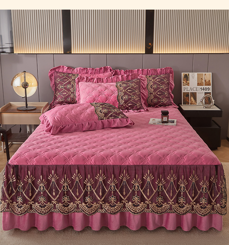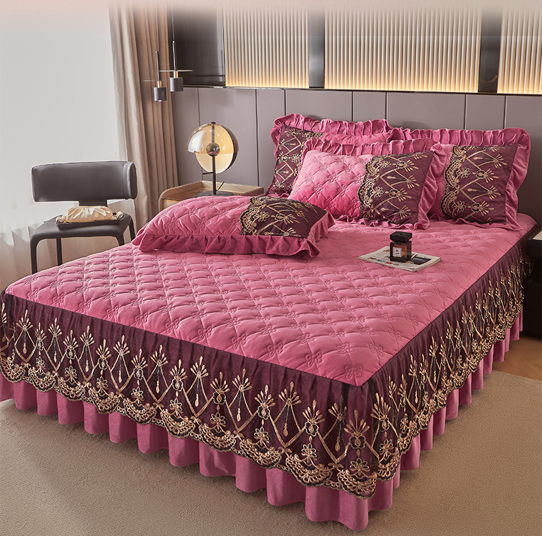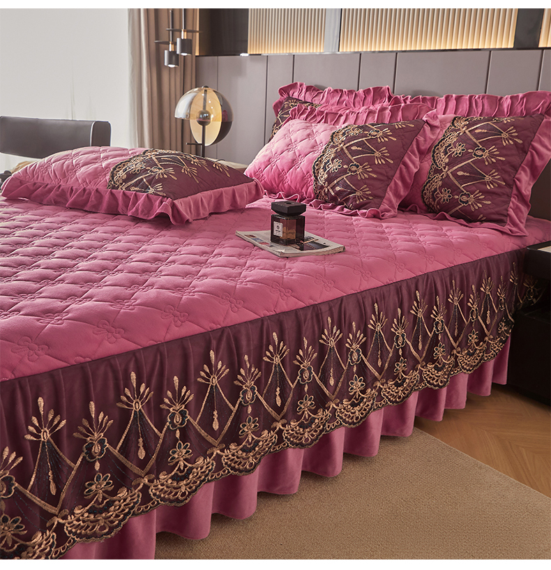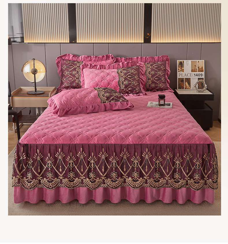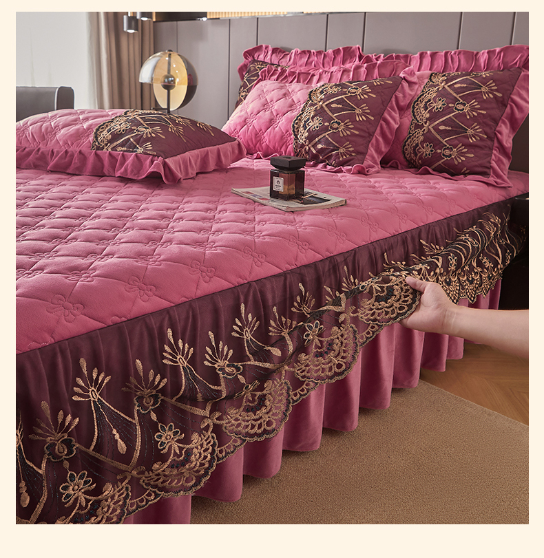 (总)屹成家纺2025新款水晶绒夹棉绗缝蕾丝床裙三件套(塞纳河畔)床裙单件起售价不低于105元,大红,豆沙,翡翠绿,粉玉,橄榄绿,蔚蓝,银灰