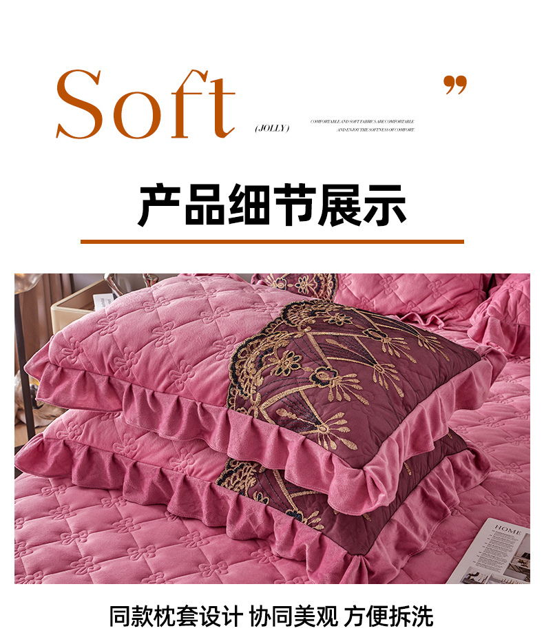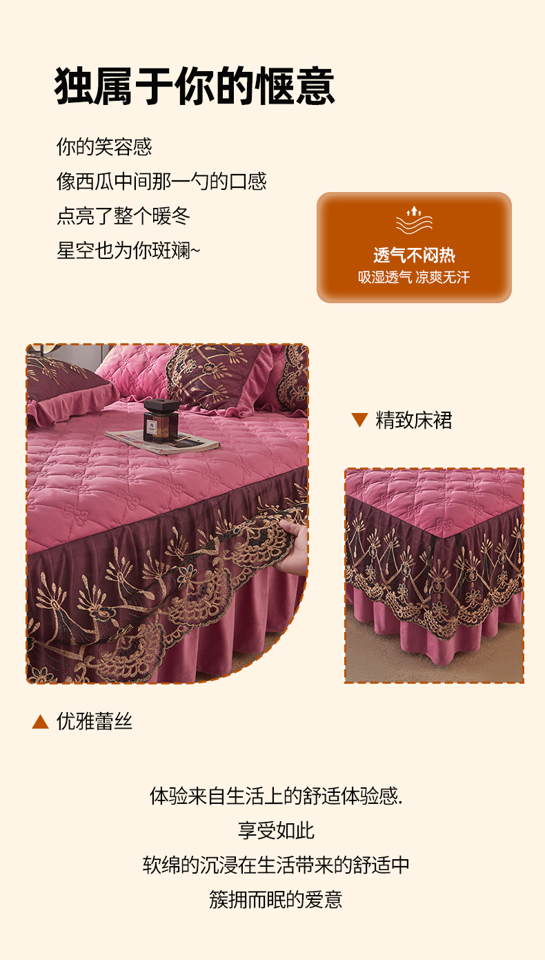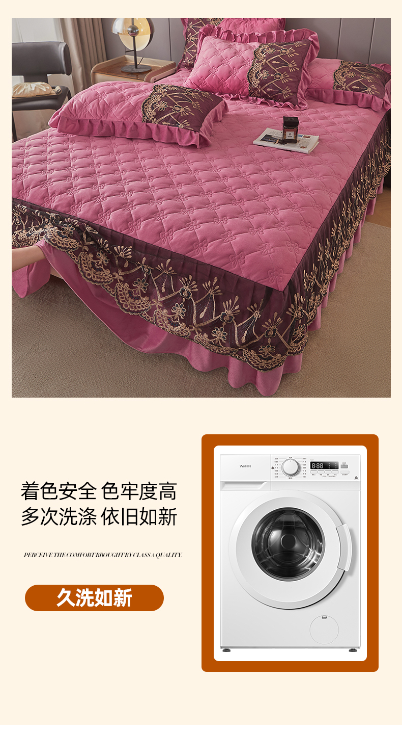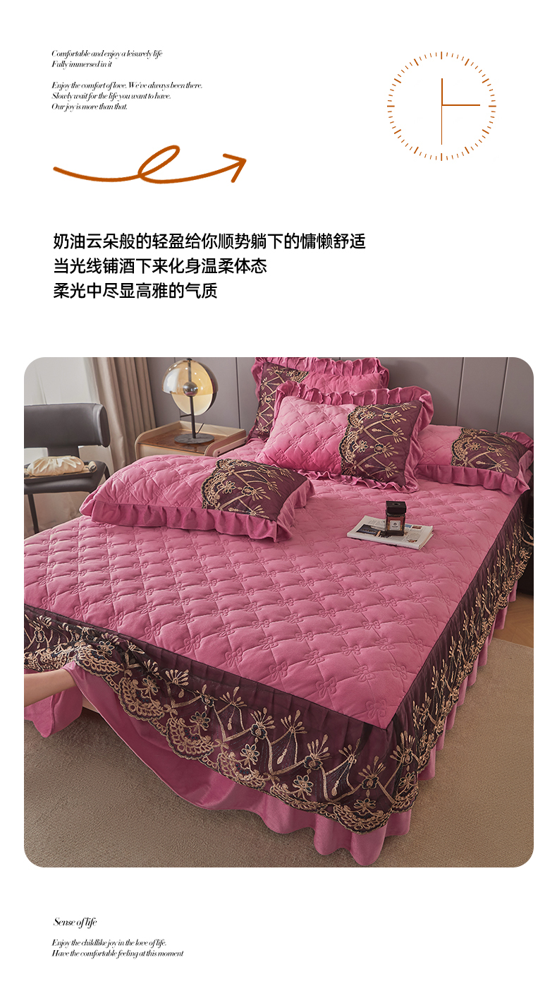 (总)屹成家纺2025新款水晶绒夹棉绗缝蕾丝床裙三件套(塞纳河畔)床裙单件起售价不低于105元,大红,豆沙,翡翠绿,粉玉,橄榄绿,蔚蓝,银灰