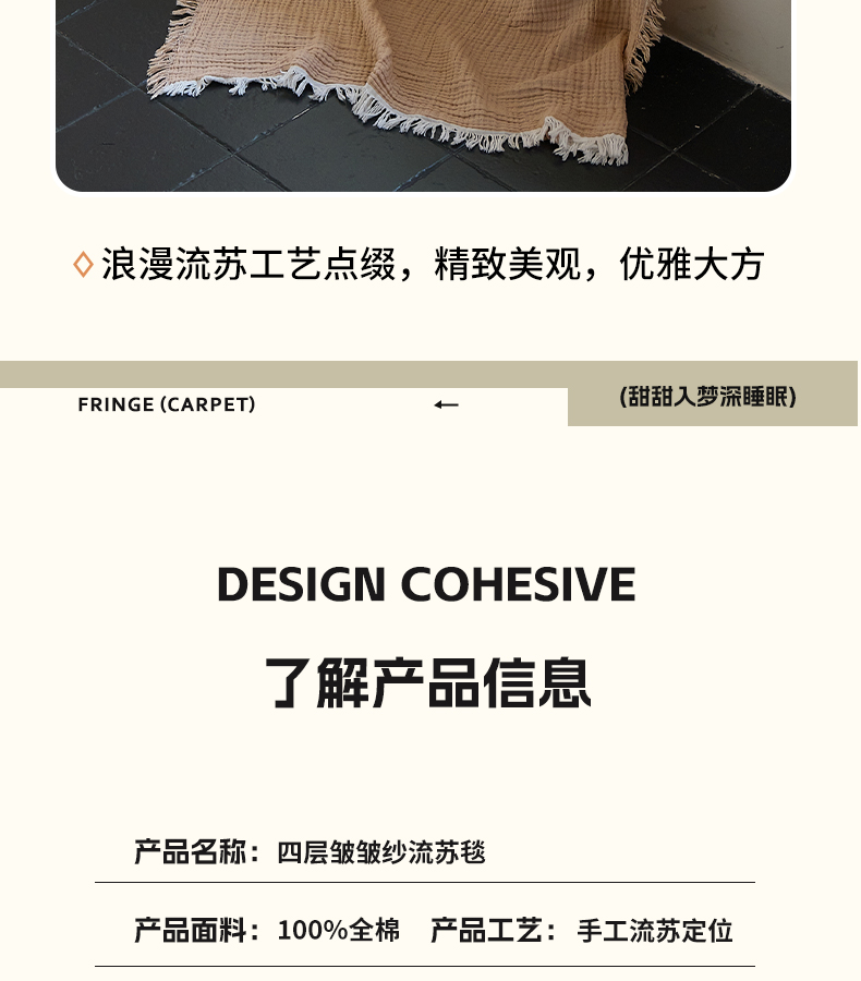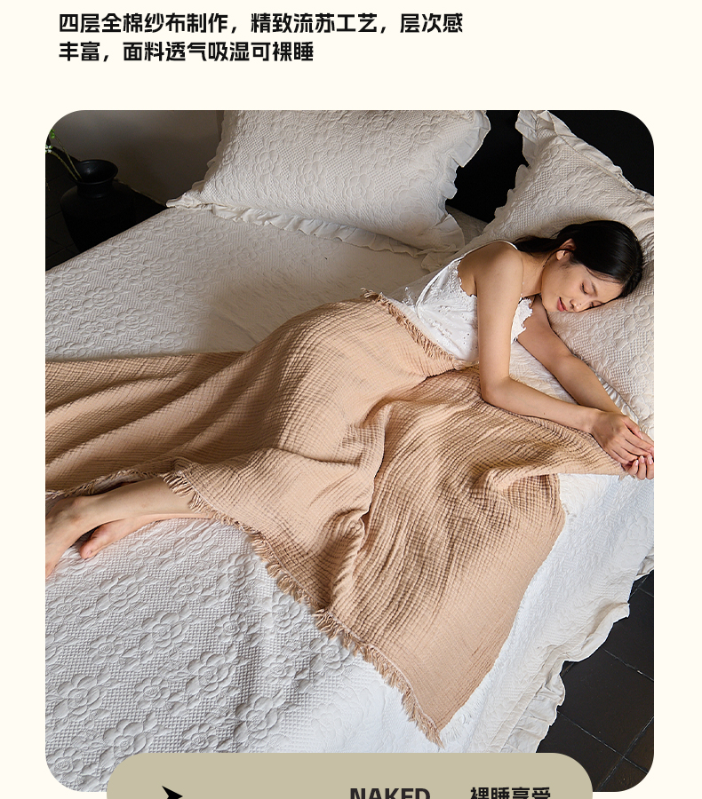 商品名称:沐瑟家纺 2025新款四层全棉纱布流苏毯系列-浪漫 浪漫-焦糖色