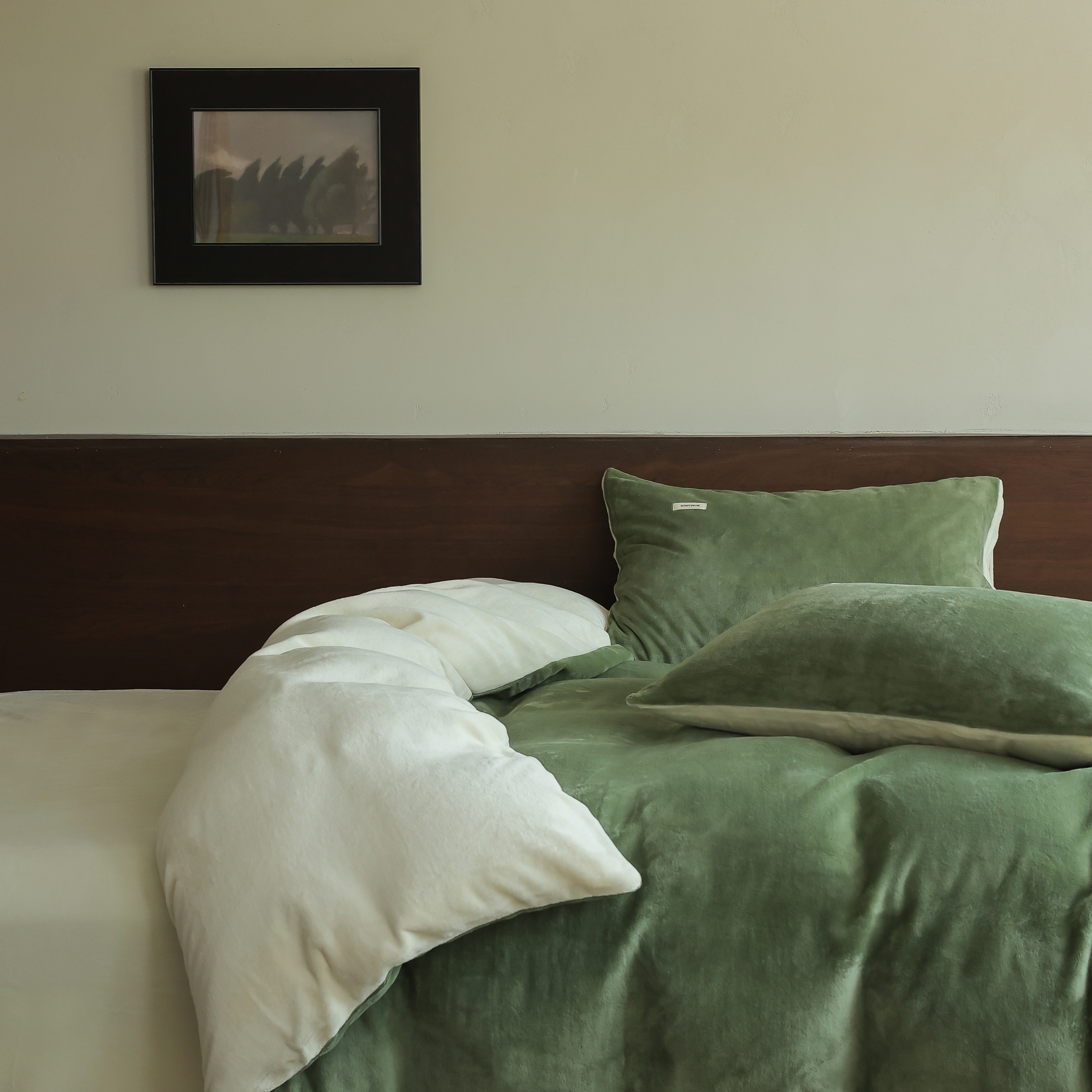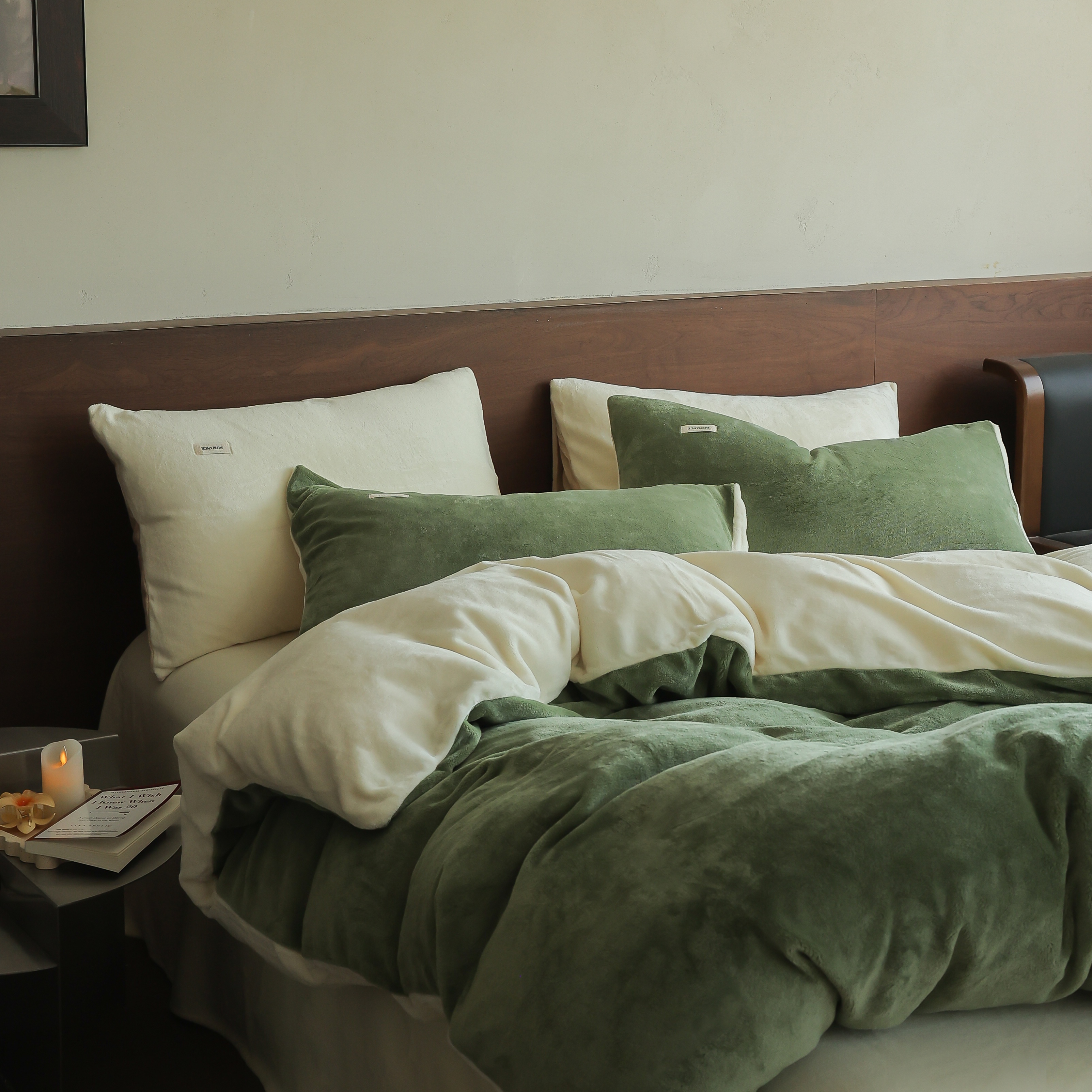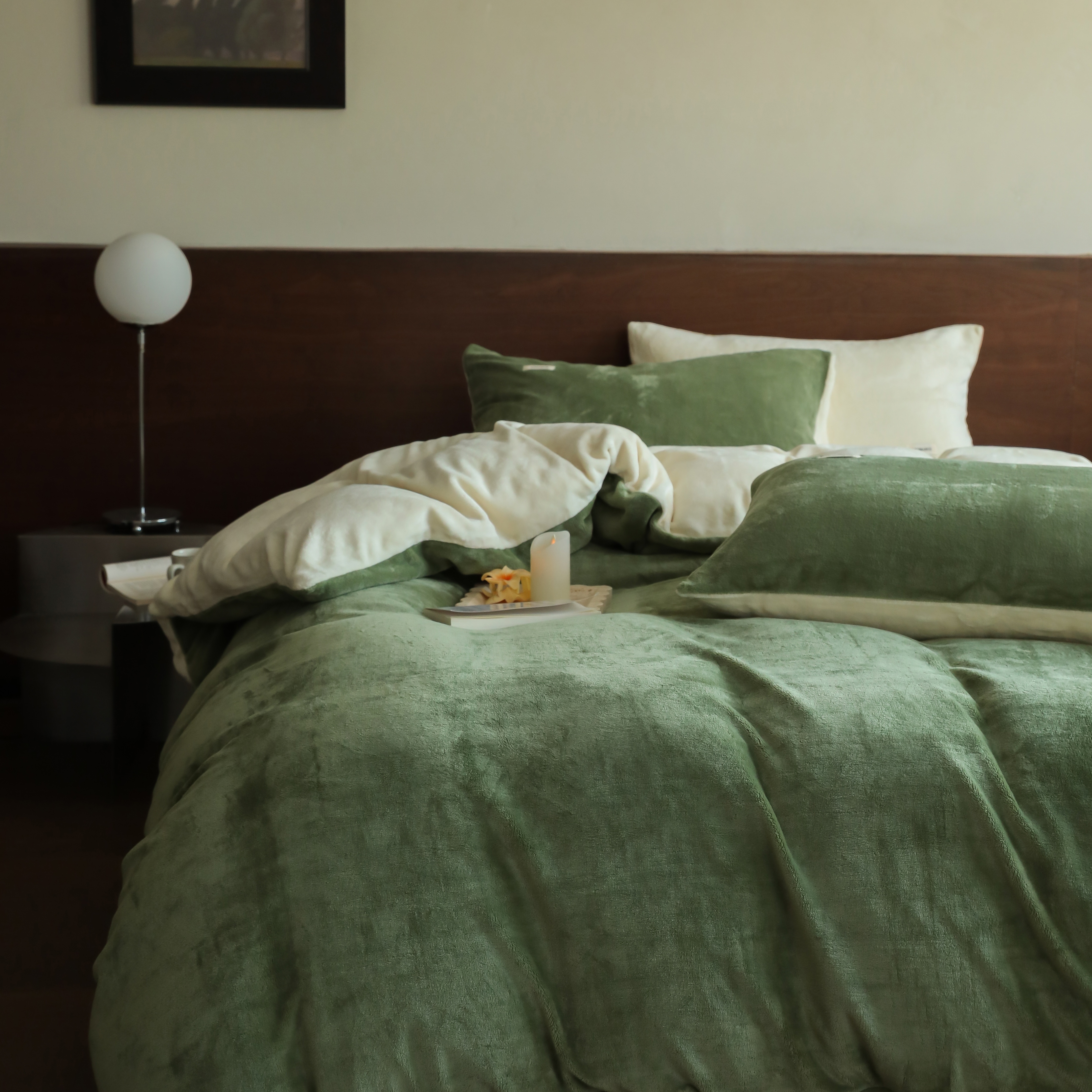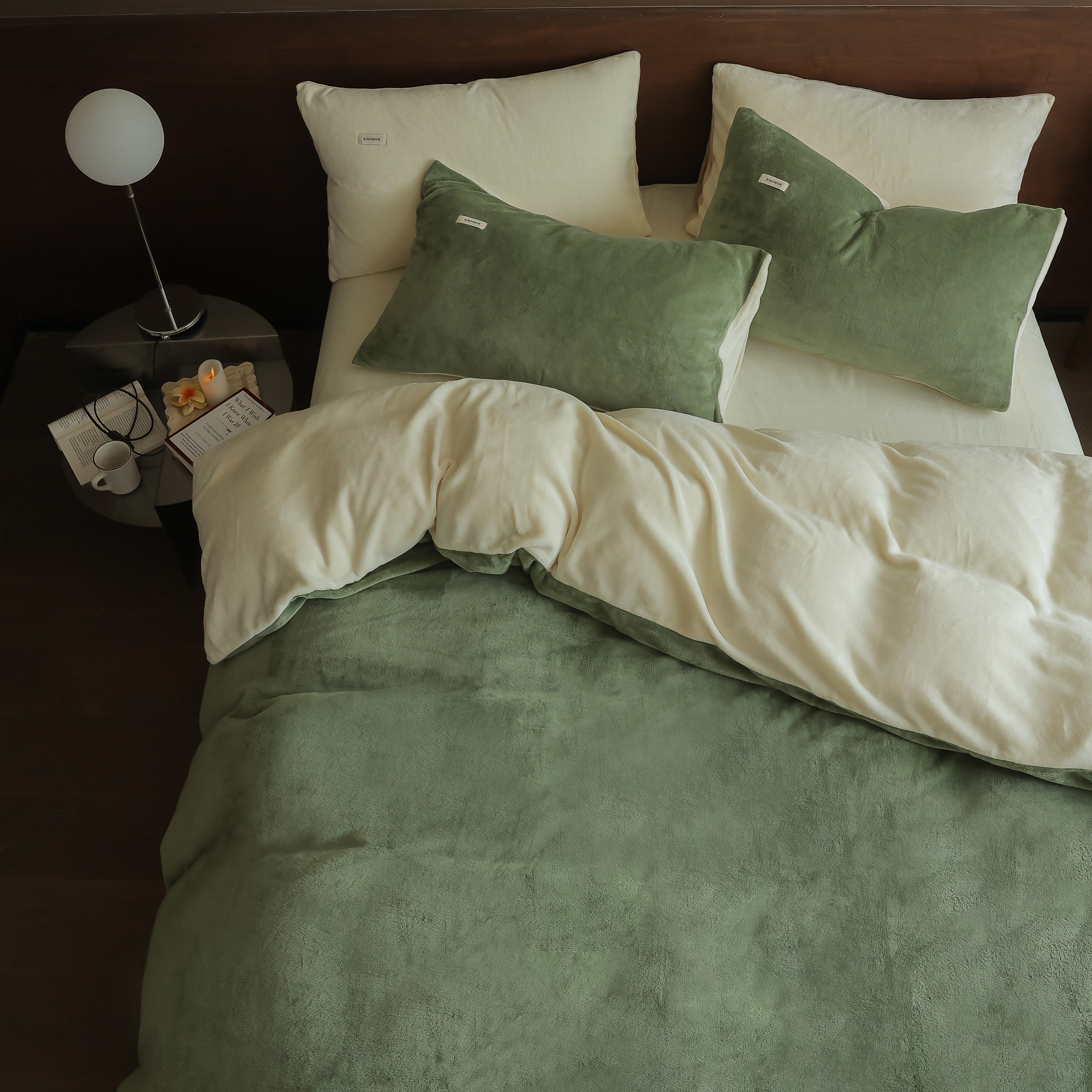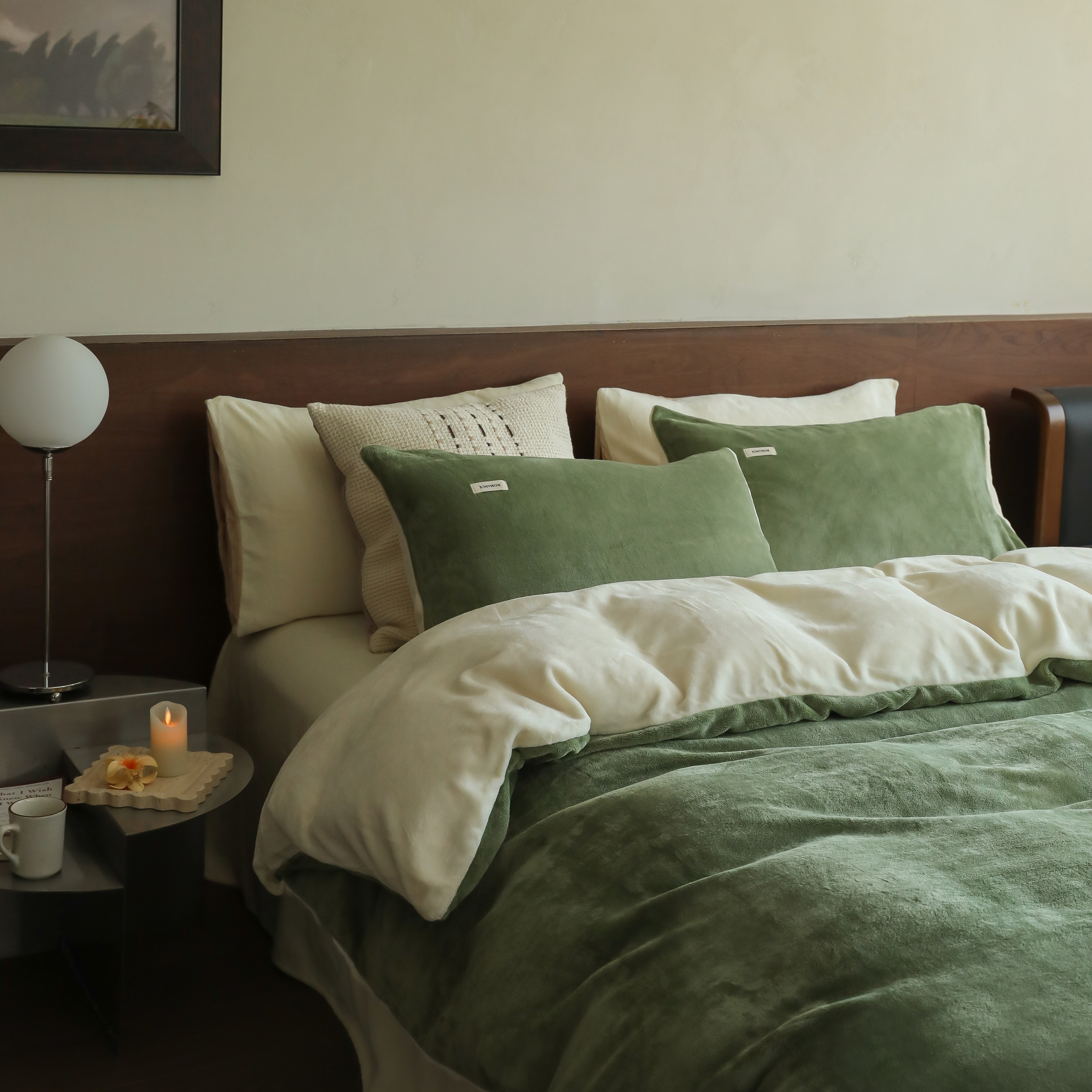 商品名称:时光里 2025新款230克纯色简约双拼牛奶绒四件套套件 橄榄绿拼奶白