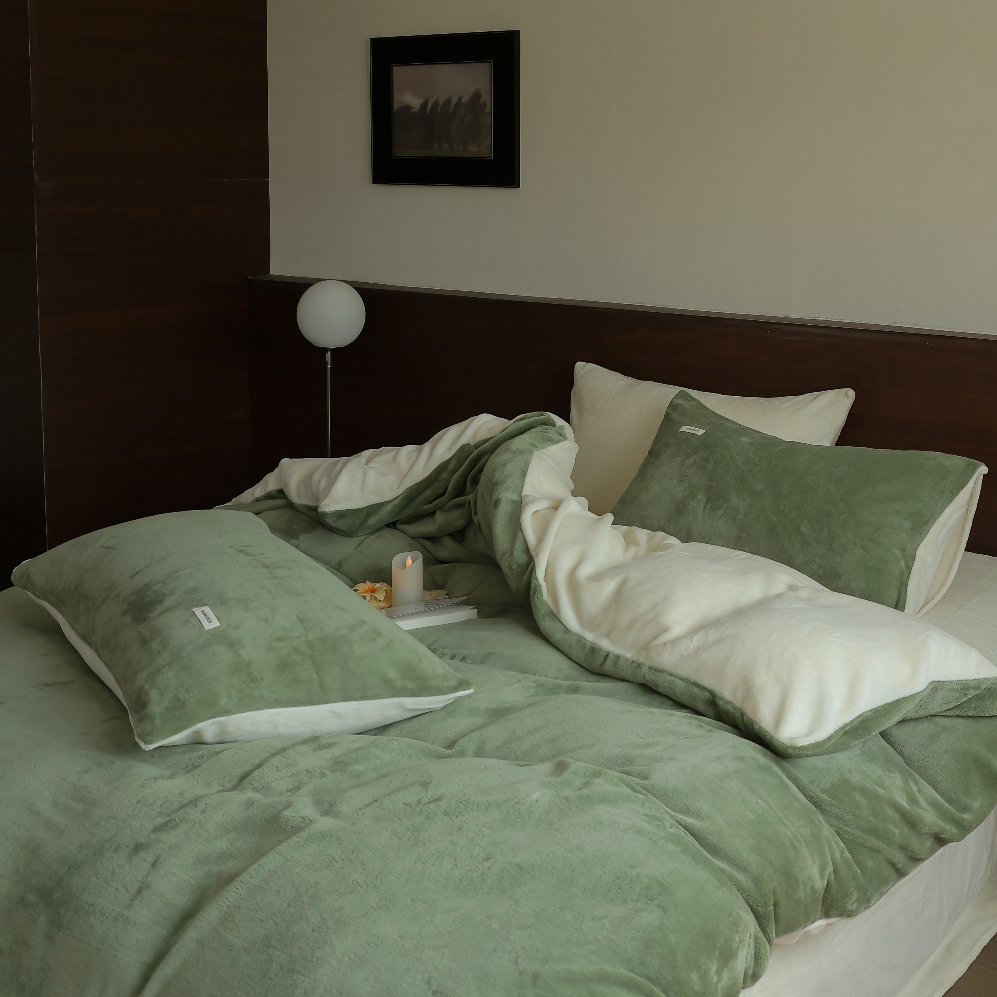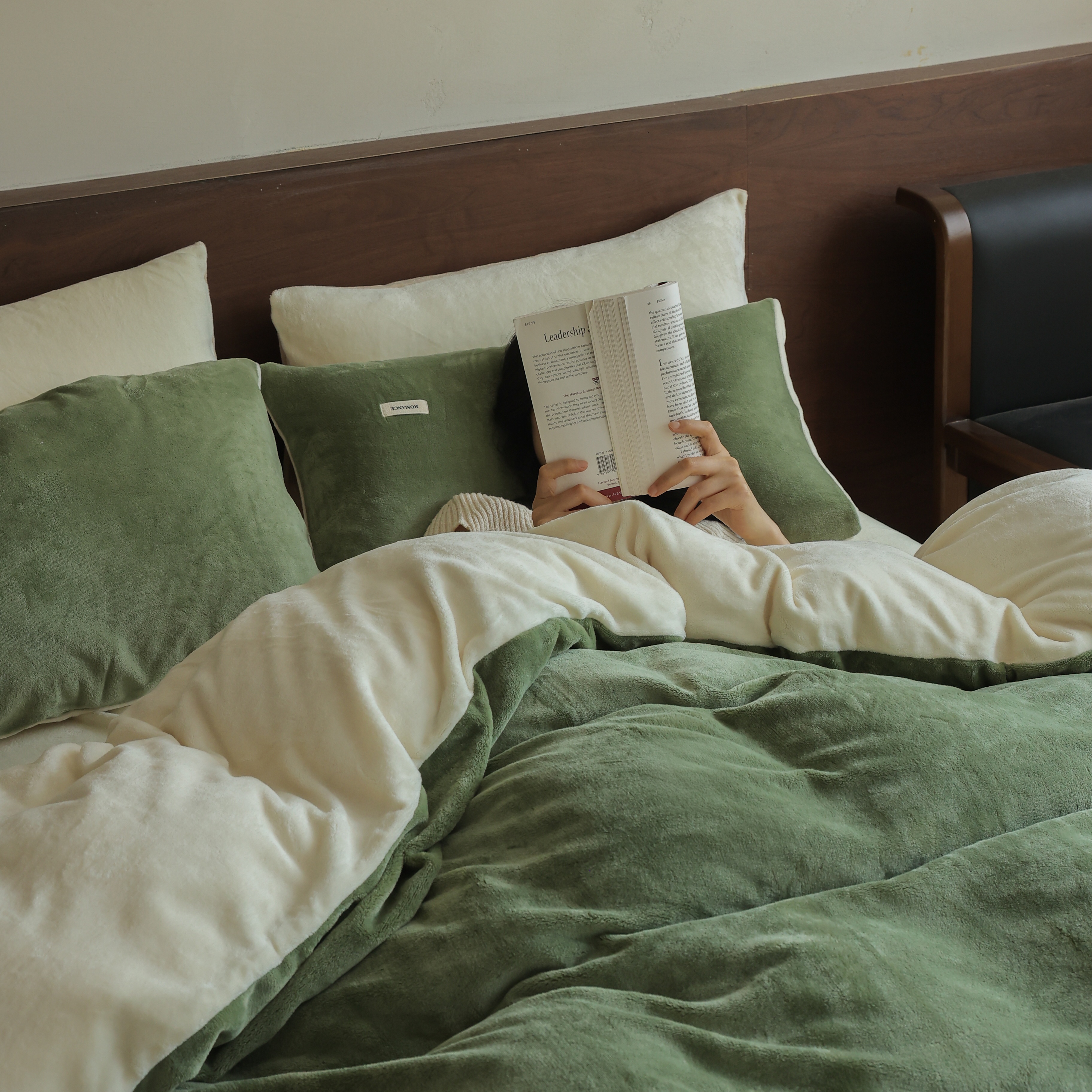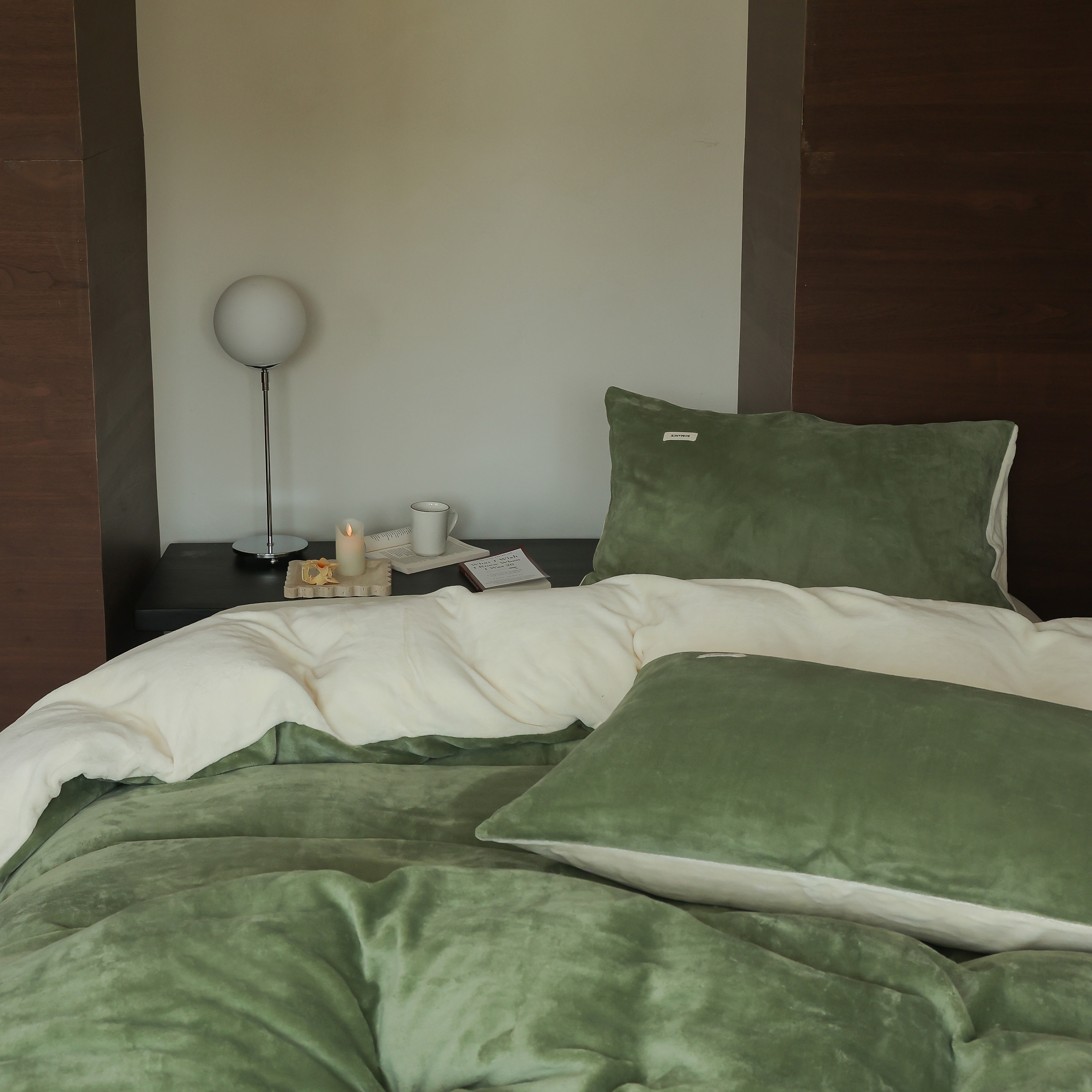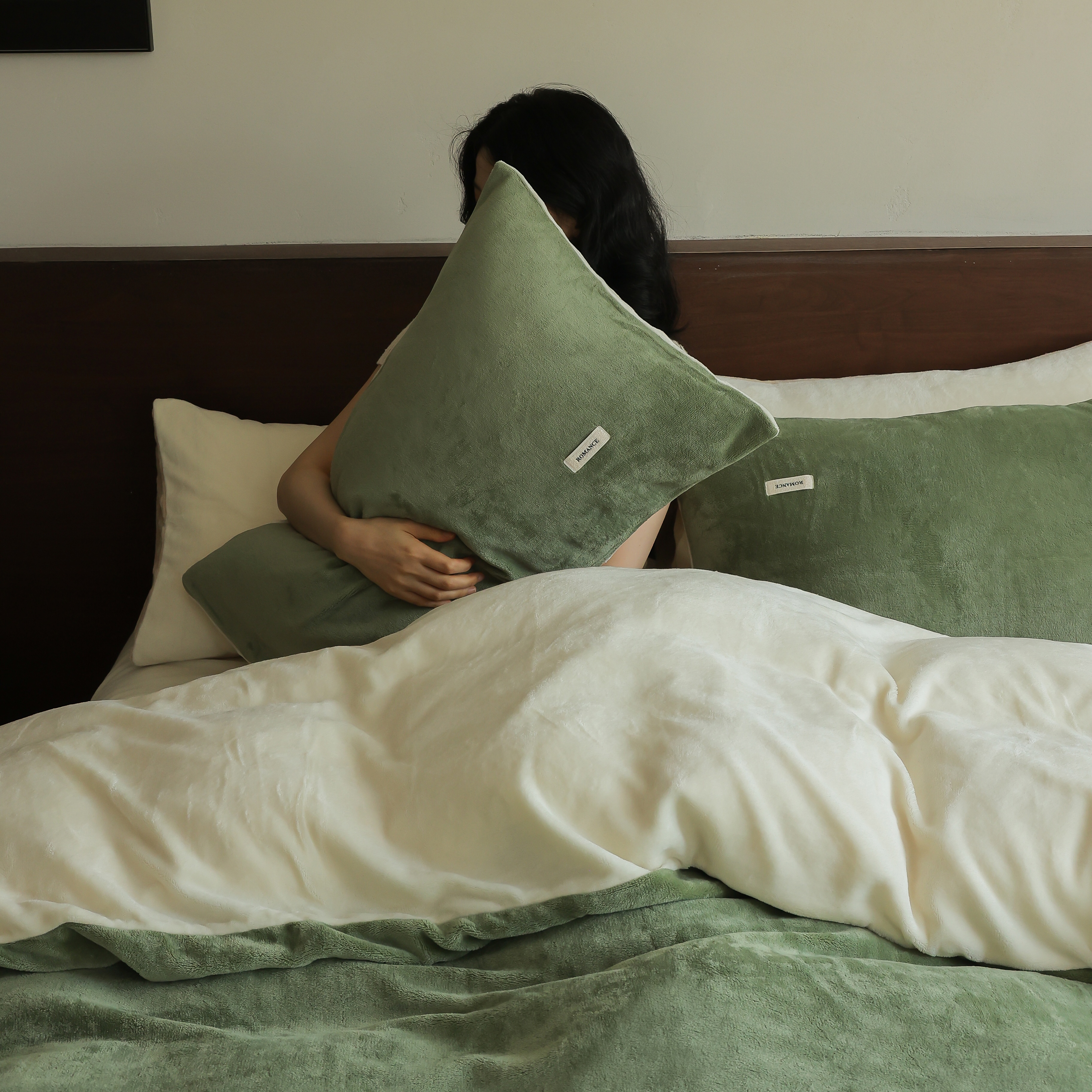 商品名称:时光里 2025新款230克纯色简约双拼牛奶绒四件套套件 橄榄绿拼奶白