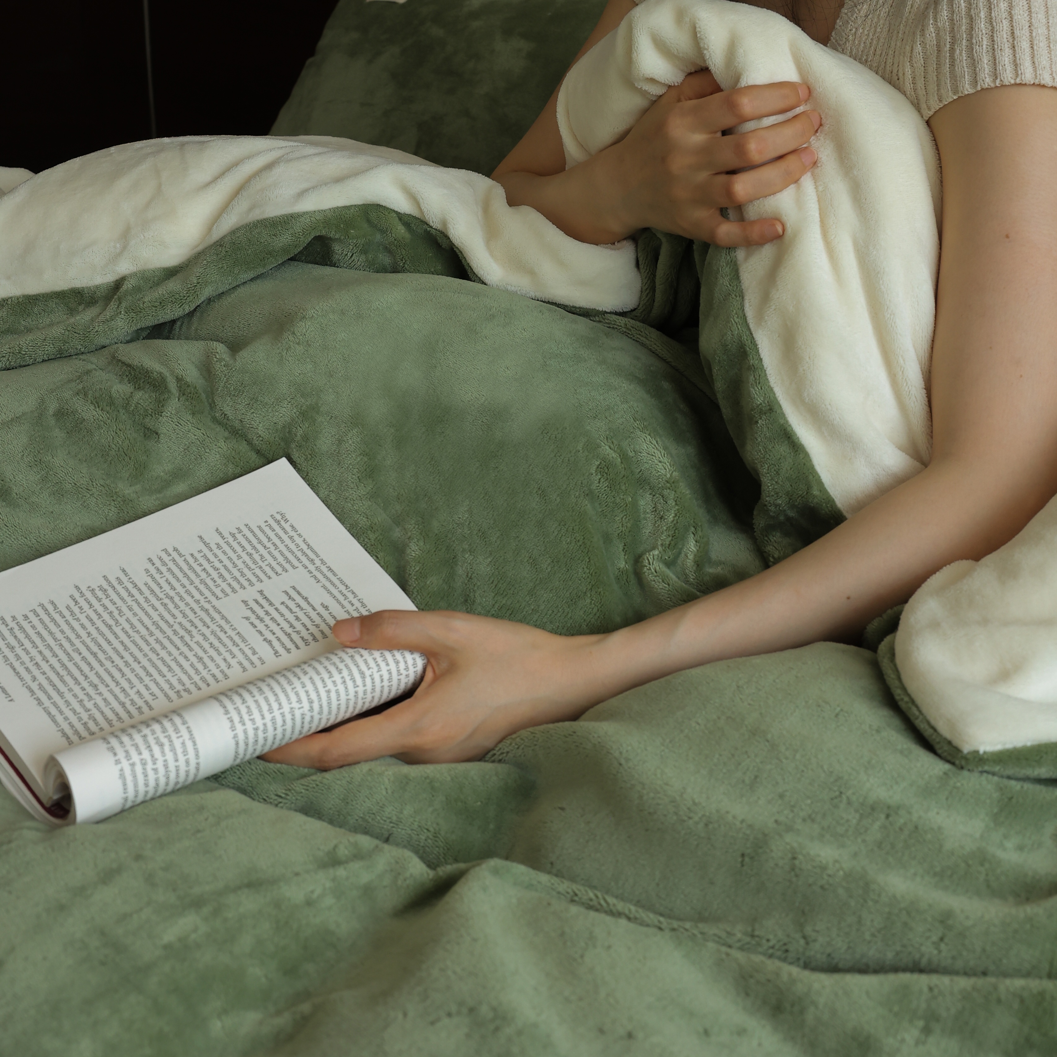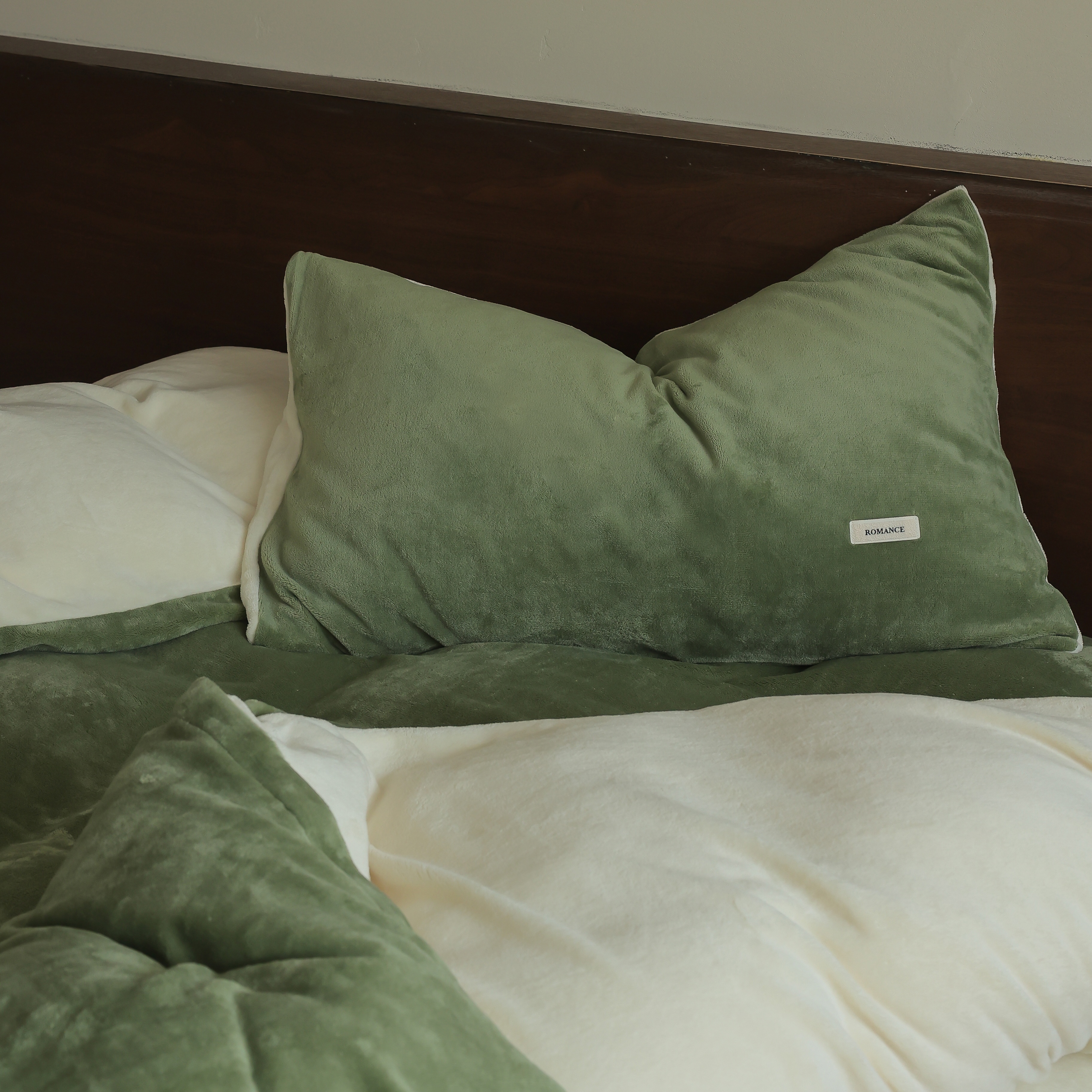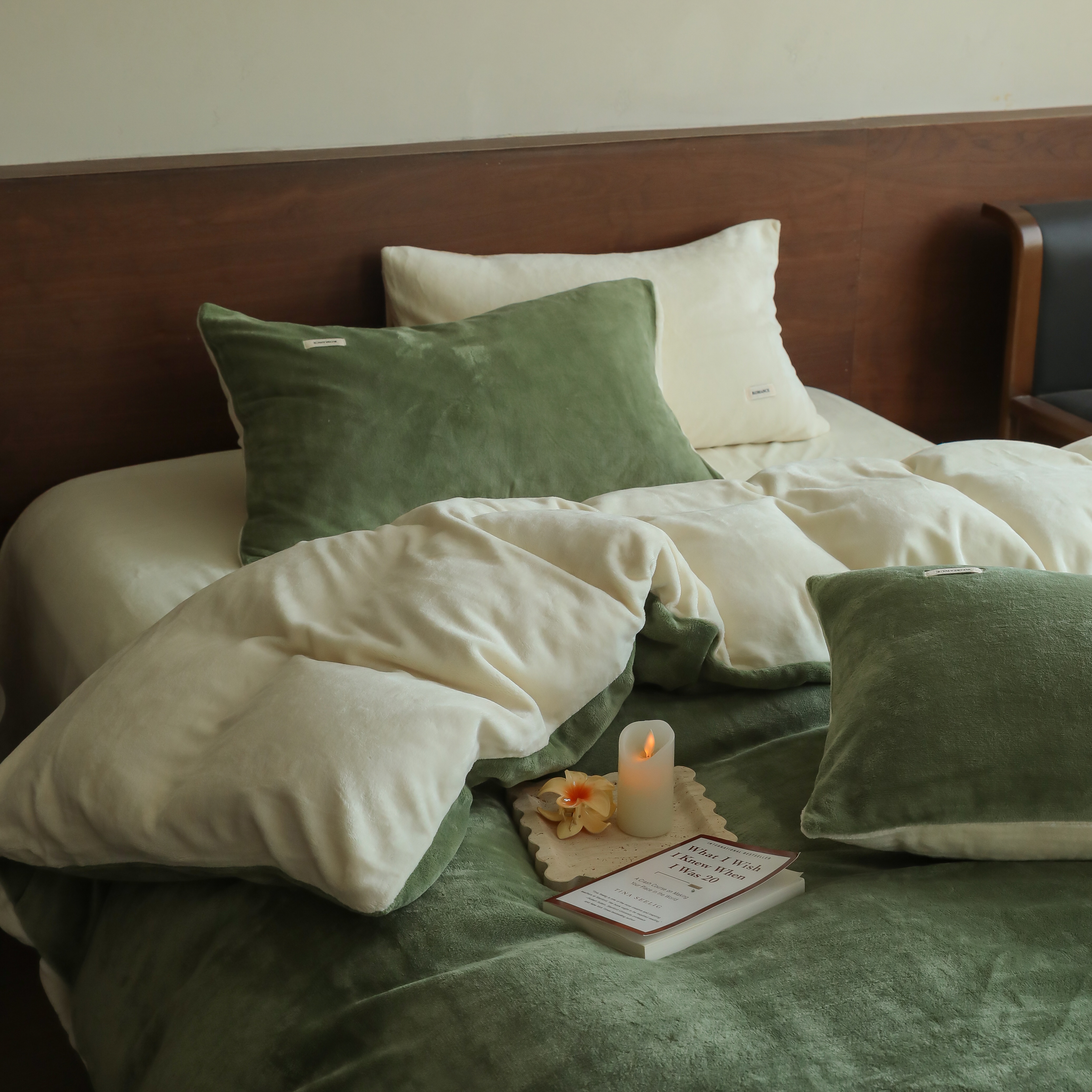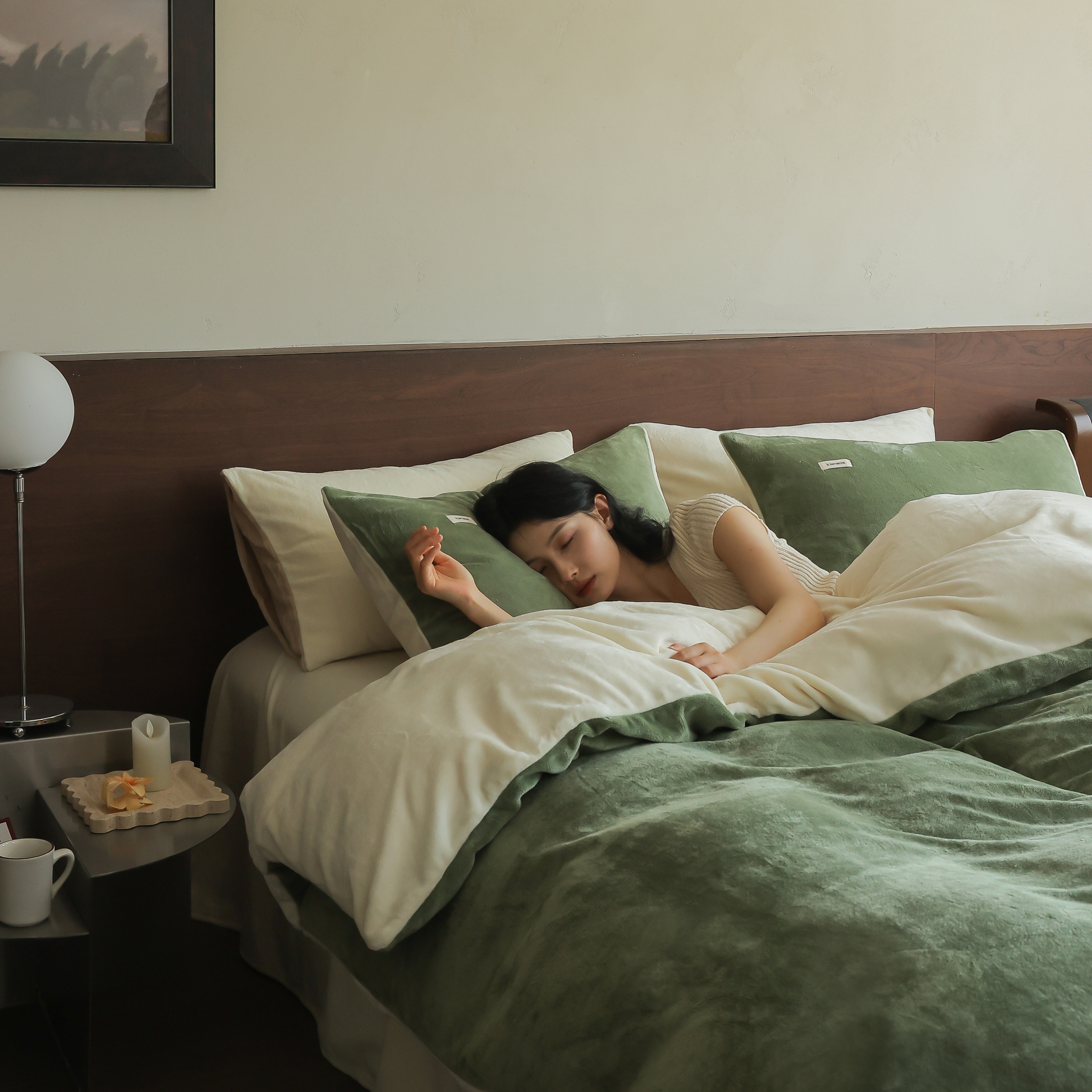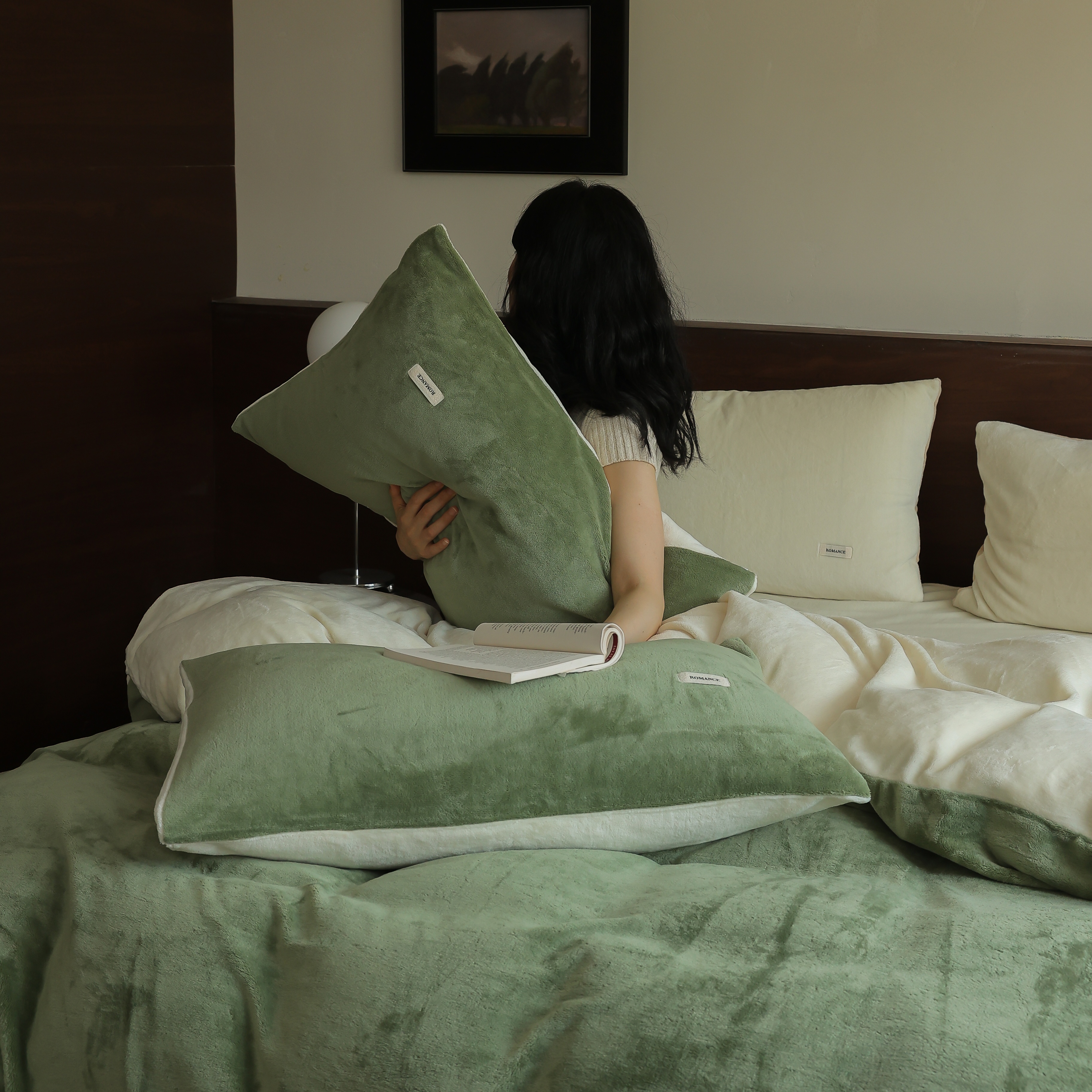 商品名称:时光里 2025新款230克纯色简约双拼牛奶绒四件套套件 橄榄绿拼奶白