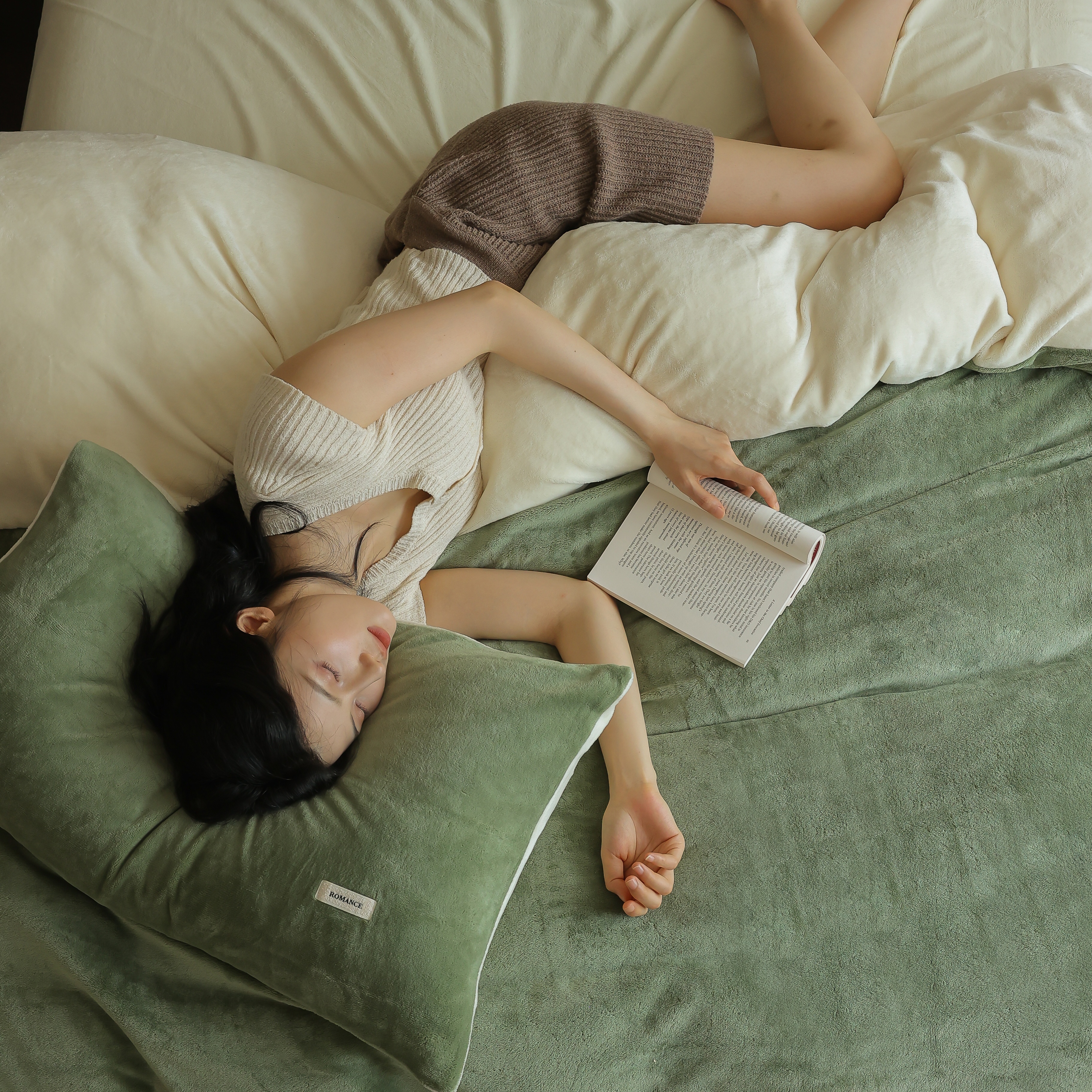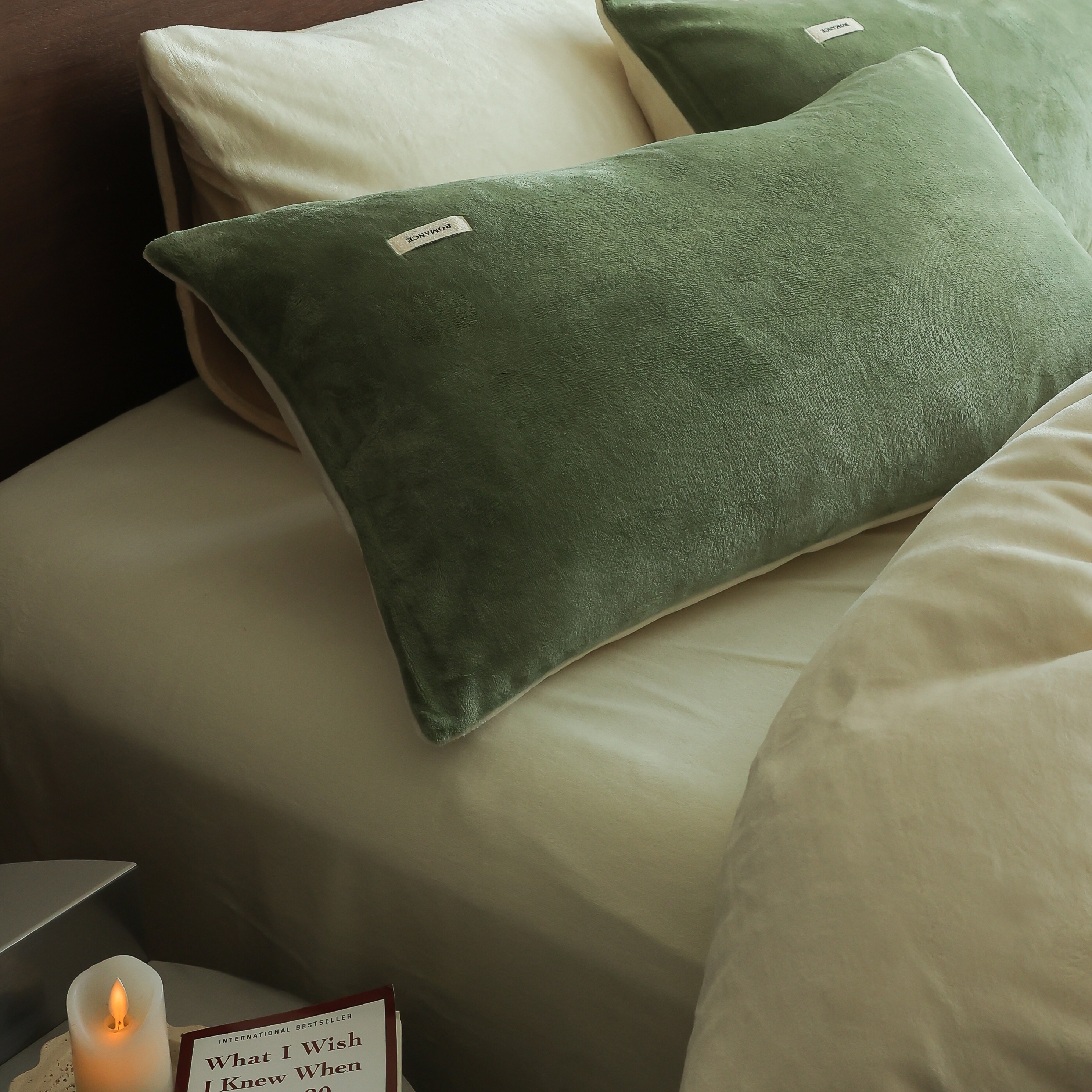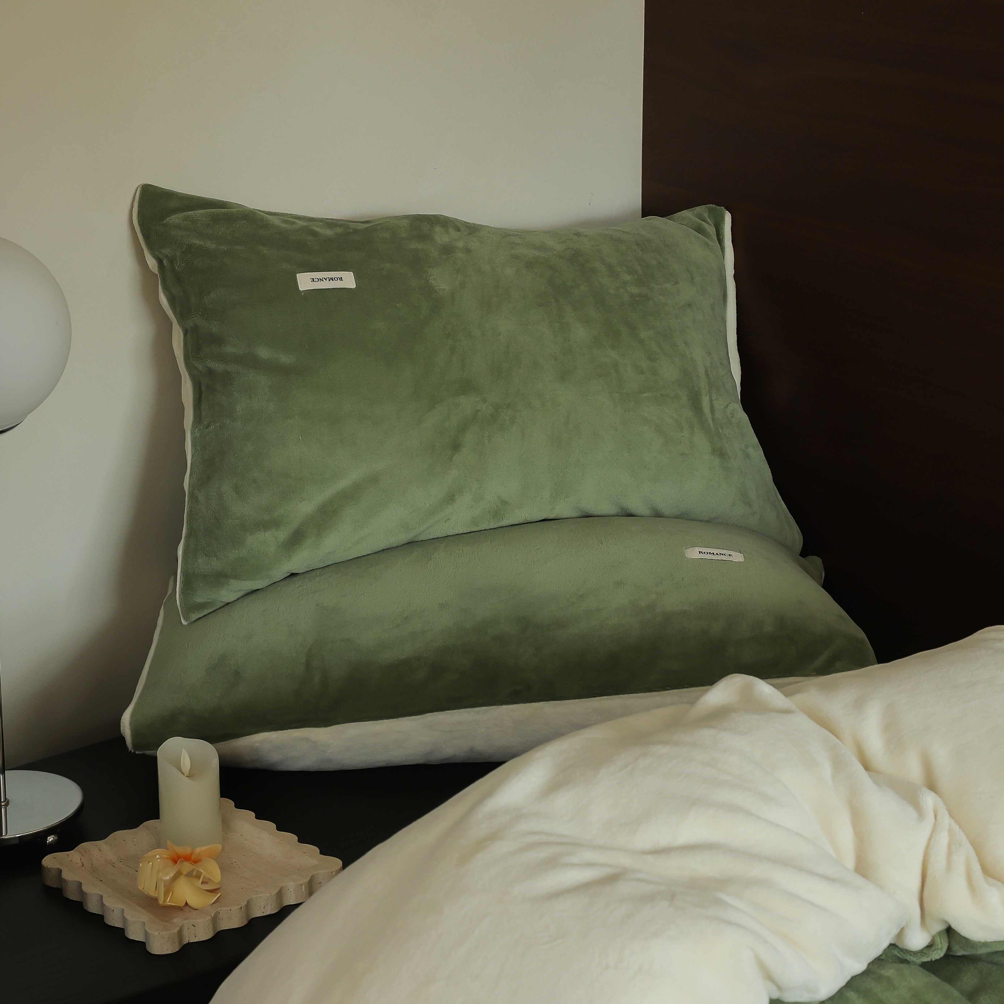 时光里 2025新款230克纯色简约双拼牛奶绒四件套套件 橄榄绿拼奶白