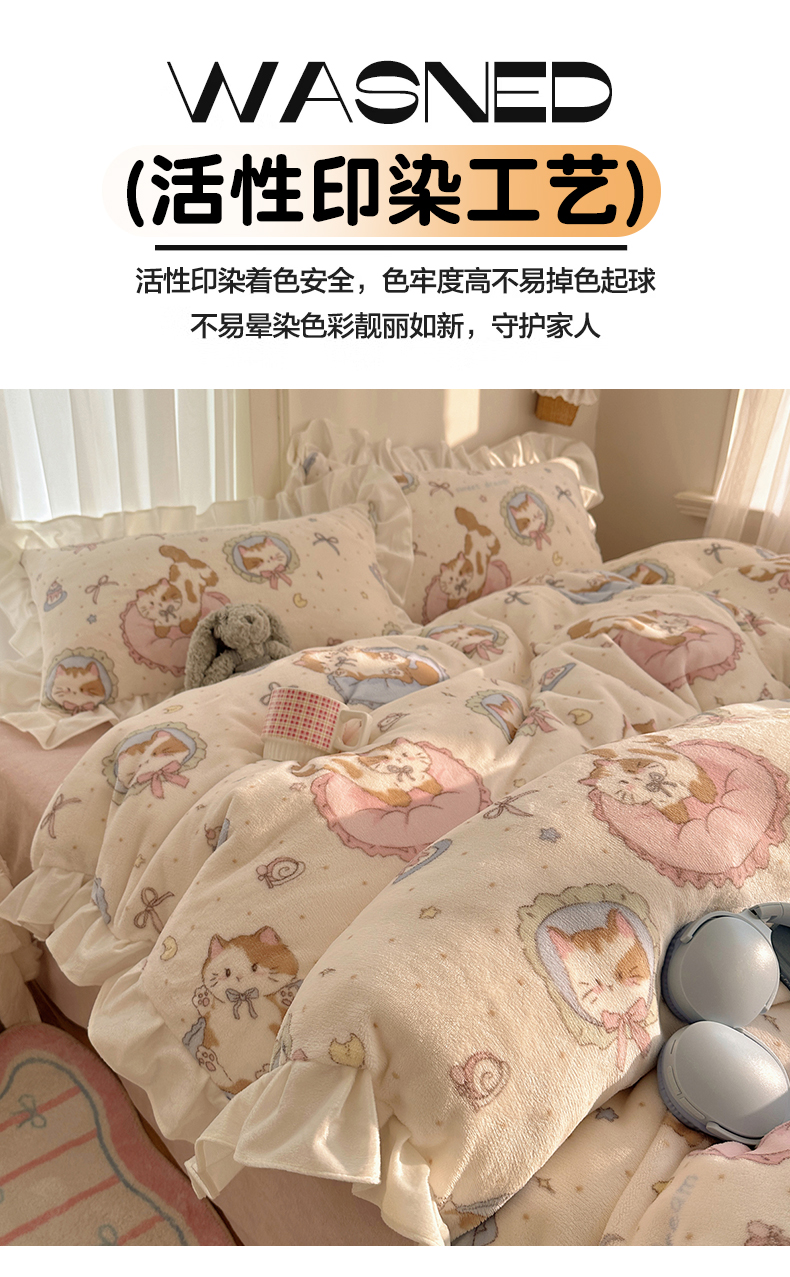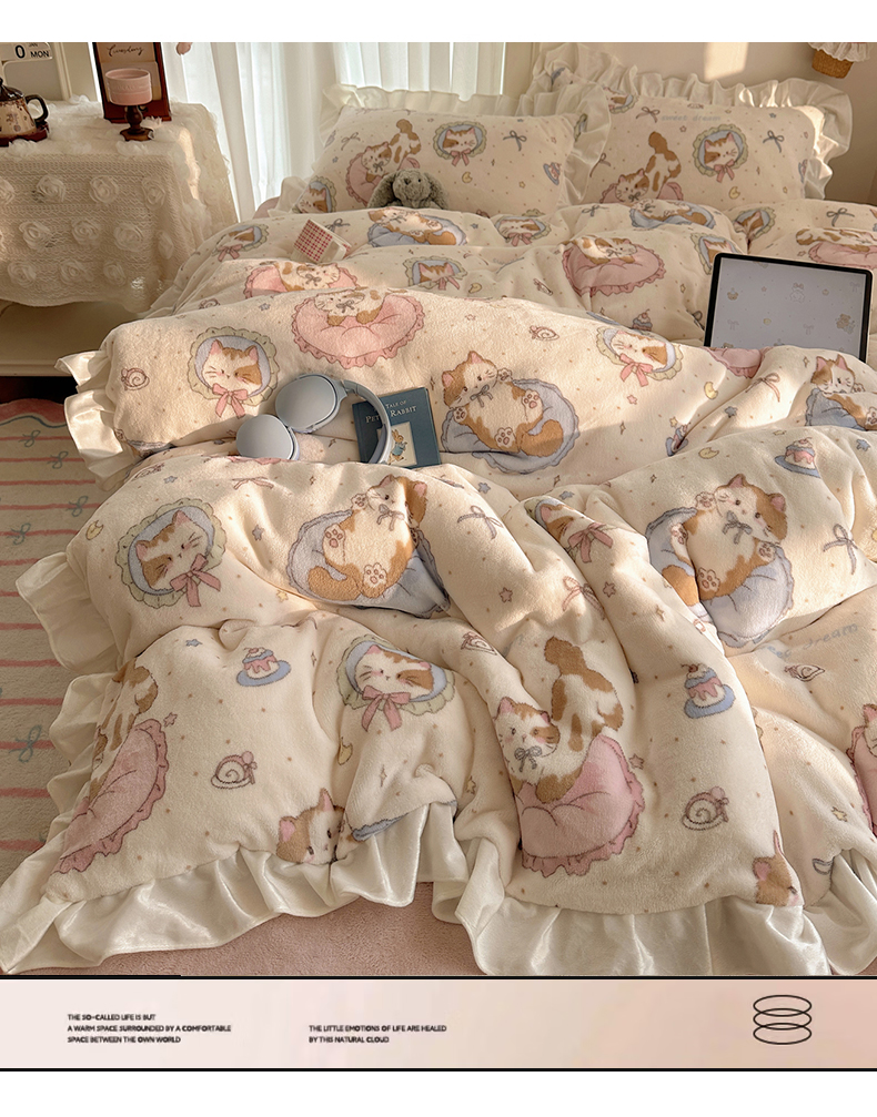 萝莉家纺 2025秋冬新品韩版花边款加厚牛奶绒四件套 猫狗