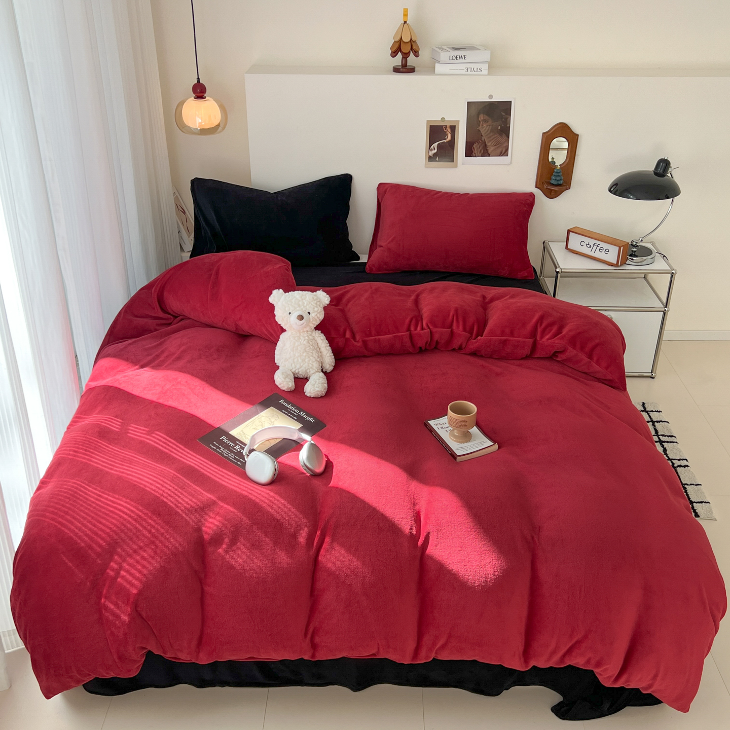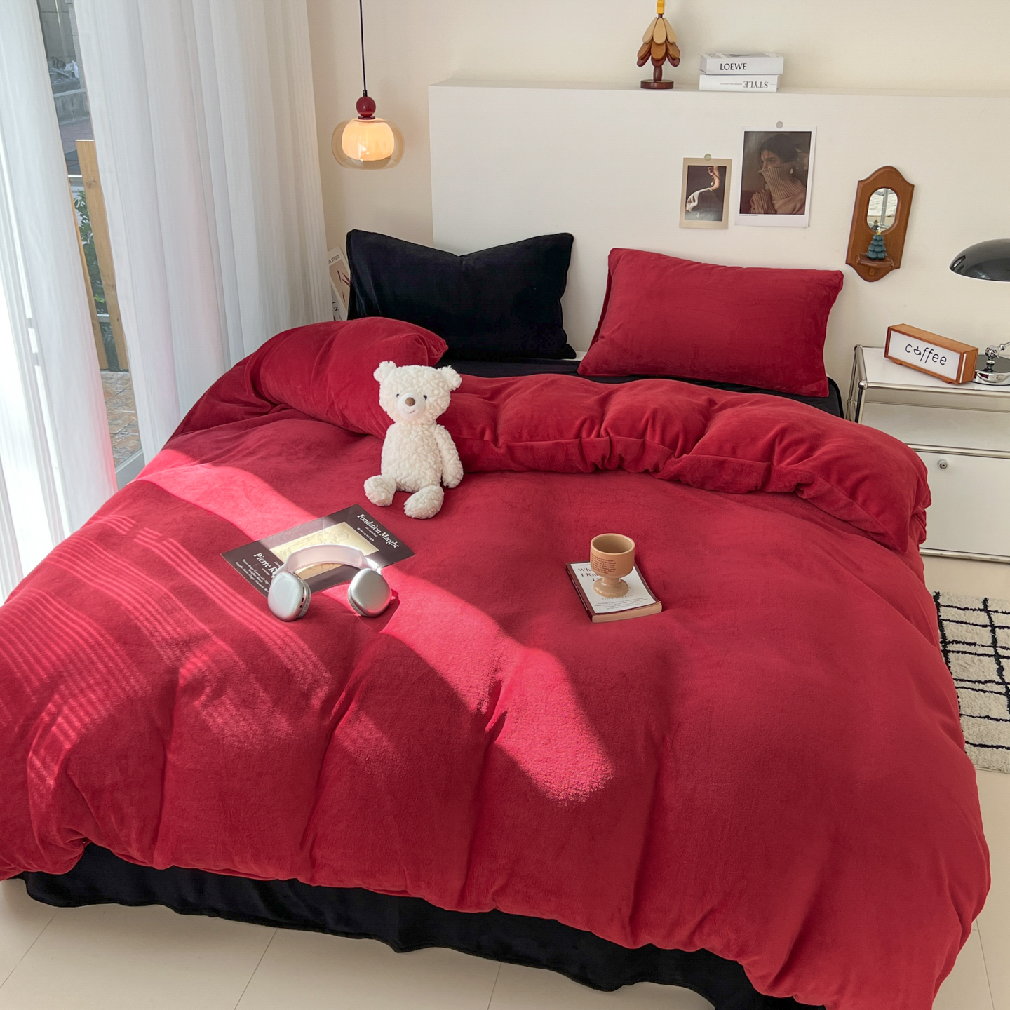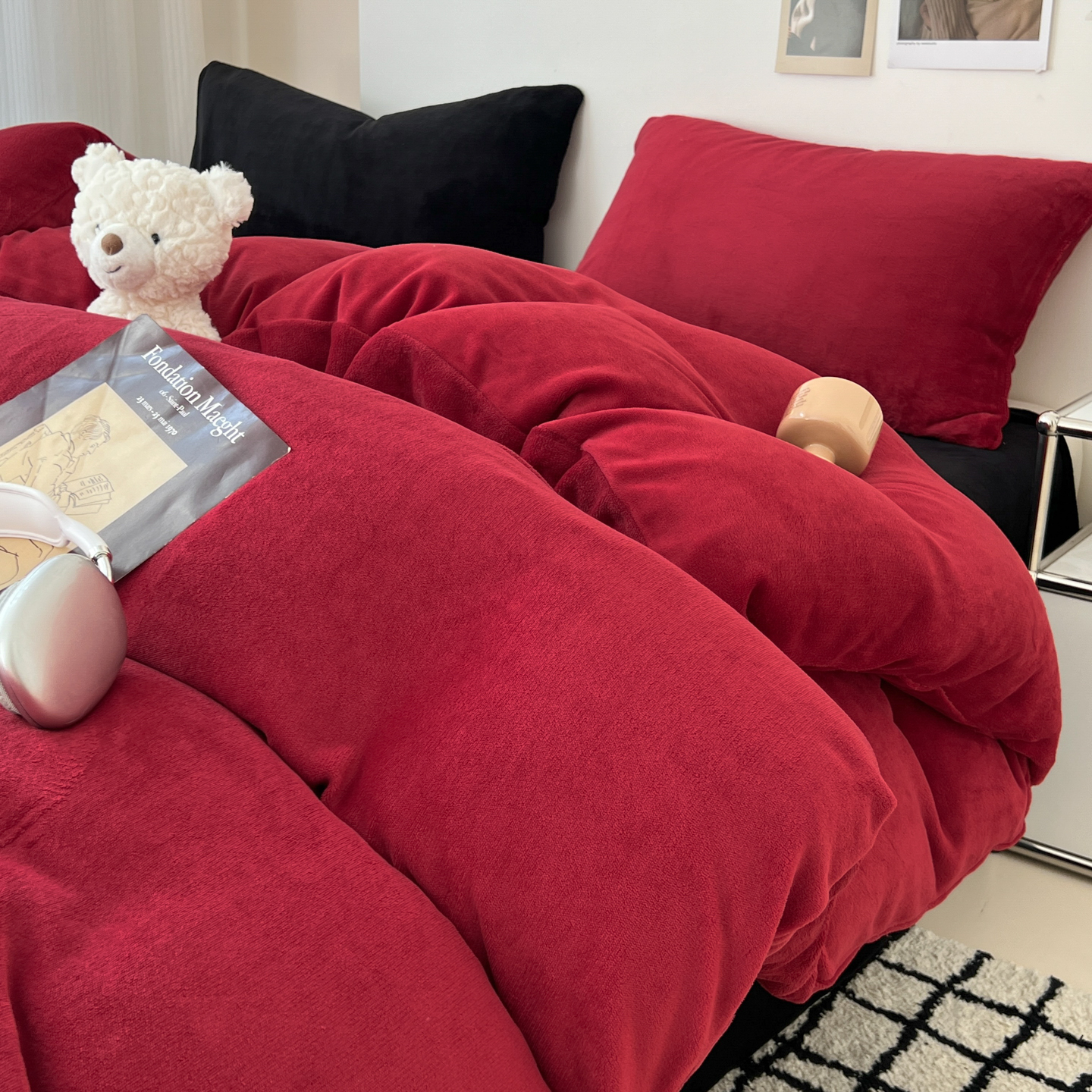 当前位置: 91家纺网 > 商品网购 > 床品套件 > 四件套 > 牛奶绒四件套 > 童颜 2025新款高克重拼色保暖牛奶绒四件套-场景二 酒红黑