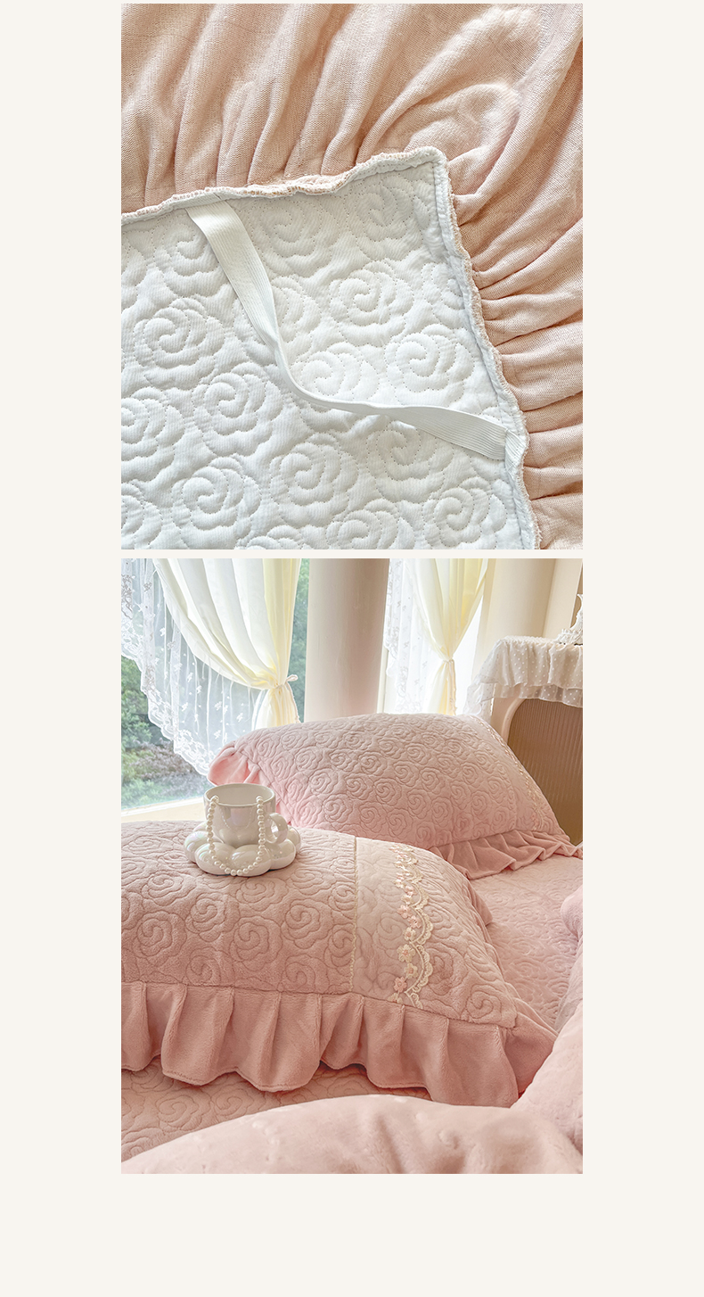 (总)瑞宝 2025新款雕花牛奶绒花边夹棉床盖四件套-莫妮卡,奶昔白,抹茶绿,奶茶咖,少女粉,雾蓝