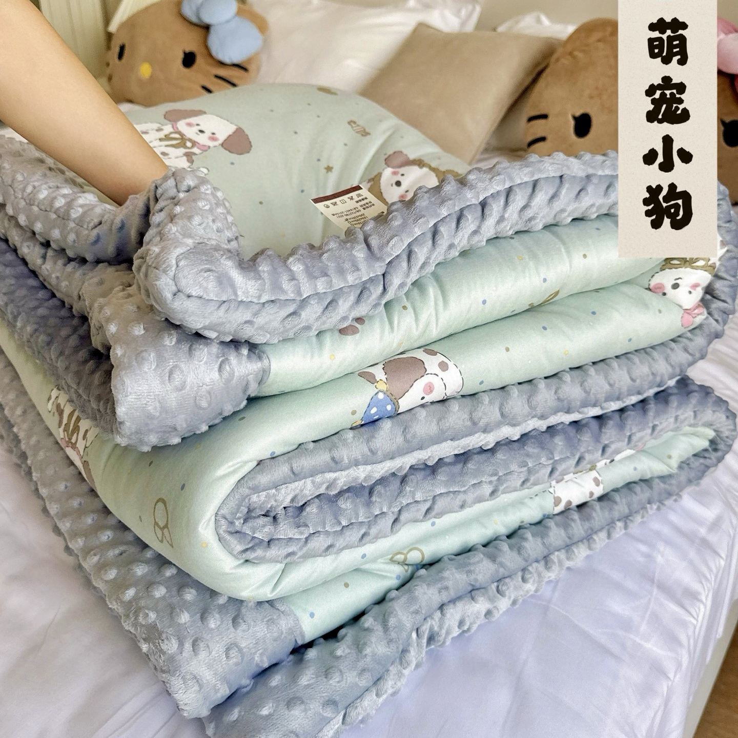 (总)兜米家居 2025新品秋冬母婴针织豆豆绒被纯手工包边卡通立体豆豆绒保暖被子被芯,滑板恐龙,巴拉小熊,花海,花花兔,花小象,幻境,可爱兔子,拉兔兔,兰花小狮子,萌宠小狗,喵喵,小碎花