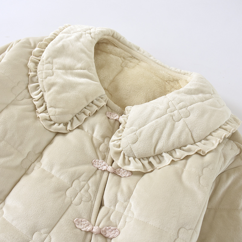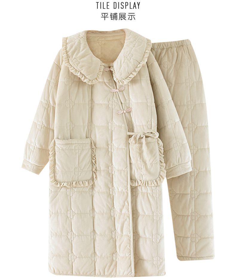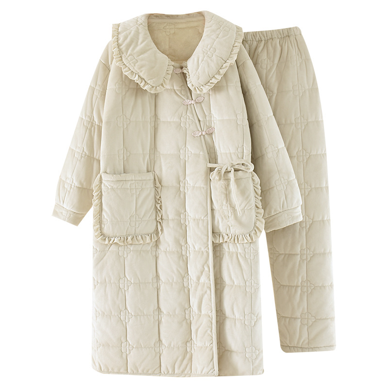 洛兰沙家居馆 2025新款只代发娃娃领睡衣女冬季珊瑚绒三层夹棉加厚中长款睡袍加裤子家居服套装 米色