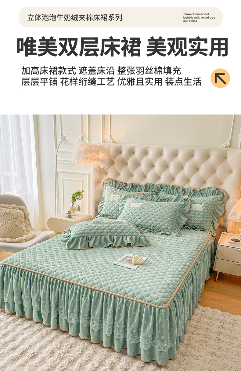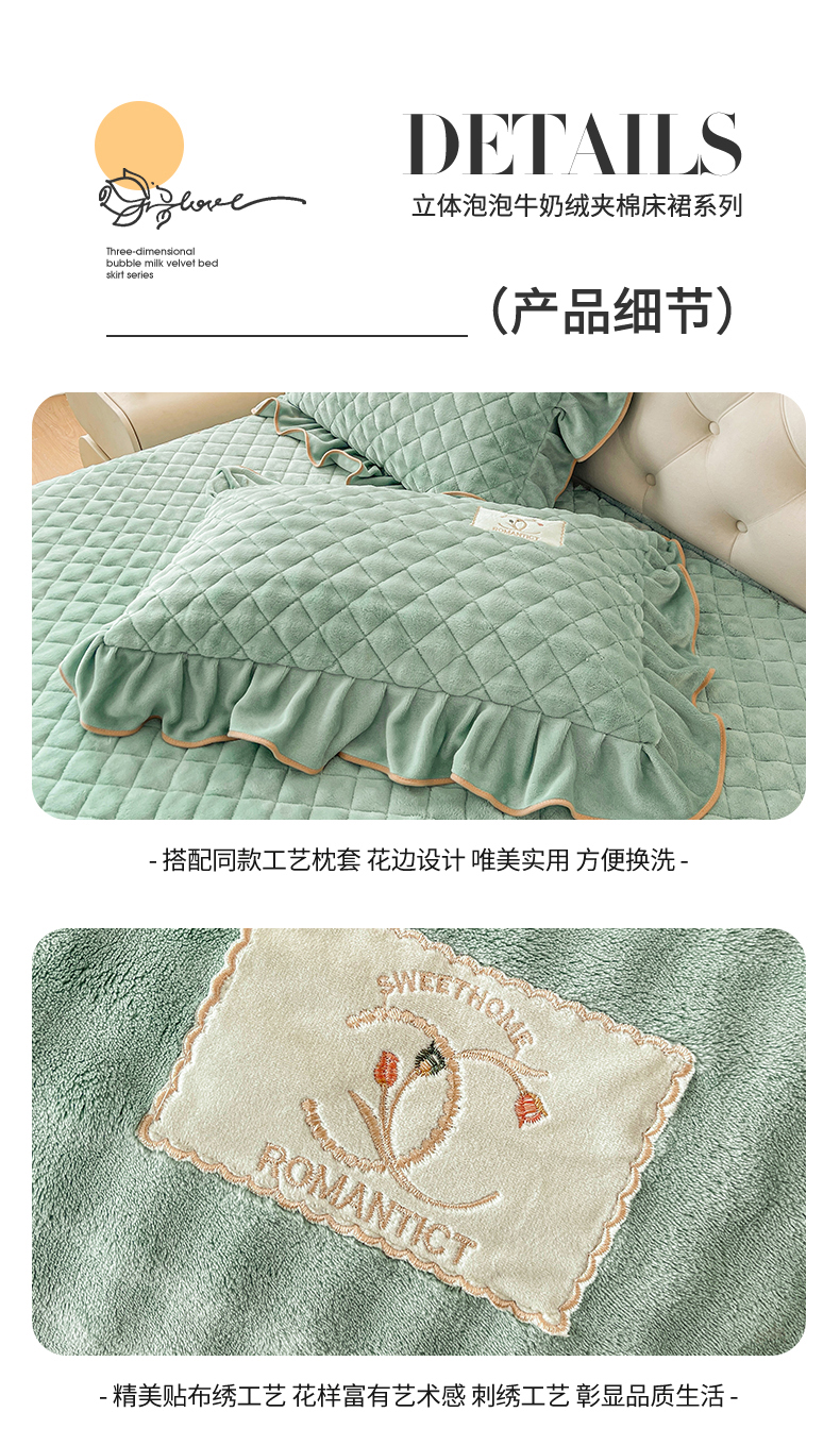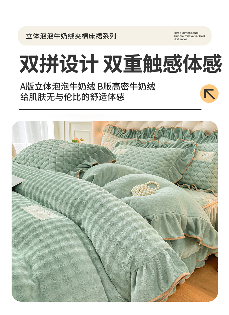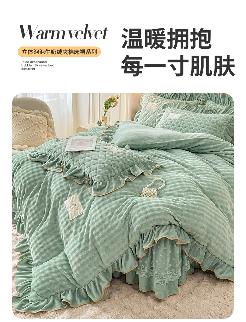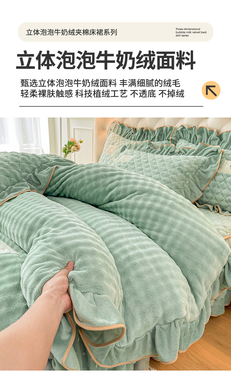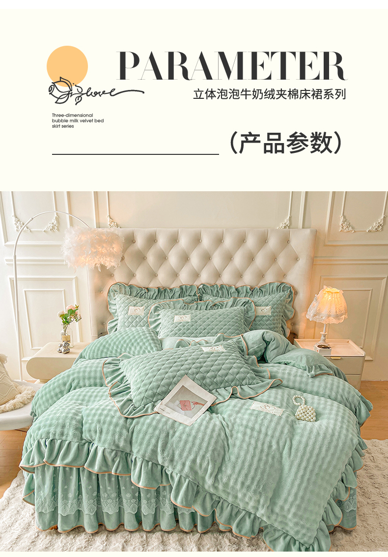 当前位置: 91家纺网 > 商品网购 > 床品套件 > 四件套 > 牛奶绒四件套 > 情恒家纺 2025新款立体泡泡牛奶绒夹棉床裙四件套系列-浅语光年 浅语光年-水绿