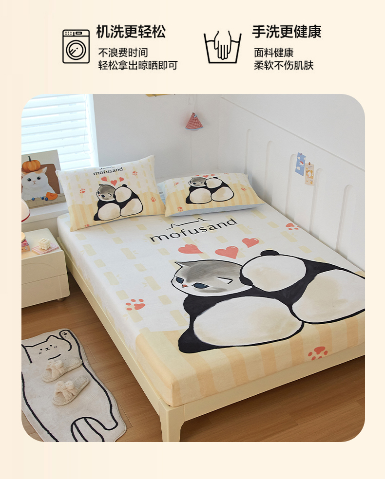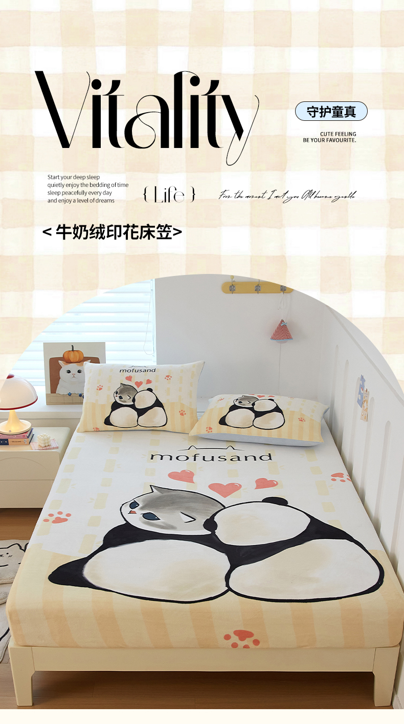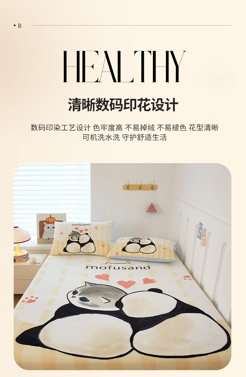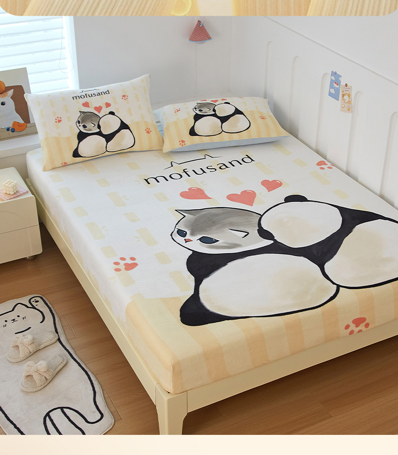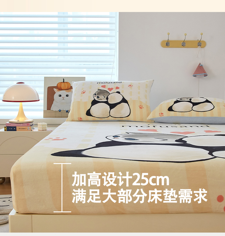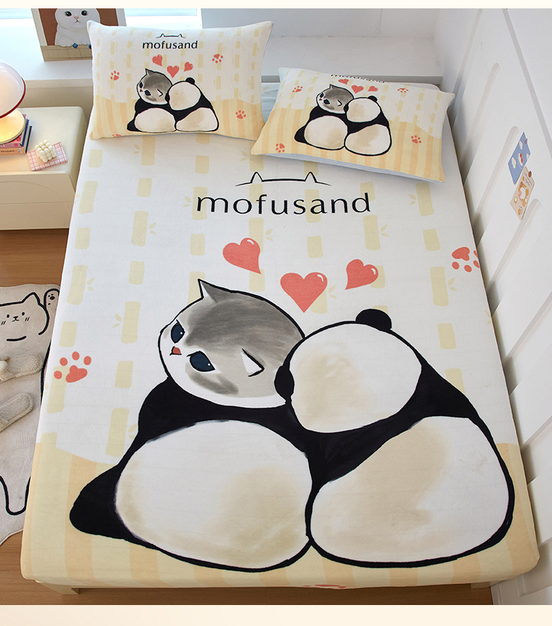 蘭菲家纺 2025新款高克重牛奶绒正版鲨鱼猫系列单品床笠 珊迪熊-猫福