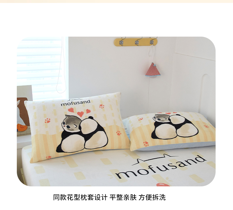 商品名称:蘭菲家纺 2025新款高克重牛奶绒正版鲨鱼猫系列单品床笠 珊迪熊-猫福