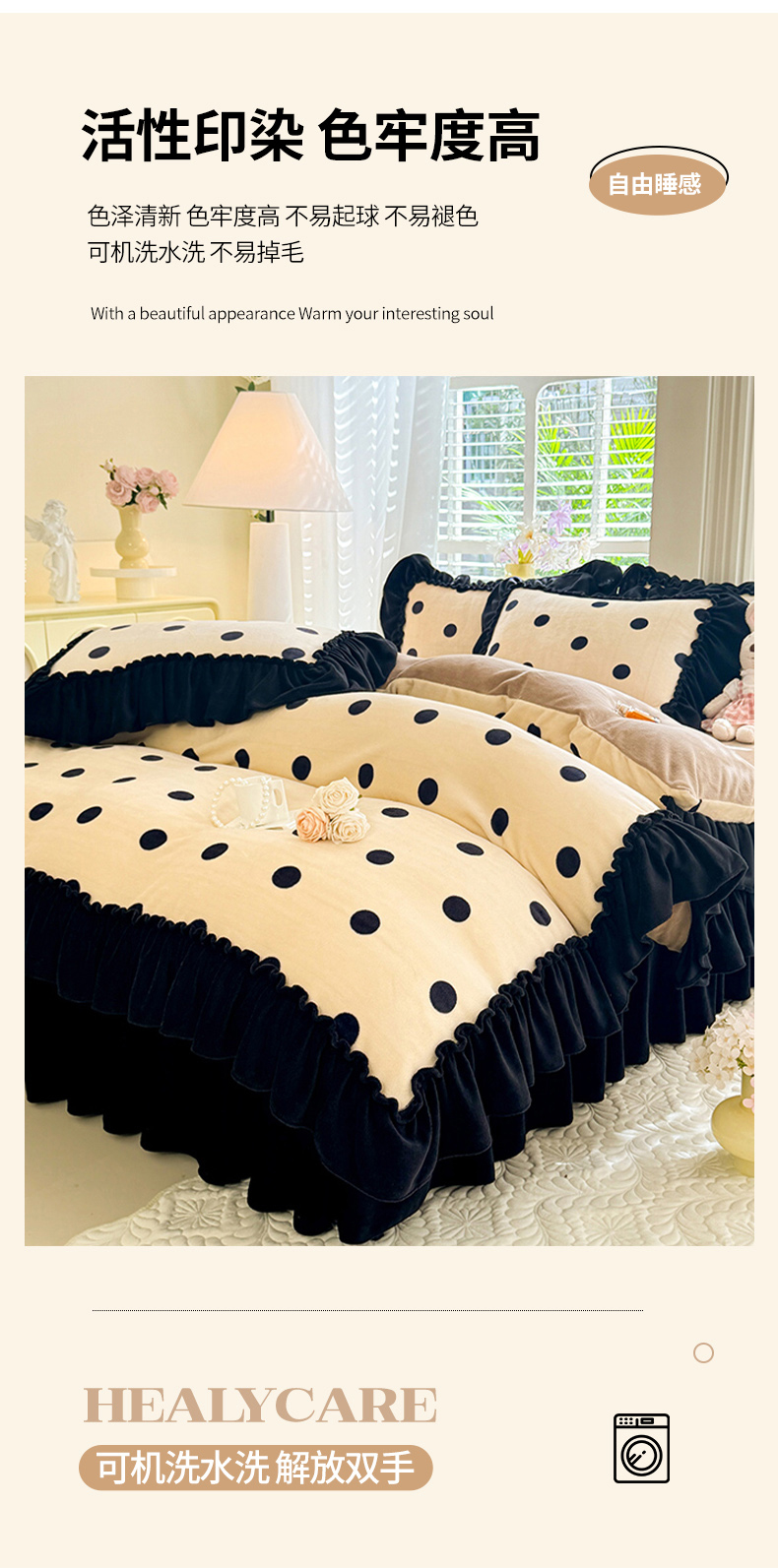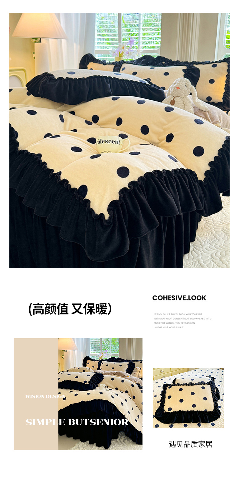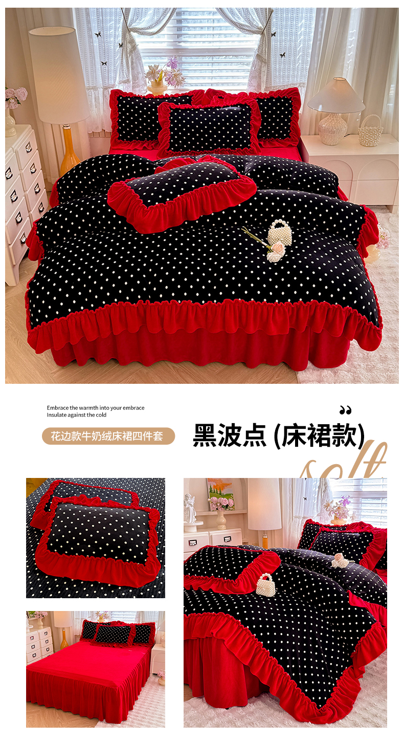 当前位置: 91家纺网 > 商品网购 > 床品套件 > 四件套 > 牛奶绒四件套 > 韩约家纺 2025新款法式大花边印花牛奶绒床裙(床单)四件套 波点(床裙款)
