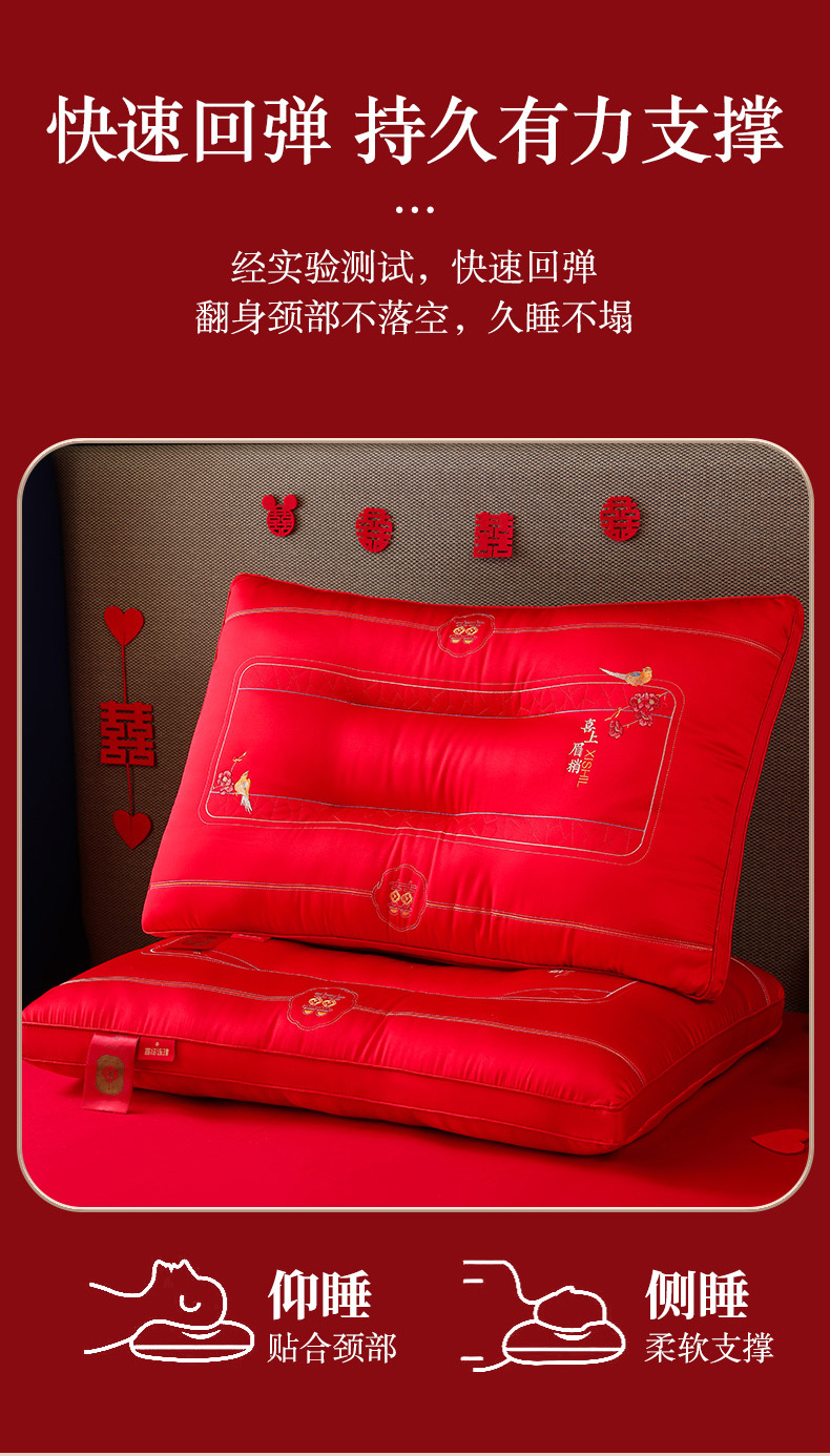 织布人 2025新款枕芯全棉刺绣大红喜事婚庆送礼结婚专用护颈定型枕头枕芯 组合图