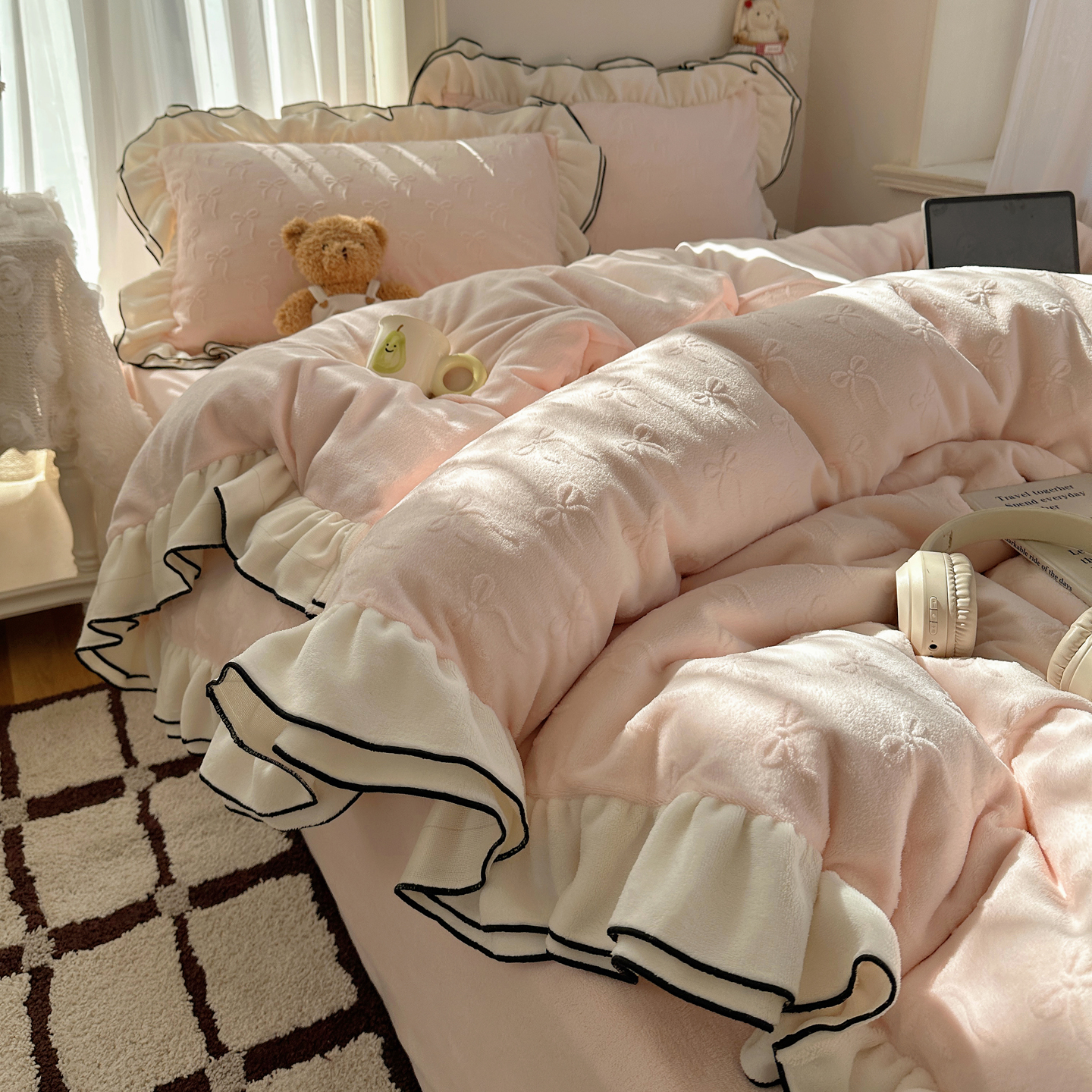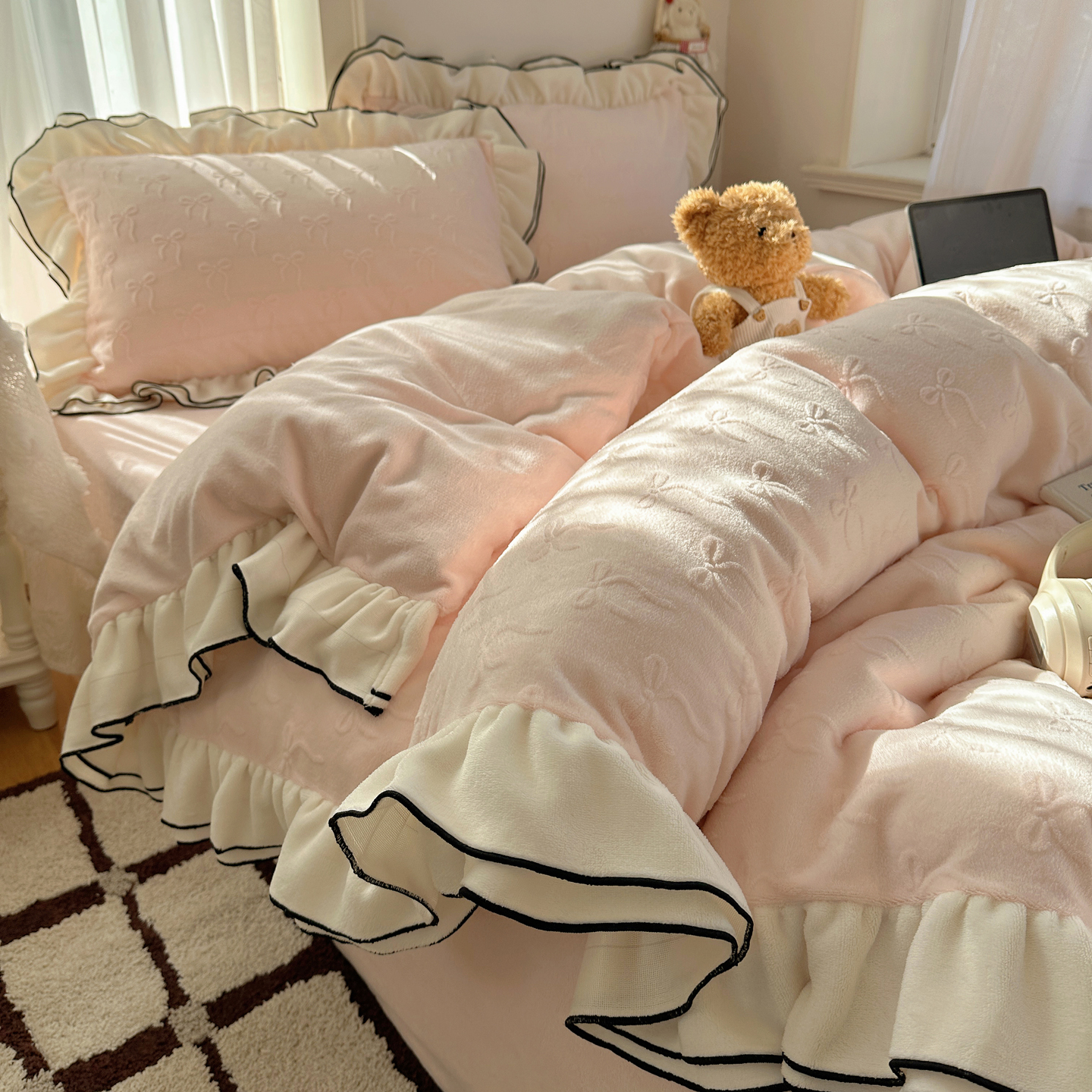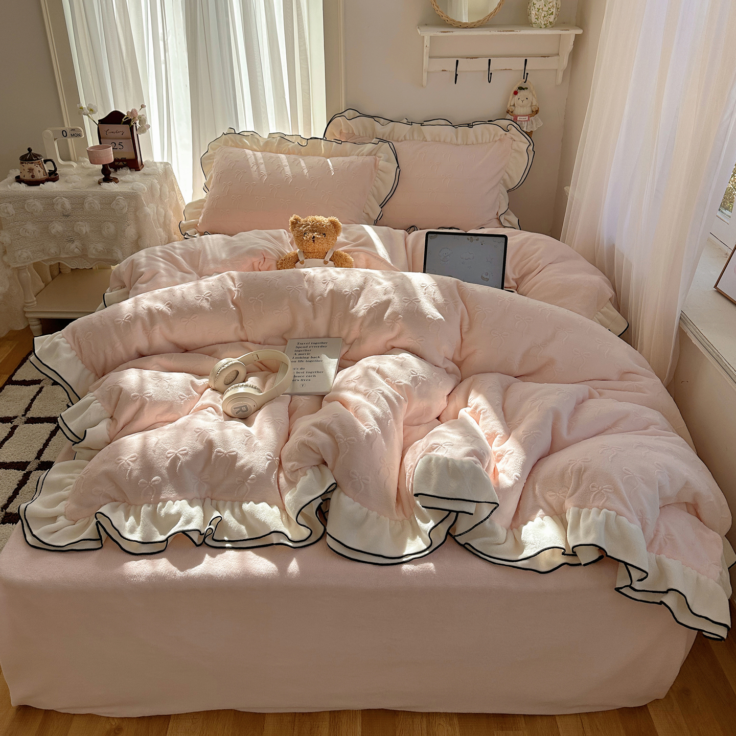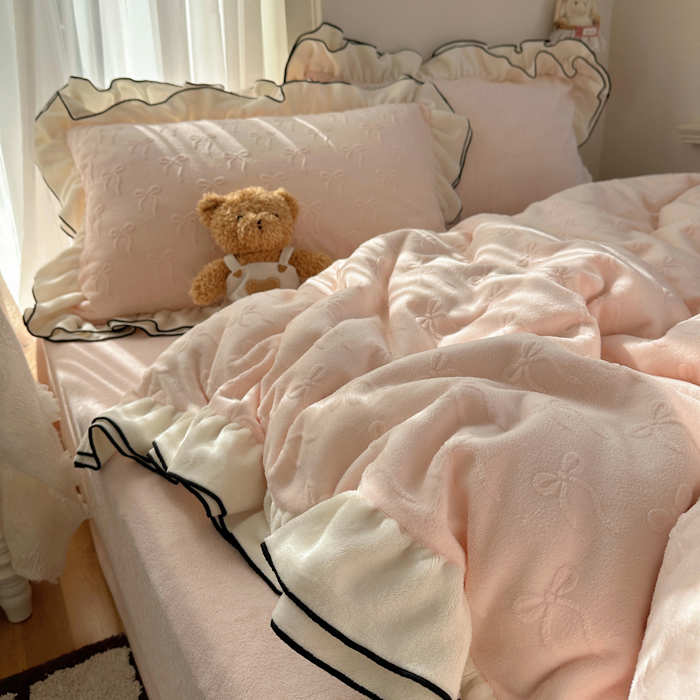 商品名称:觅糖家纺 2025雕花绒荷叶边温柔蝴蝶结系列四件套 温柔蝴蝶结-裸粉