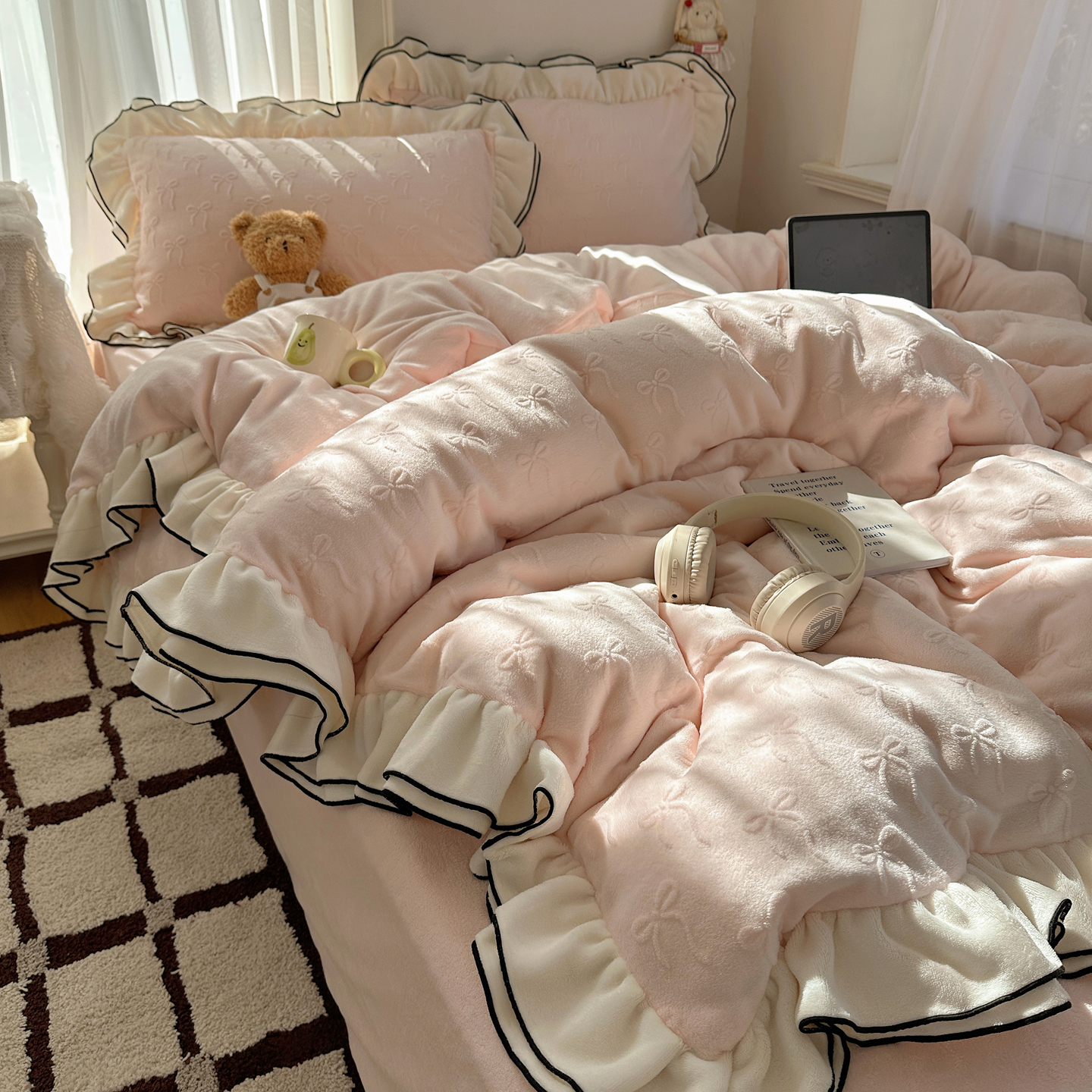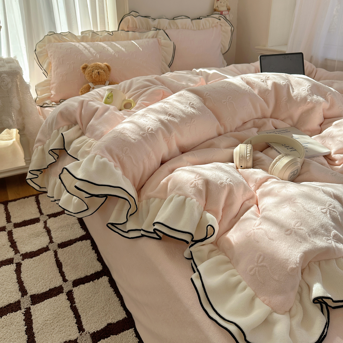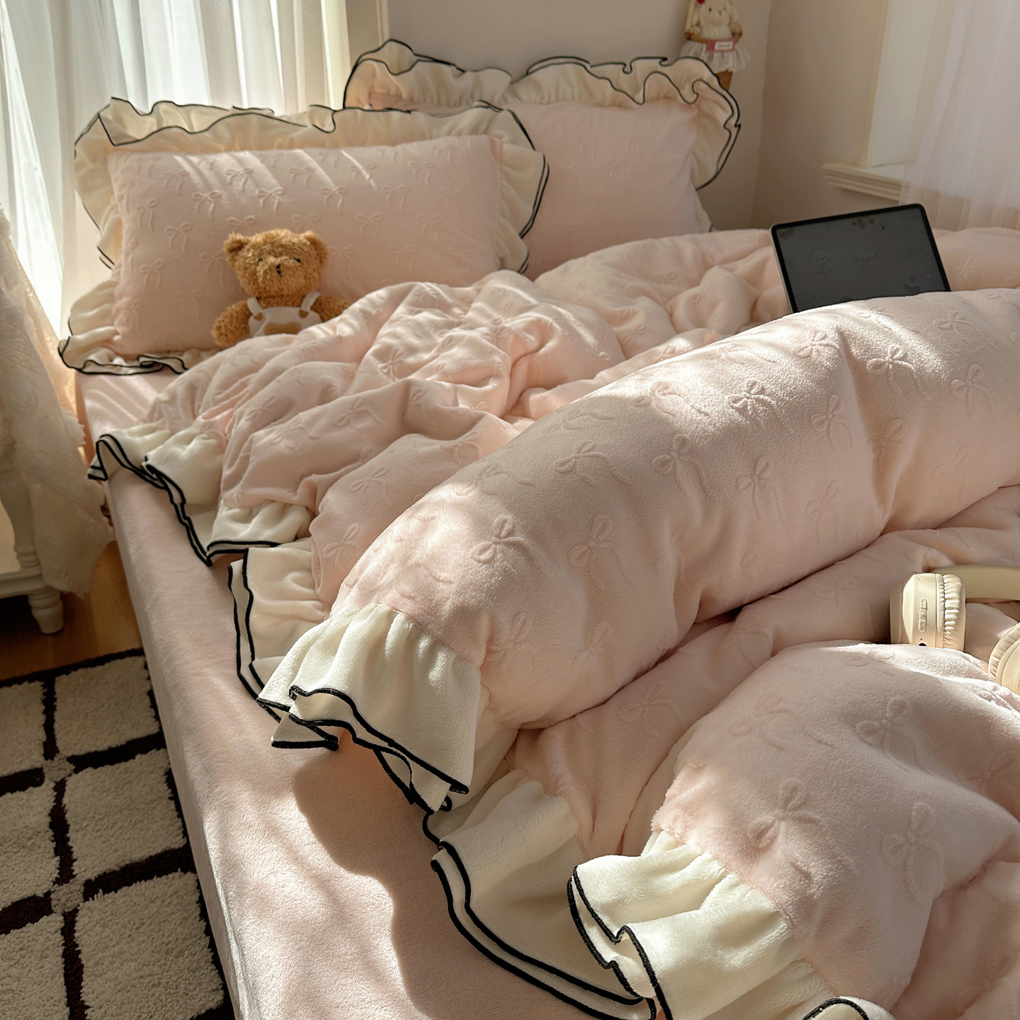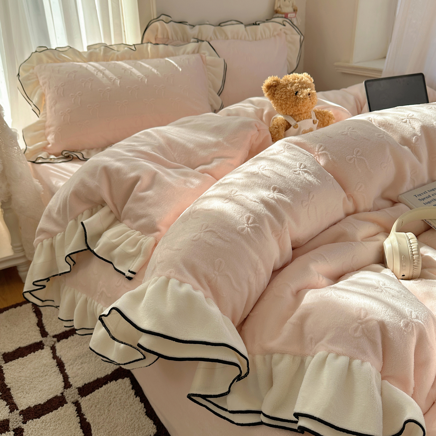 商品名称:觅糖家纺 2025雕花绒荷叶边温柔蝴蝶结系列四件套 温柔蝴蝶结-裸粉