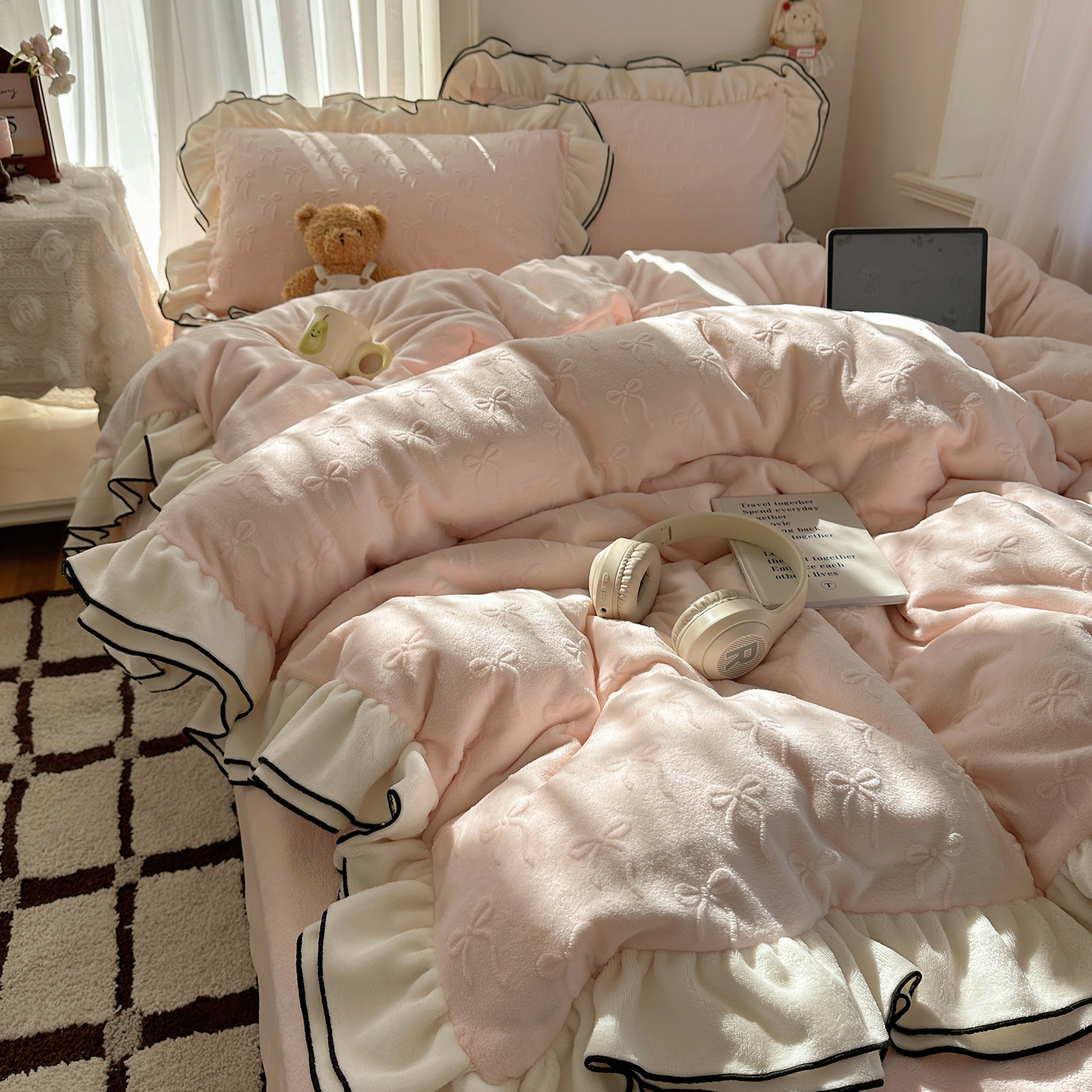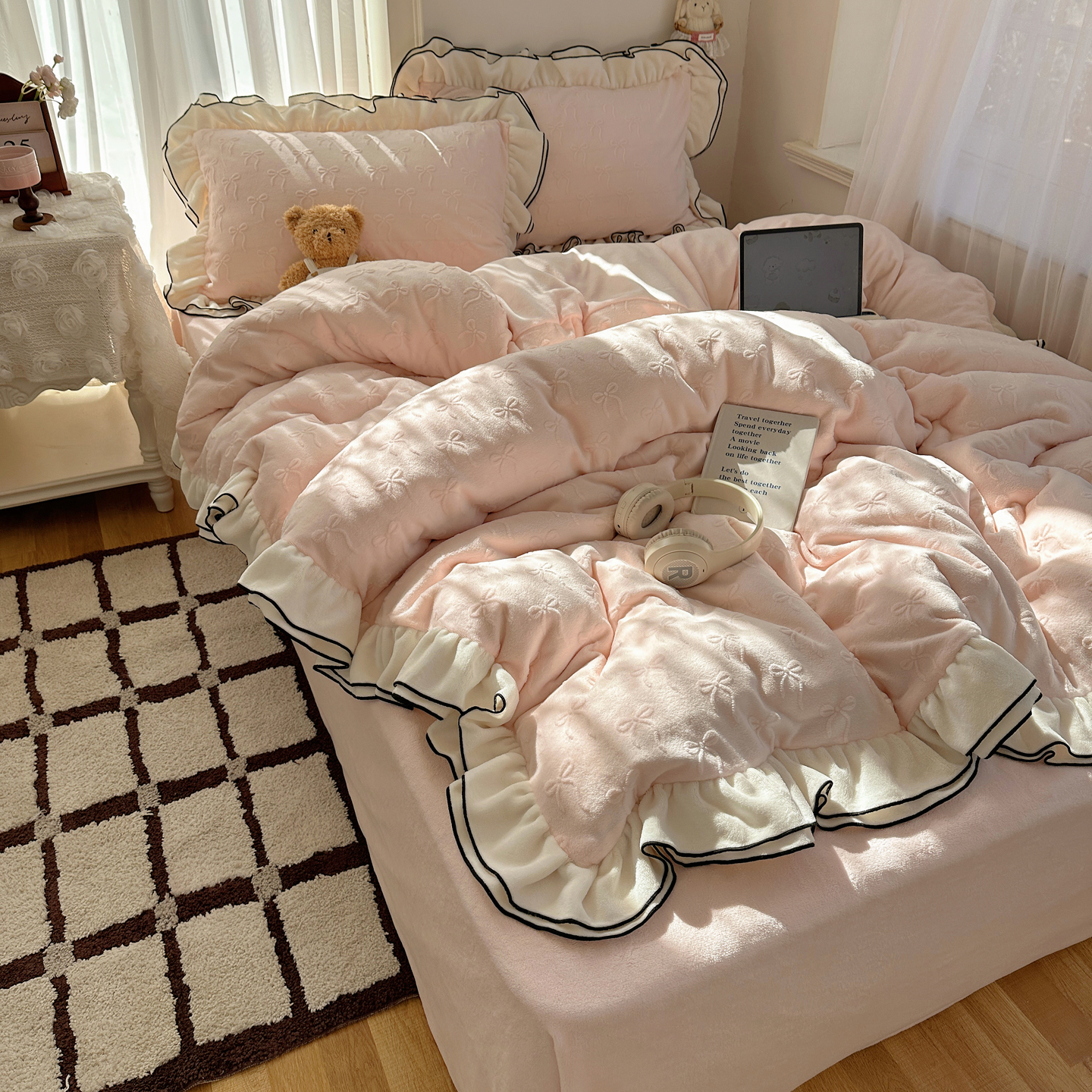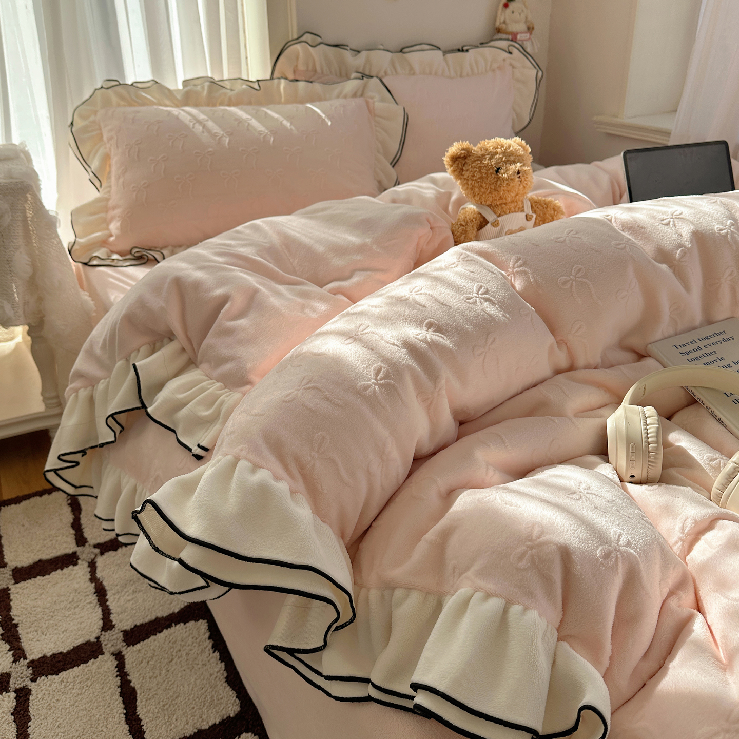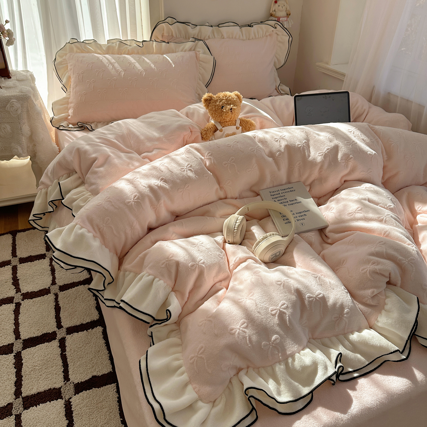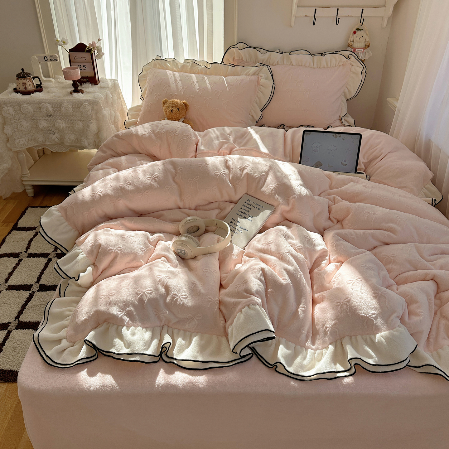 商品名称:觅糖家纺 2025雕花绒荷叶边温柔蝴蝶结系列四件套 温柔蝴蝶结-裸粉