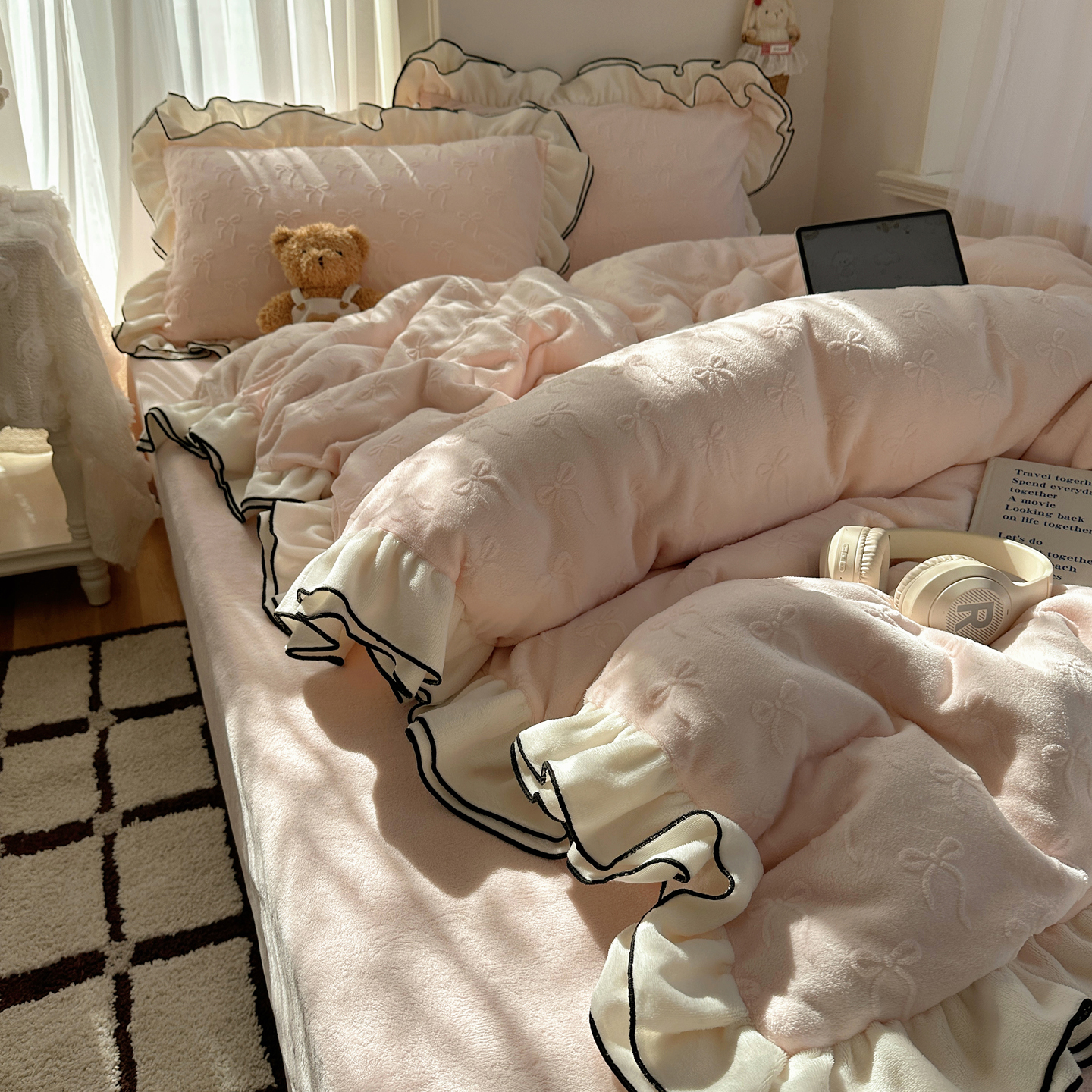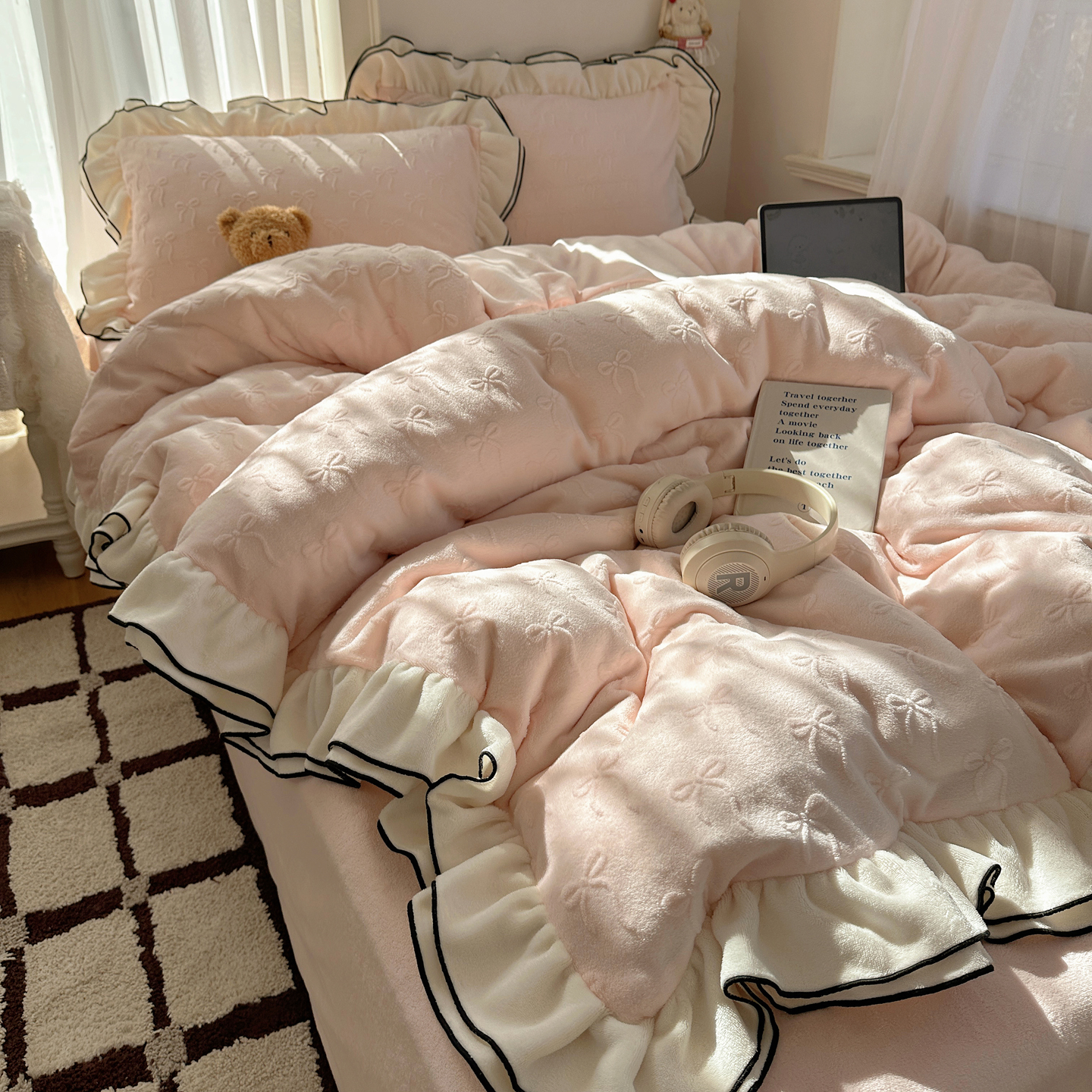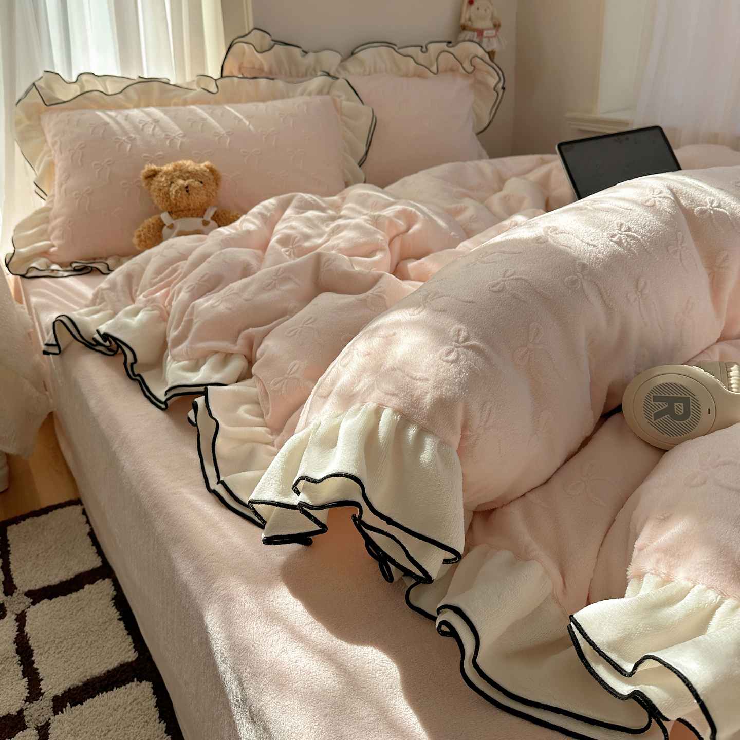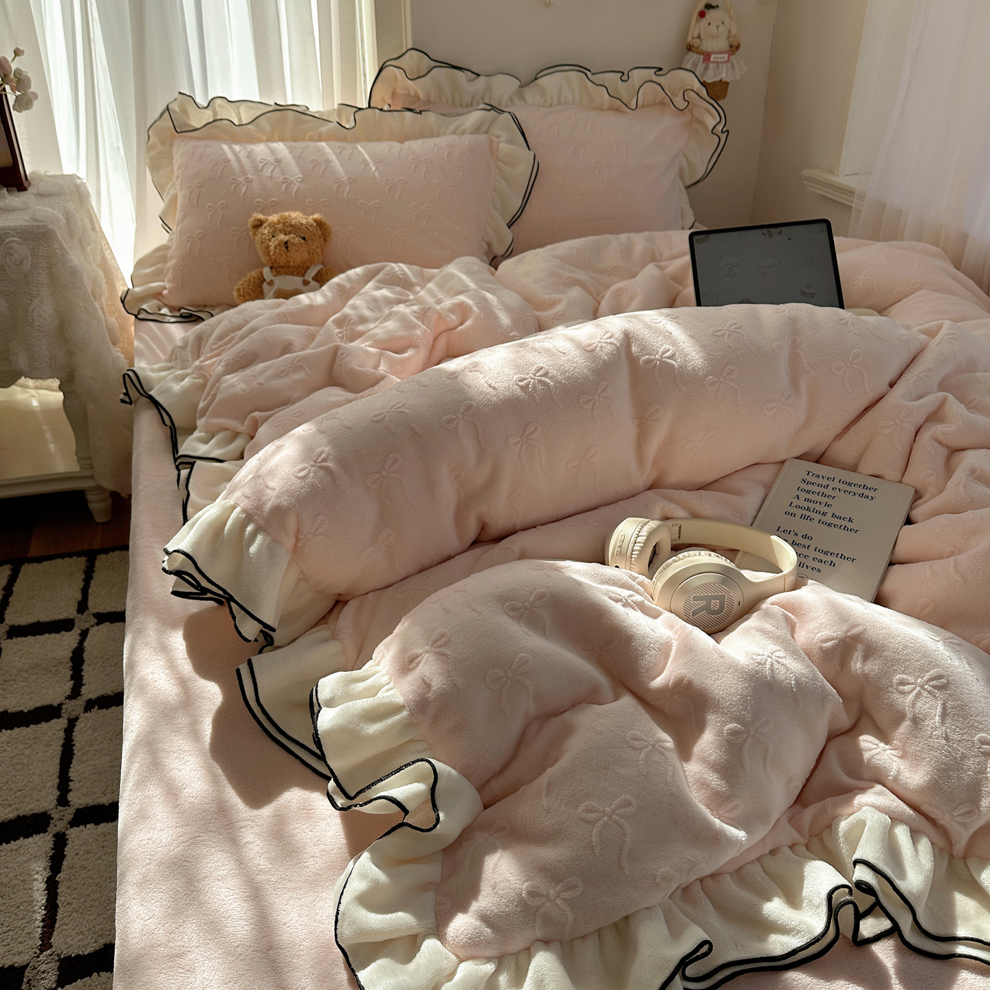 商品名称:觅糖家纺 2025雕花绒荷叶边温柔蝴蝶结系列四件套 温柔蝴蝶结-裸粉