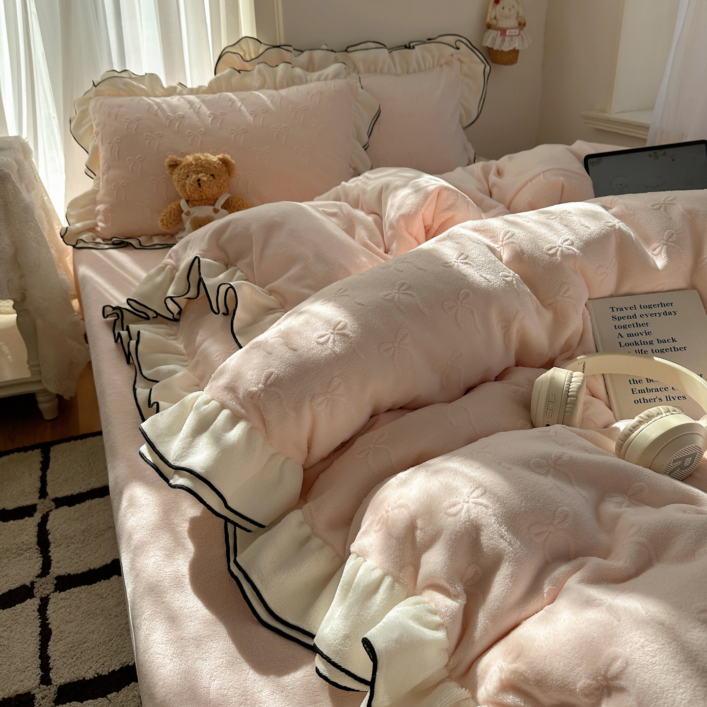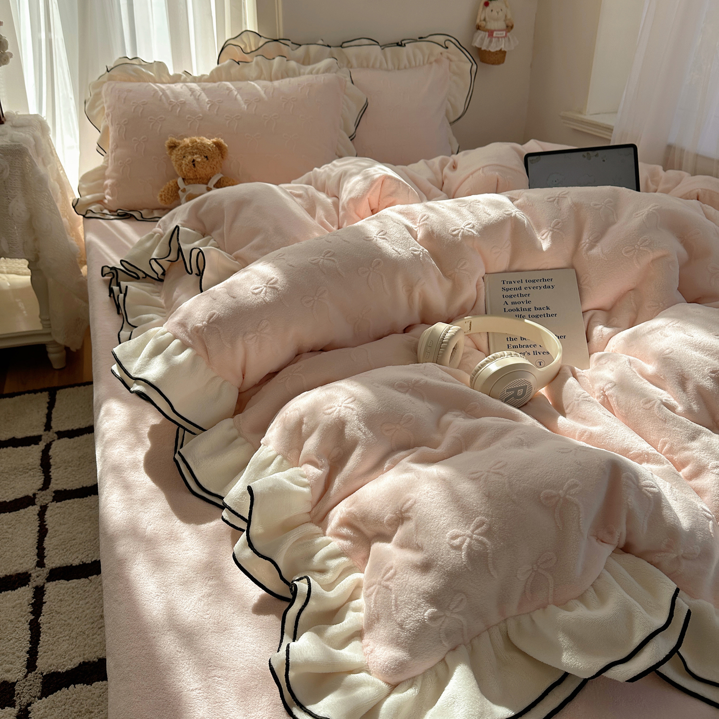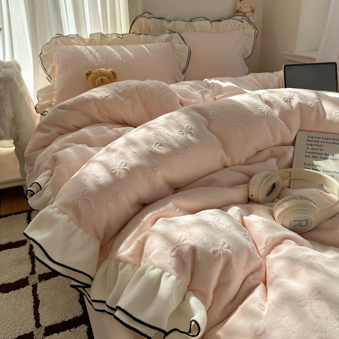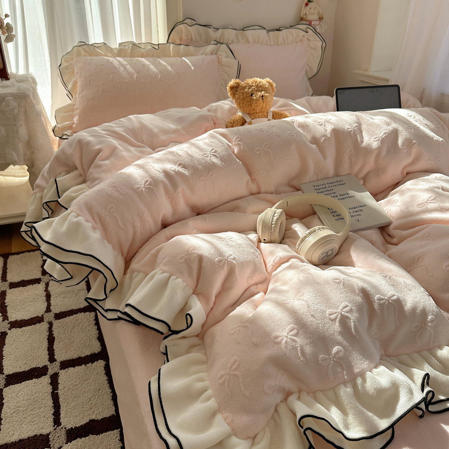 商品名称:觅糖家纺 2025雕花绒荷叶边温柔蝴蝶结系列四件套 温柔蝴蝶结-裸粉