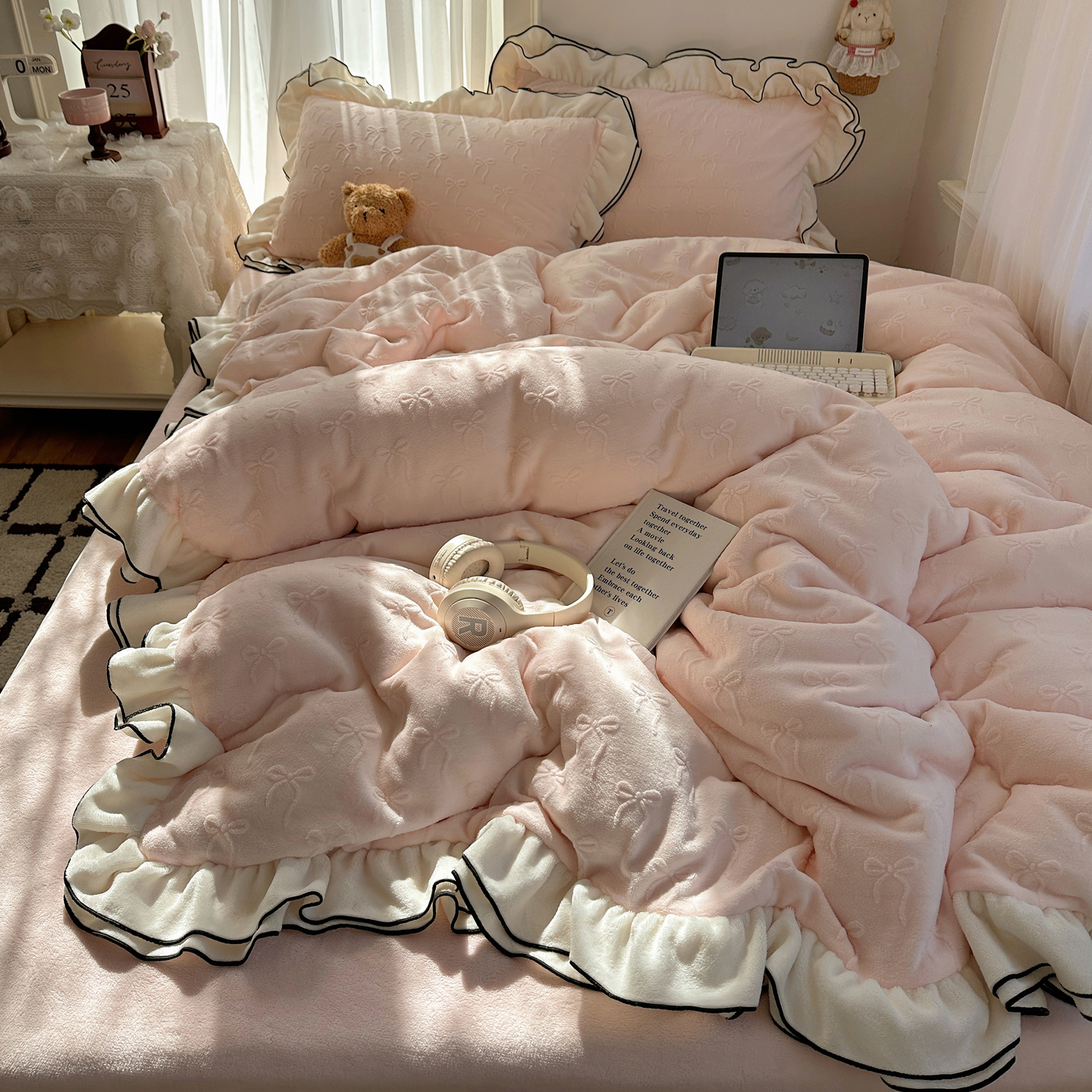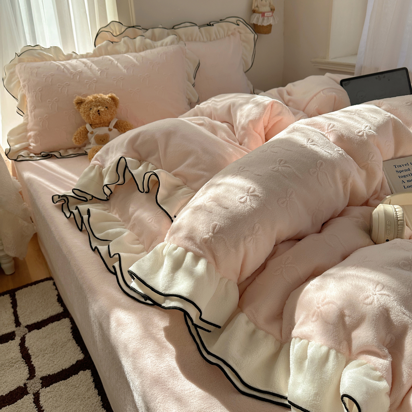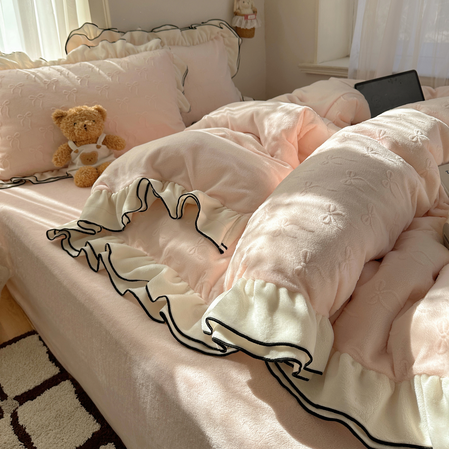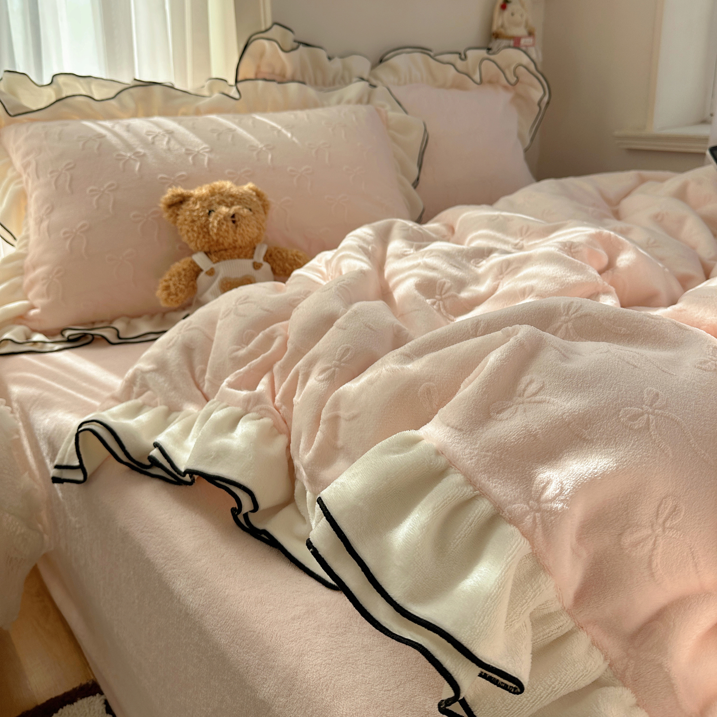 觅糖家纺 2025雕花绒荷叶边温柔蝴蝶结系列四件套 温柔蝴蝶结-裸粉