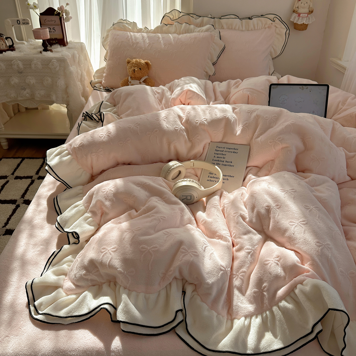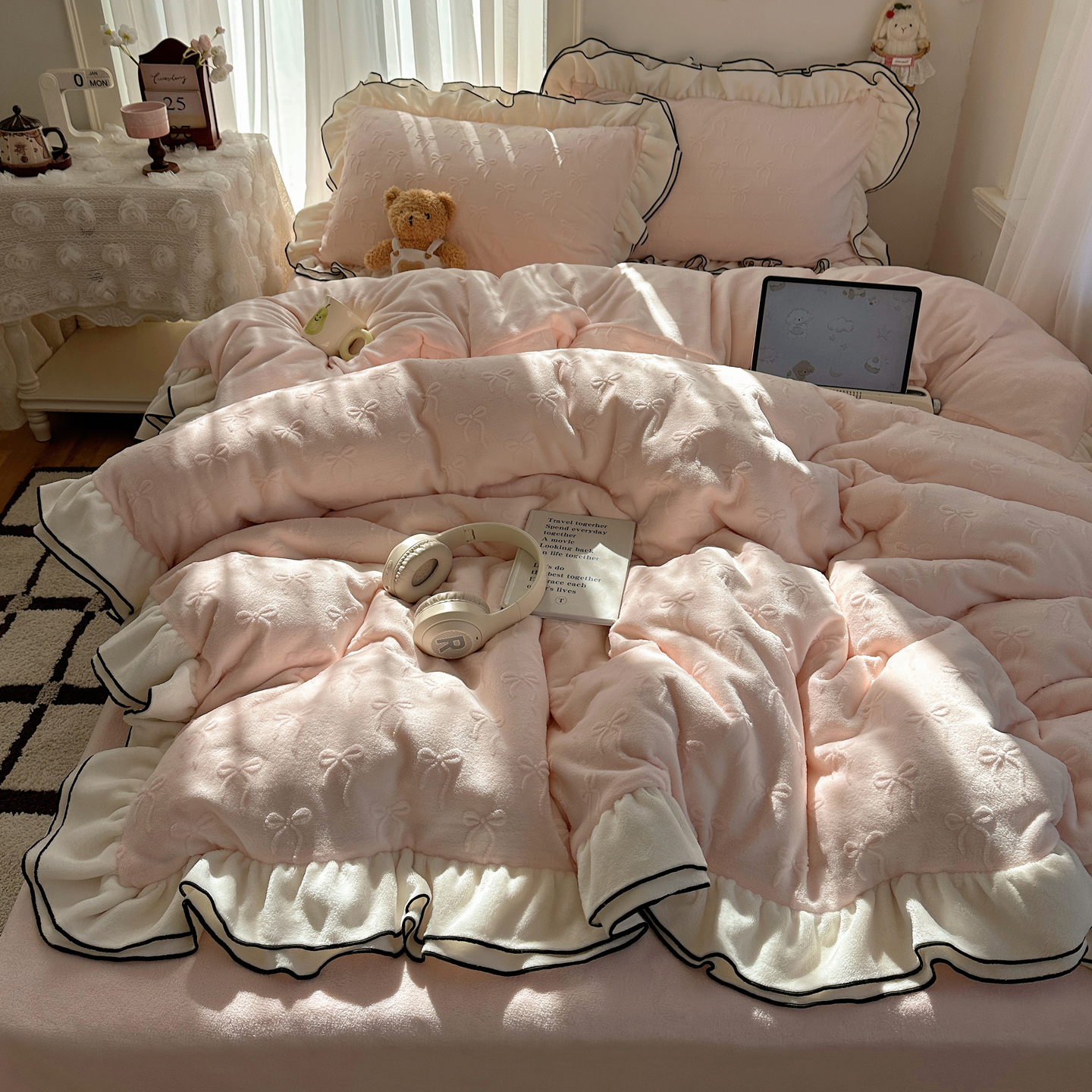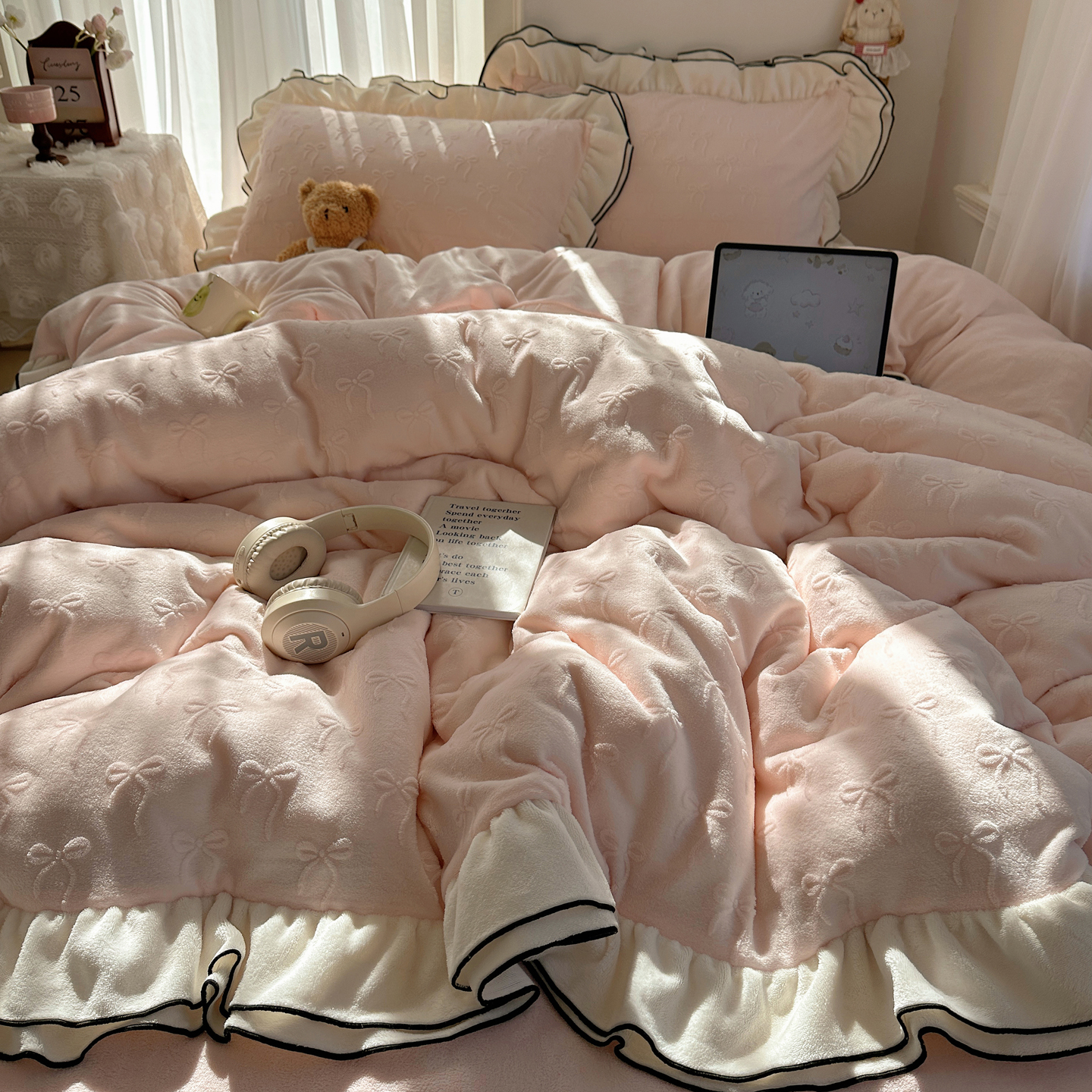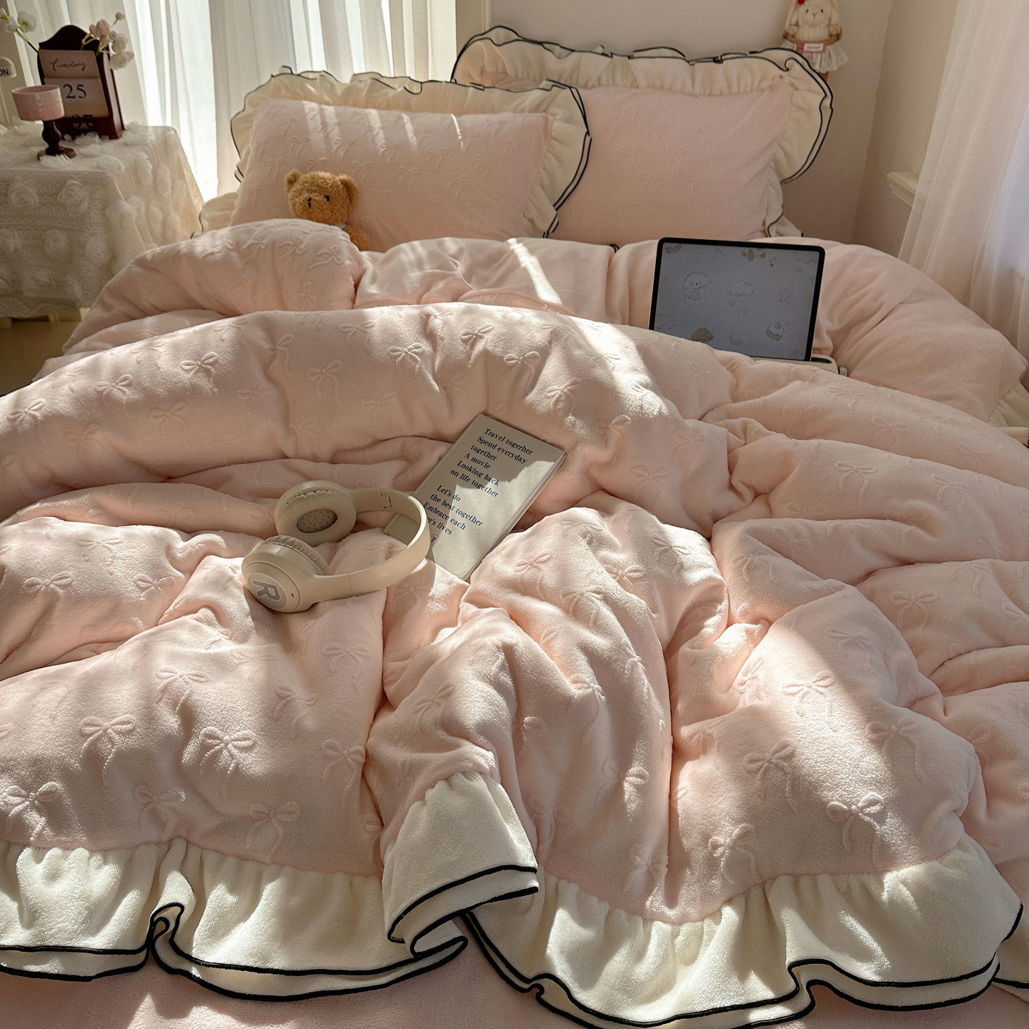 觅糖家纺 2025雕花绒荷叶边温柔蝴蝶结系列四件套 温柔蝴蝶结-裸粉