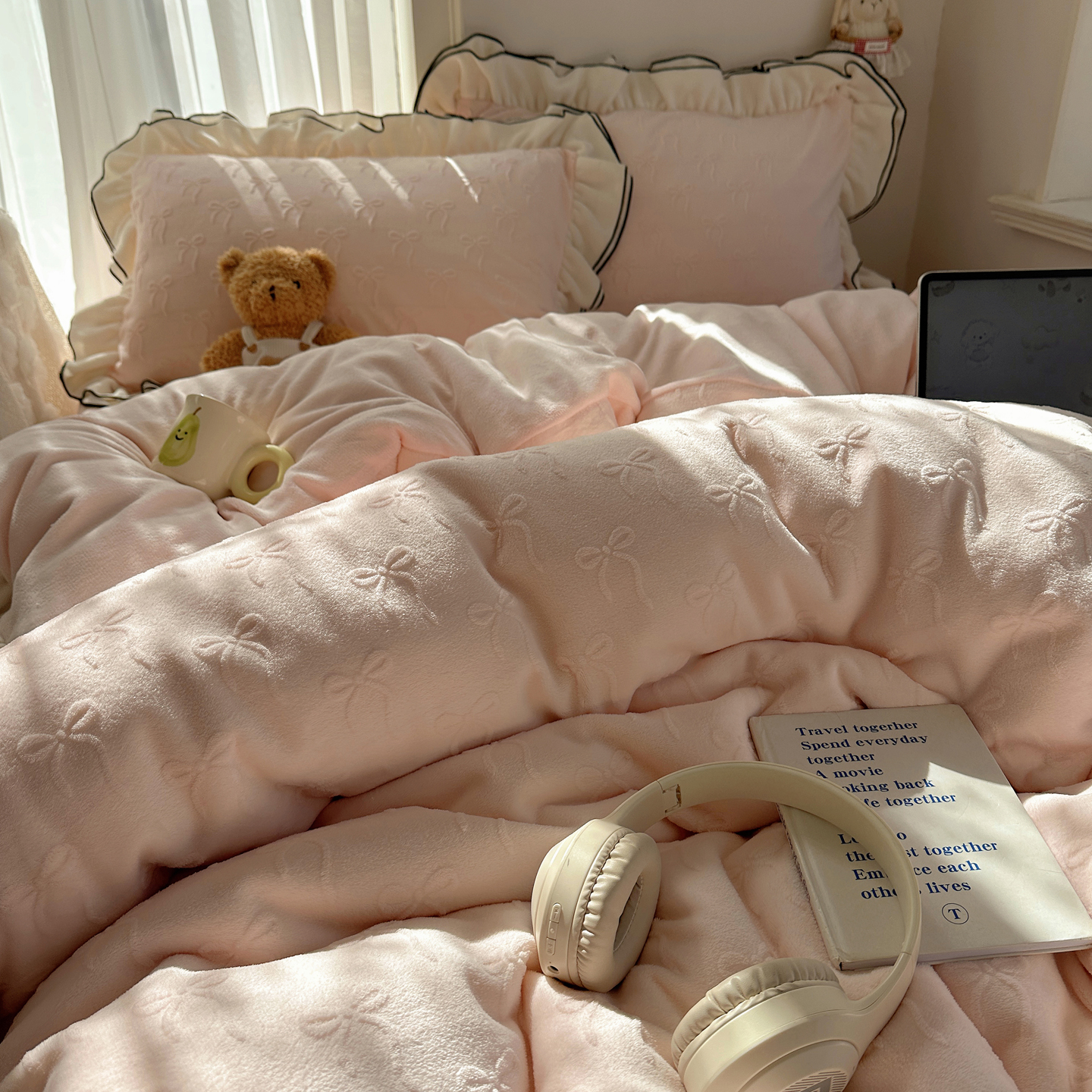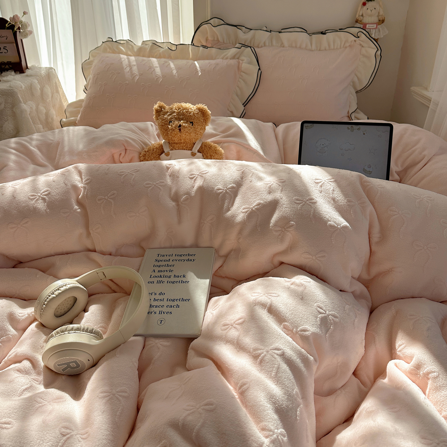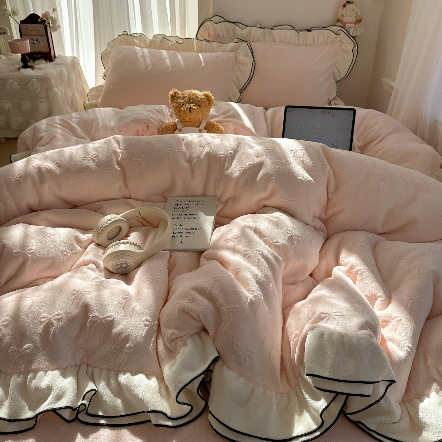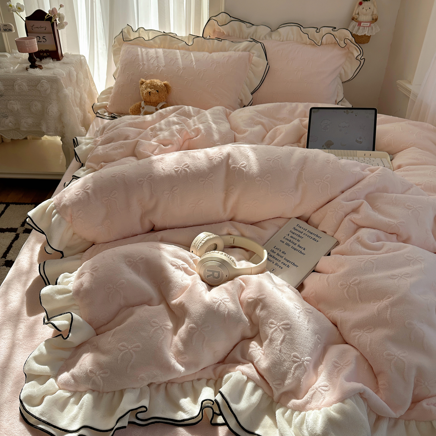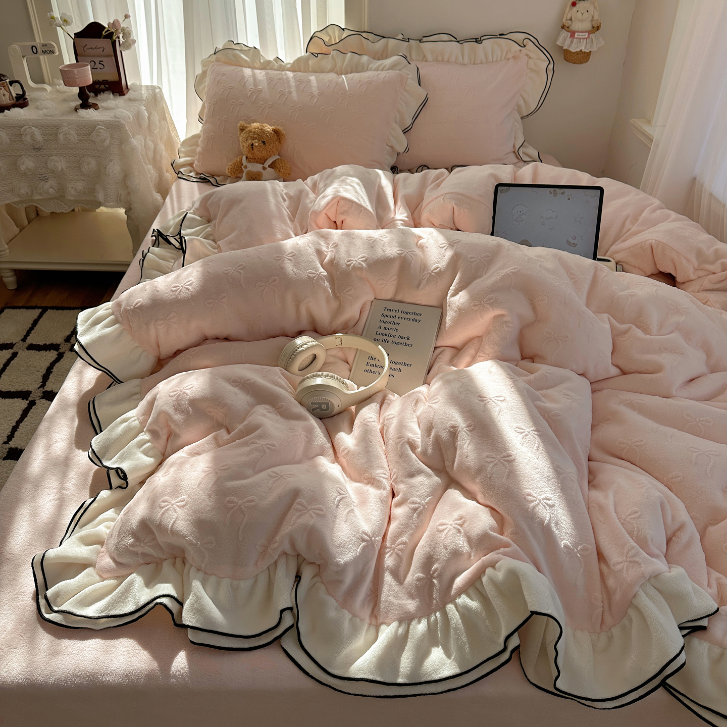 觅糖家纺 2025雕花绒荷叶边温柔蝴蝶结系列四件套 温柔蝴蝶结-裸粉
