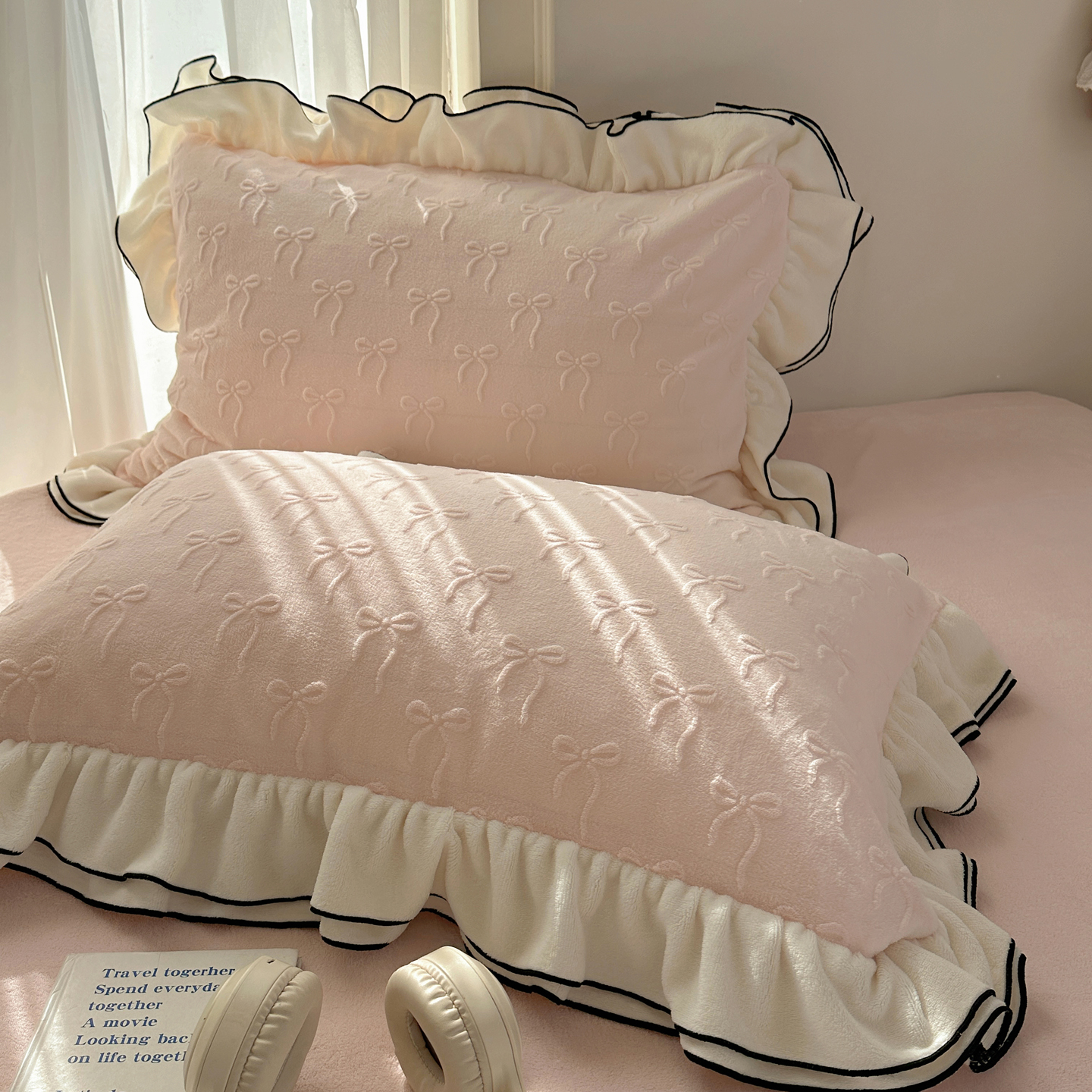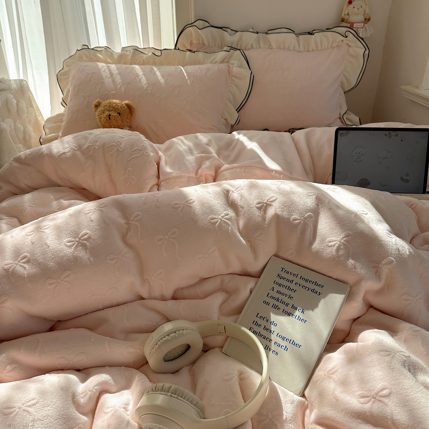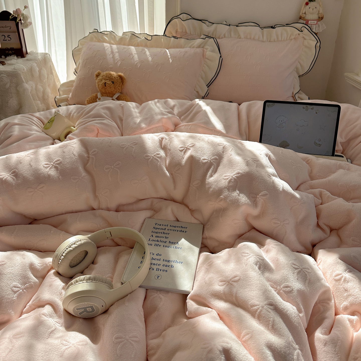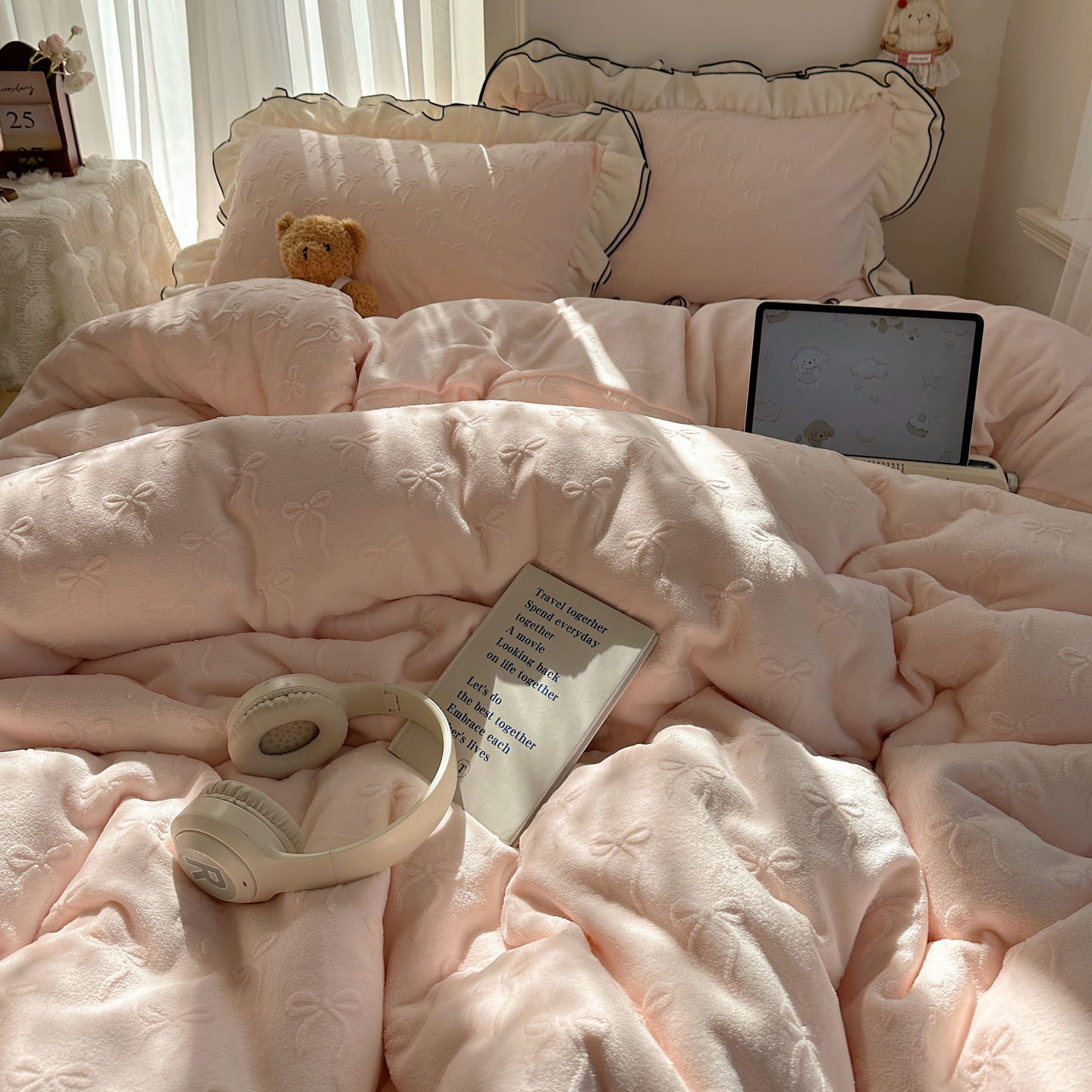觅糖家纺 2025雕花绒荷叶边温柔蝴蝶结系列四件套 温柔蝴蝶结-裸粉