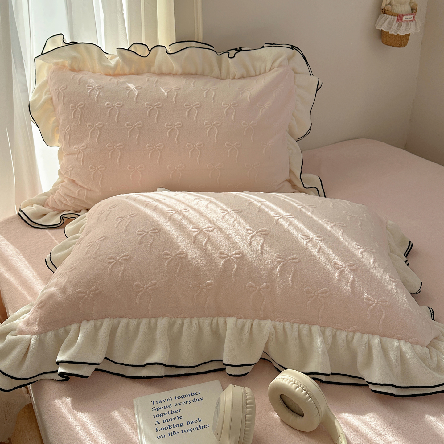(总)觅糖家纺 2025新款牛奶绒荷叶边小小系列四件套,小小爱心白,小小樱桃酱
