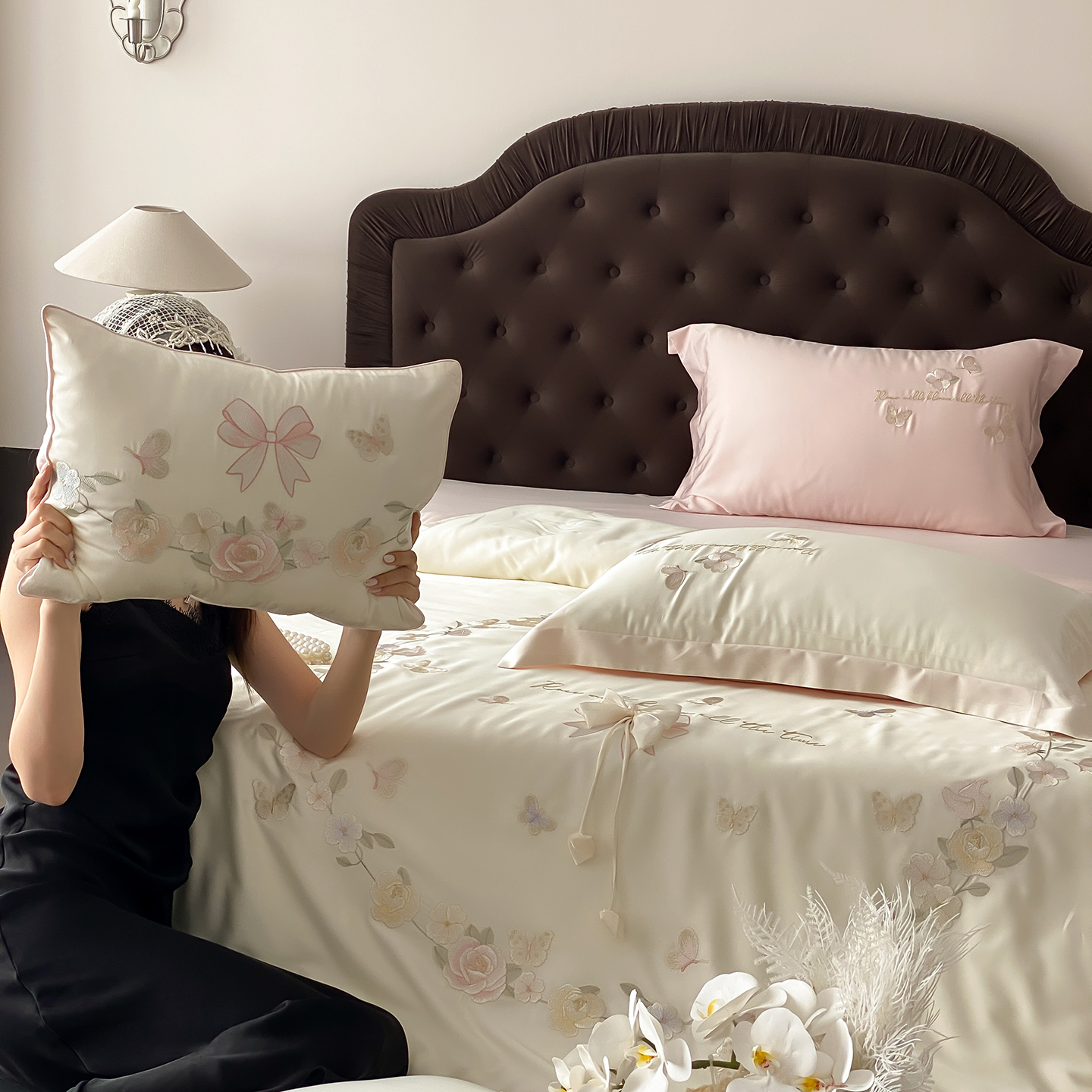 (总)佳汐蓝 2025春夏新品双层皱皱纱刺绣+织带+荷叶边四件套--白茶花,奶白,曲奇
