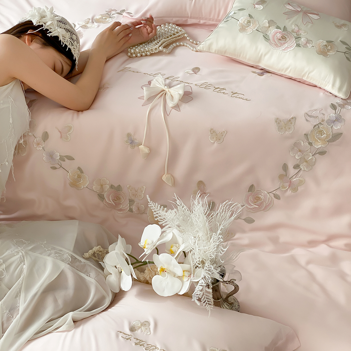 (总)佳汐蓝家纺 2025春夏新款天丝棉蝶舞繁花绣花天丝四件套,蝶舞繁花·粉,蝶舞繁花·蓝