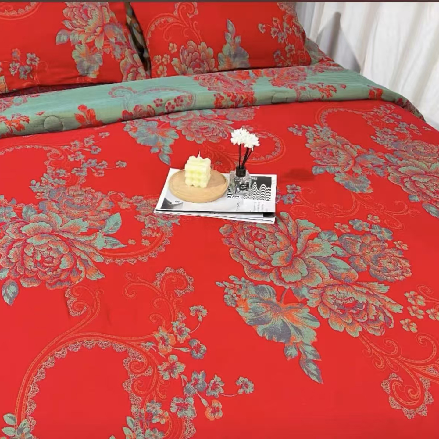 商品名称:禧多家纺 2025新款年货爆款大红双层纱四件套 盛世牡丹
