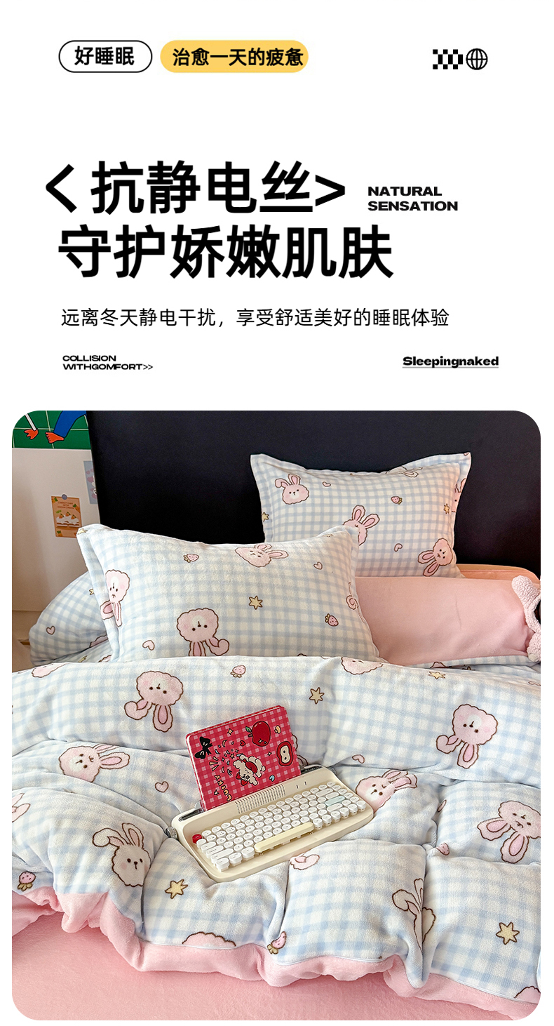 当前位置: 91家纺网 > 商品网购 > 床品套件 > 四件套 > 牛奶绒四件套 > 温眠家纺 2025新款加厚牛奶绒四件套跑量款 蓝格兔兔