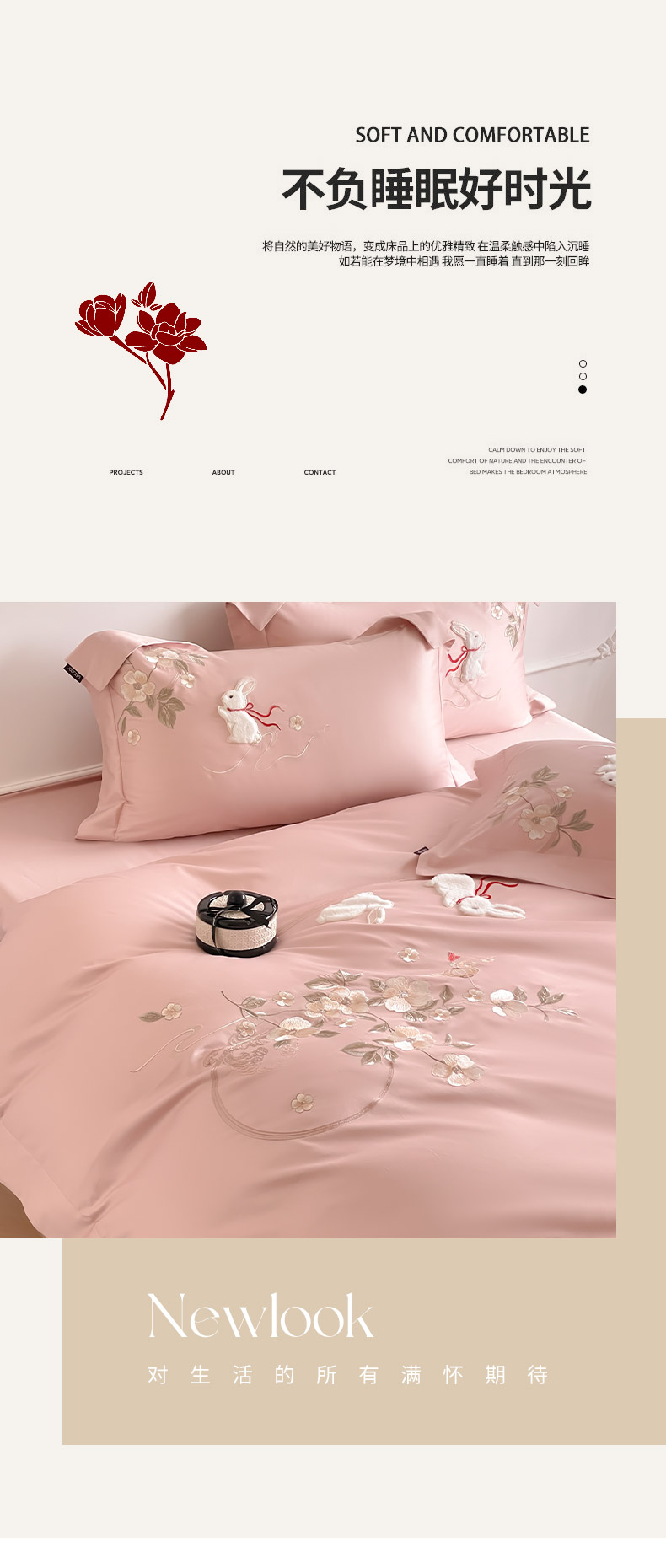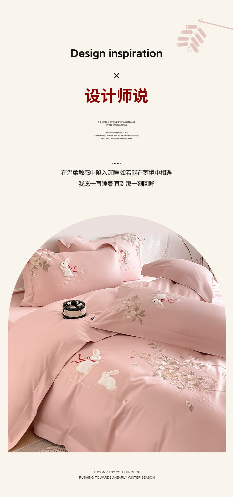 商品名称: 2026新年锦鲤A类贡缎长绒棉四件套纯棉重工刺绣被套床单床笠喜庆床上用品 柏丽兔-粉
