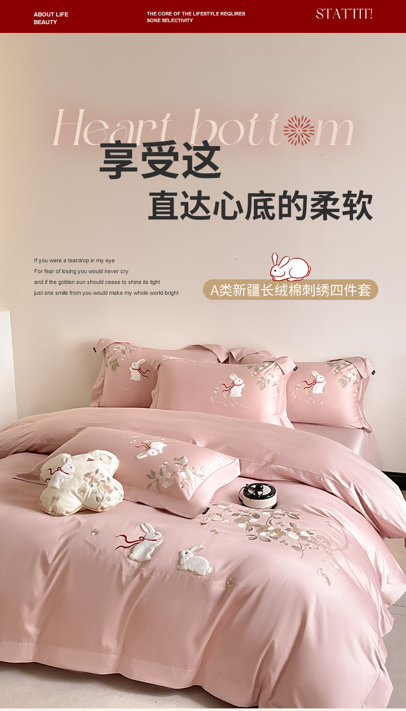 2026新年锦鲤A类贡缎长绒棉四件套纯棉重工刺绣被套床单床笠喜庆床上用品 柏丽兔-粉