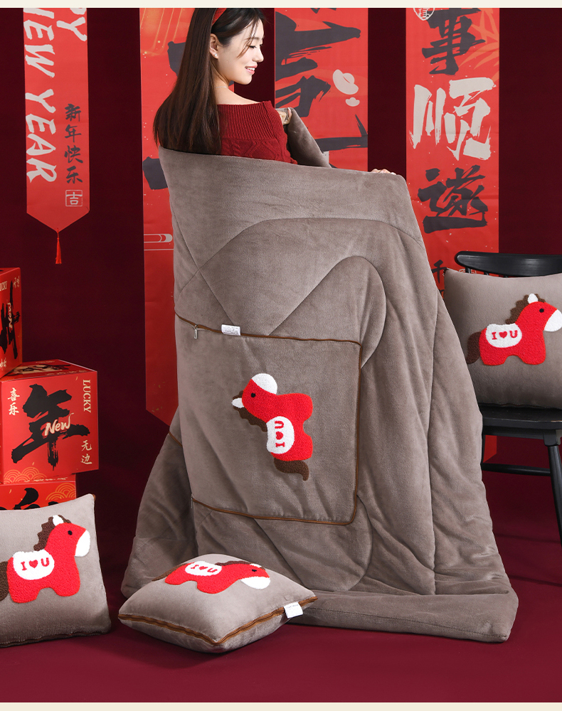 (总)宝马家纺(原梦童画) 2026新款马年限定抱枕被-萌马系列,黑色,红色,咖色,组合图仅展示
