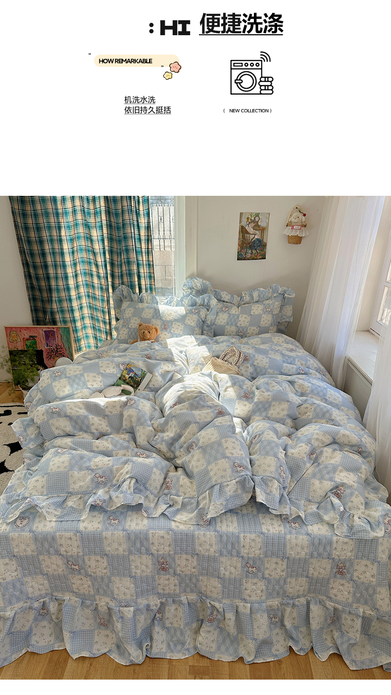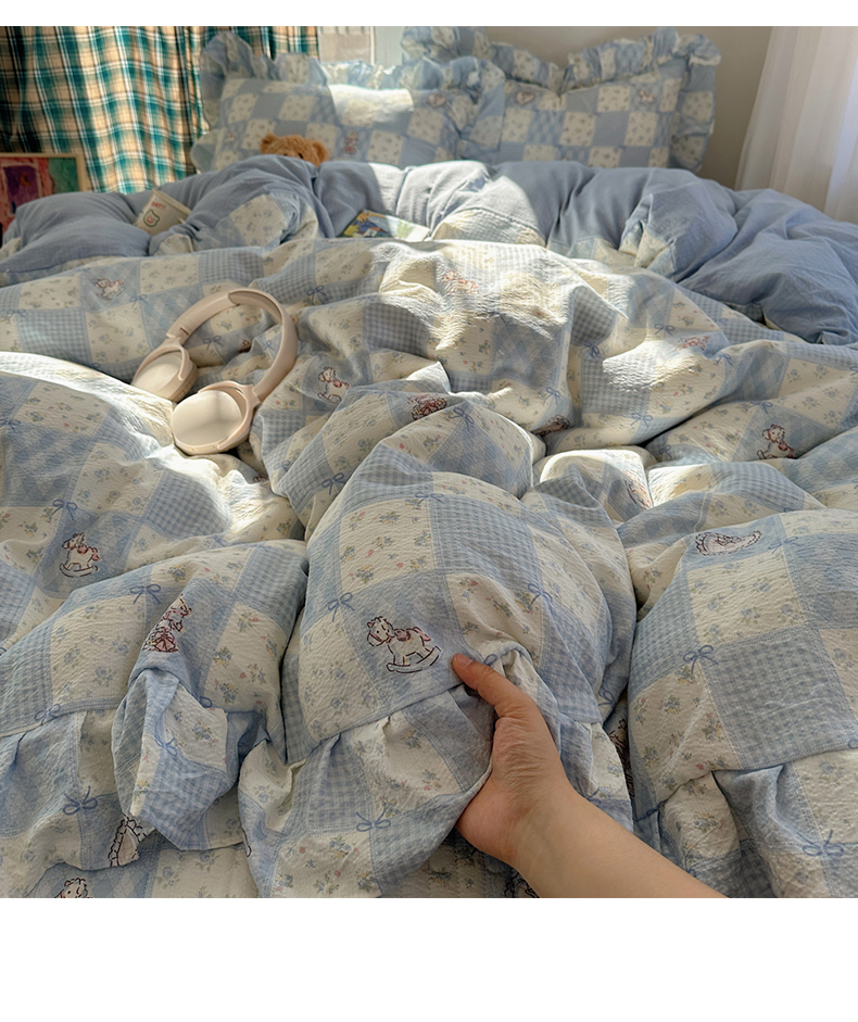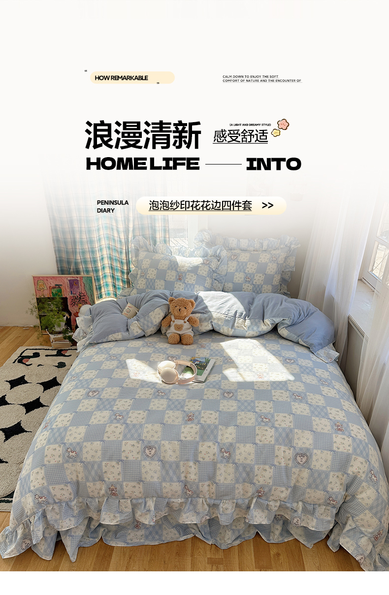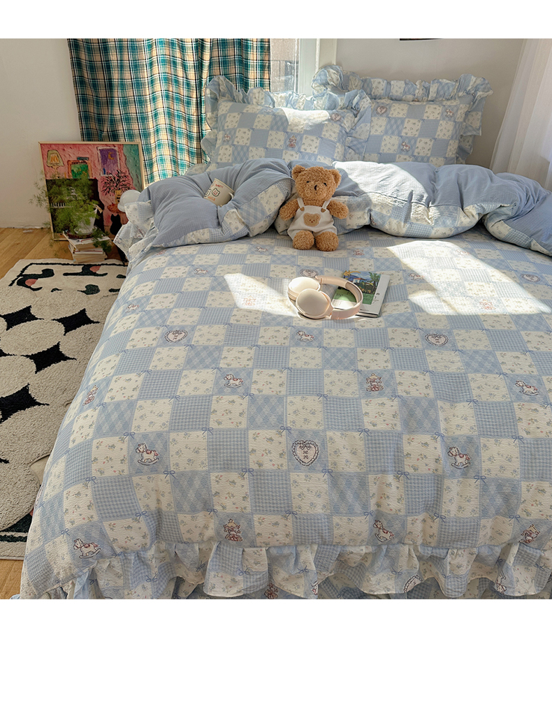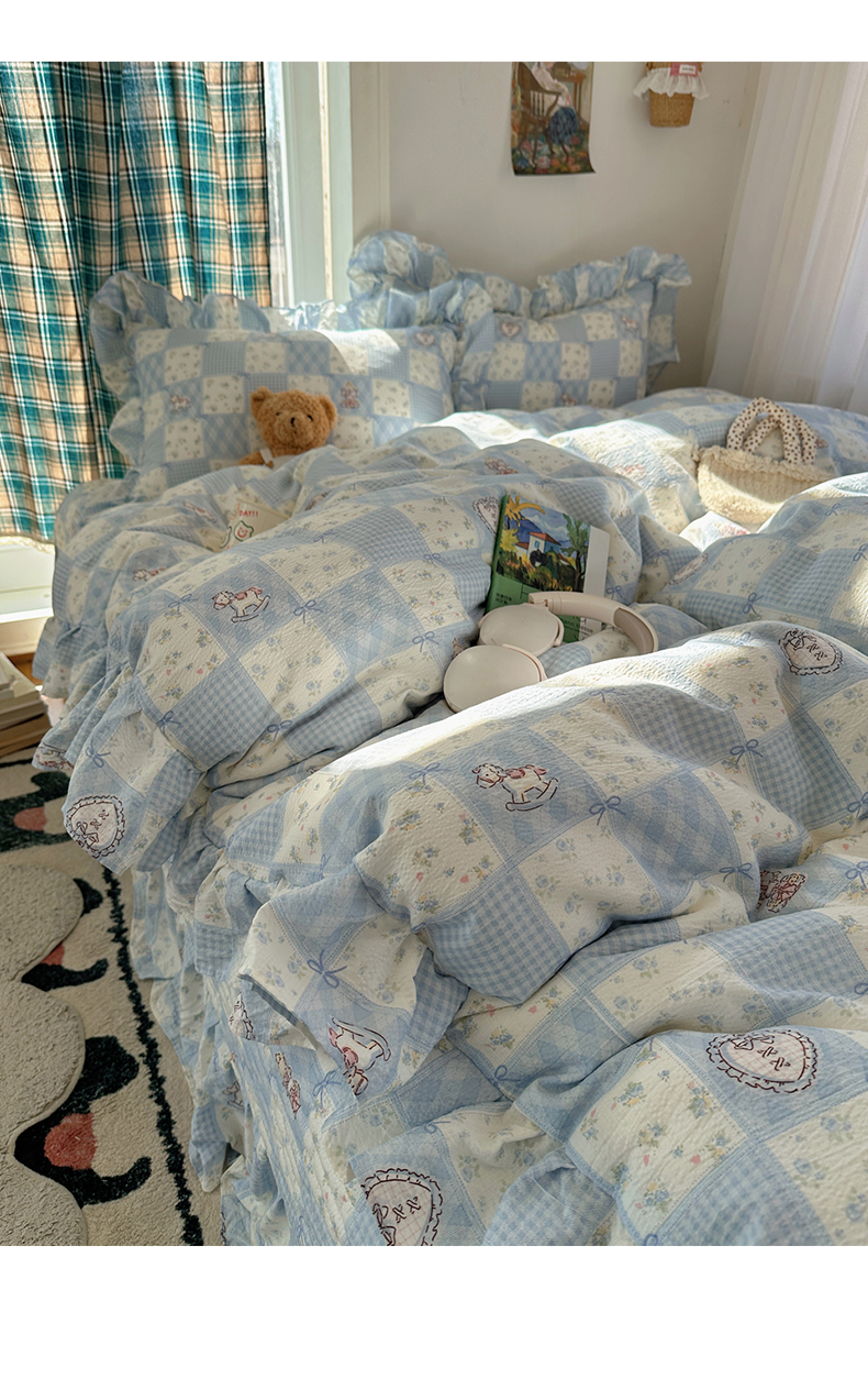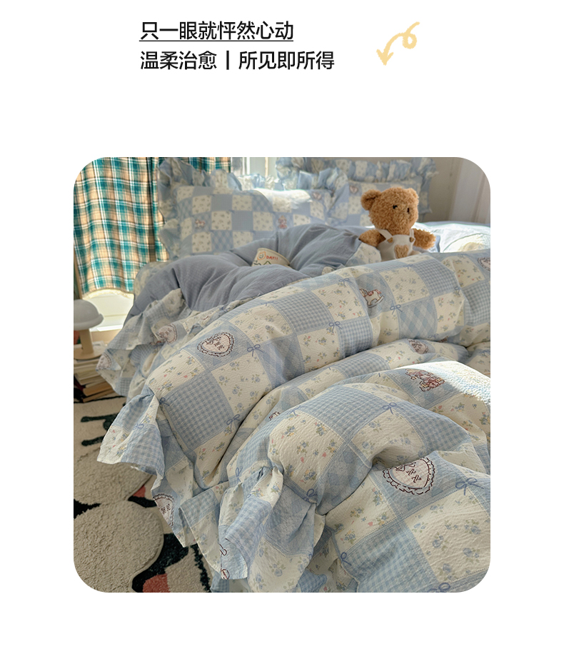 当前位置: 91家纺网 > 商品网购 > 床品套件 > 四件套 > 其它四件套 > 摩妮卡 2026春夏新款韩版花边水洗棉泡泡纱床盖四件套 幸福加马