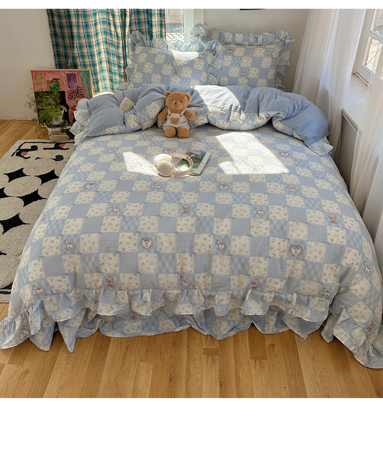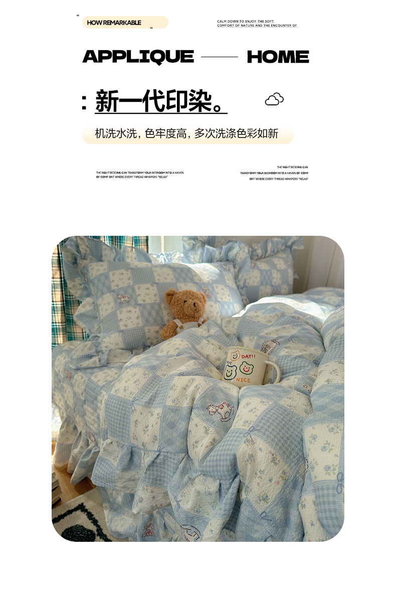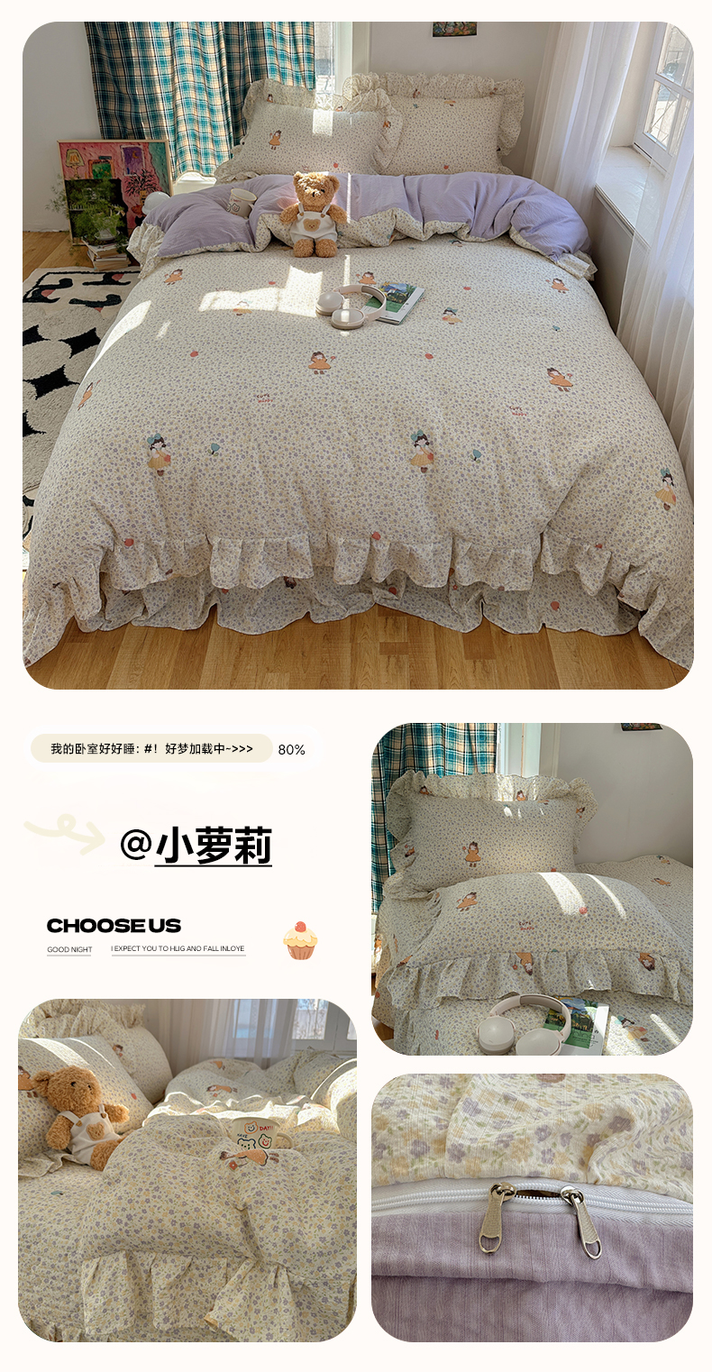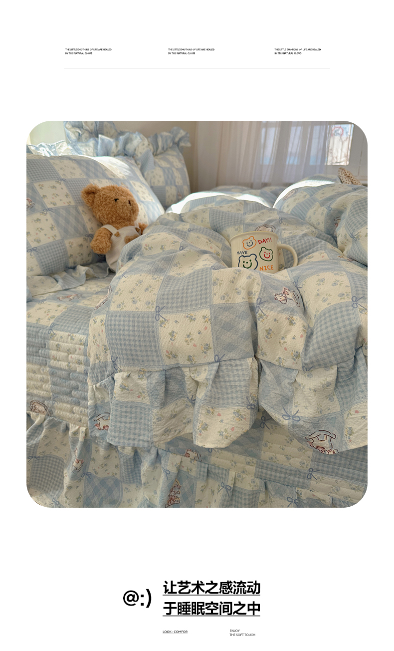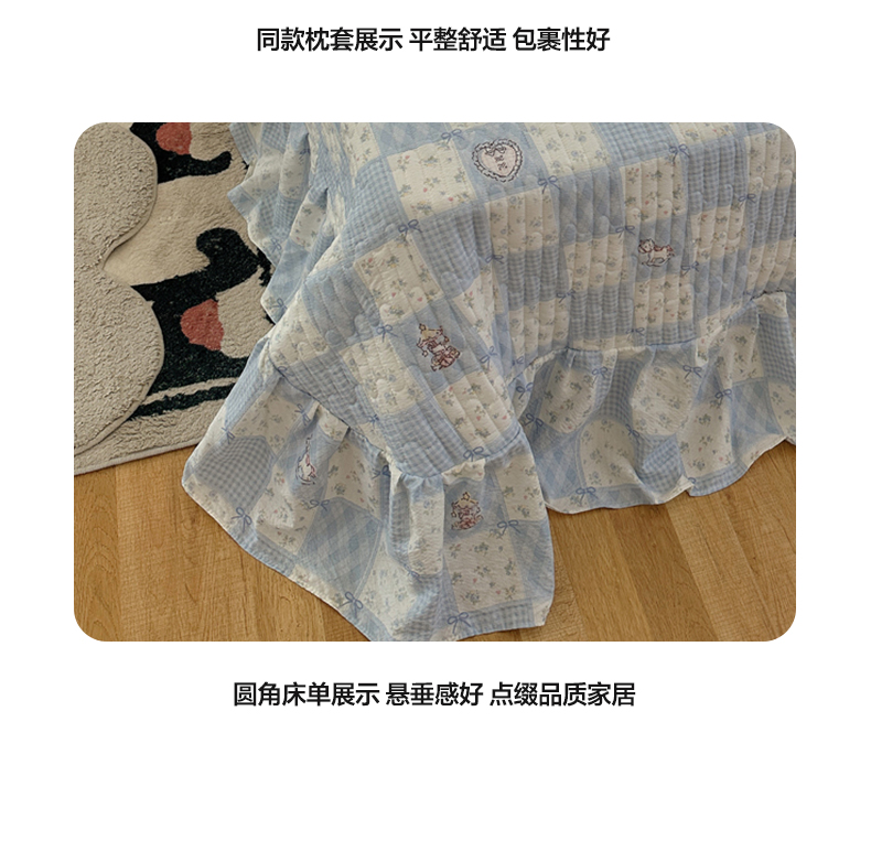 当前位置: 91家纺网 > 商品网购 > 床品套件 > 四件套 > 其它四件套 > 摩妮卡 2026春夏新款韩版花边水洗棉泡泡纱床盖四件套 幸福加马