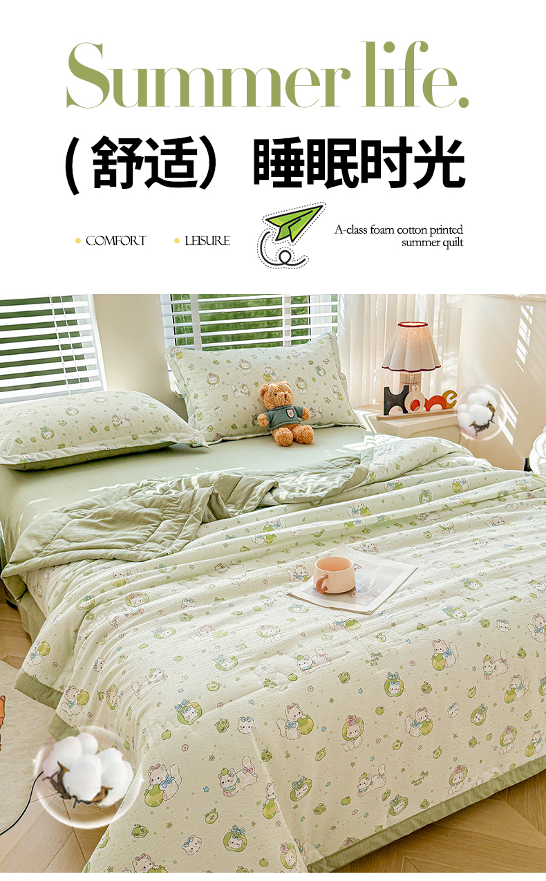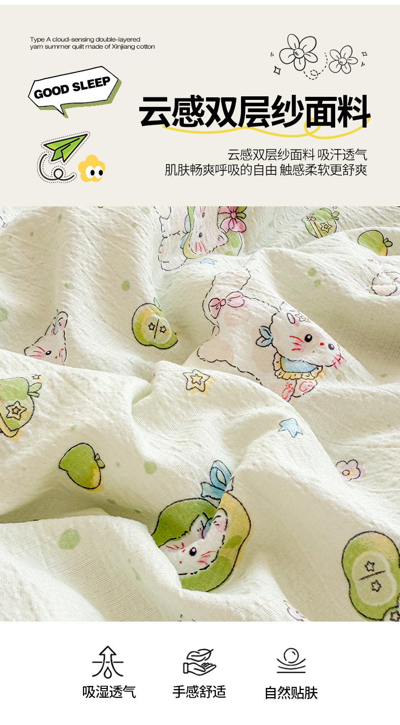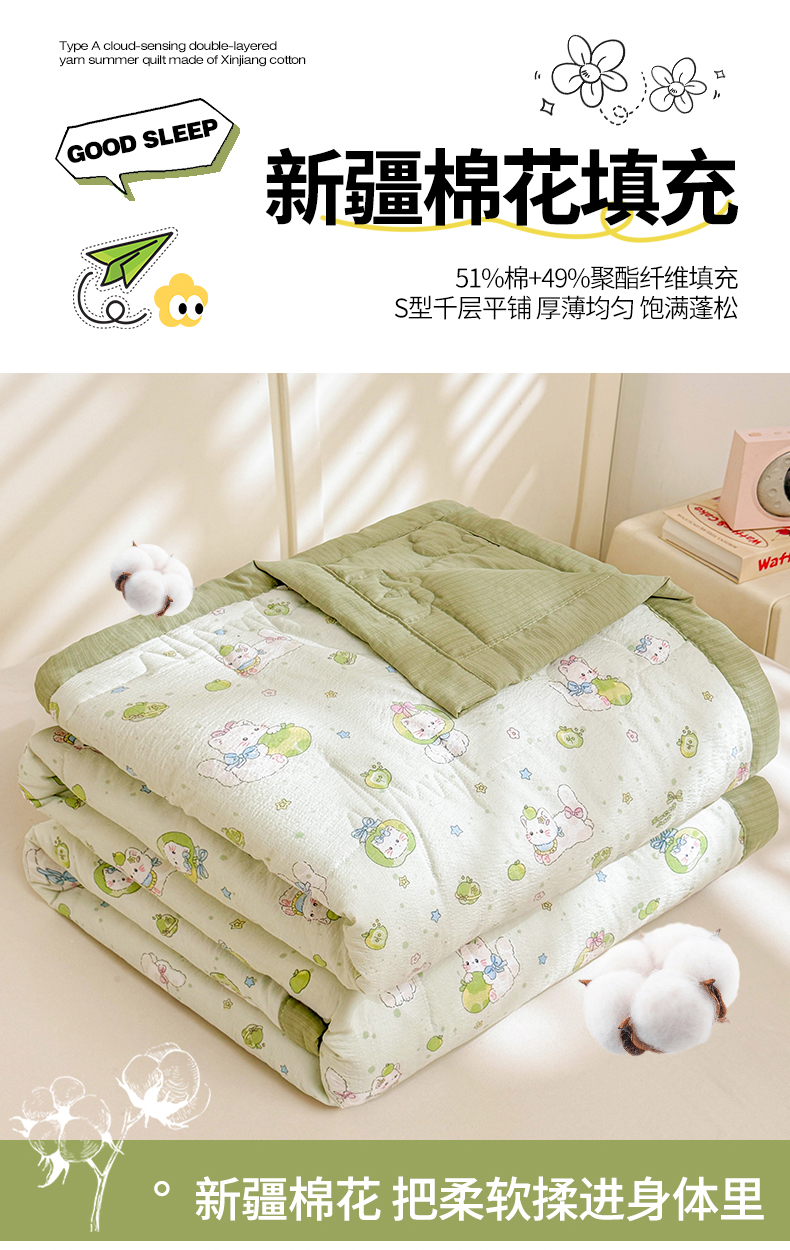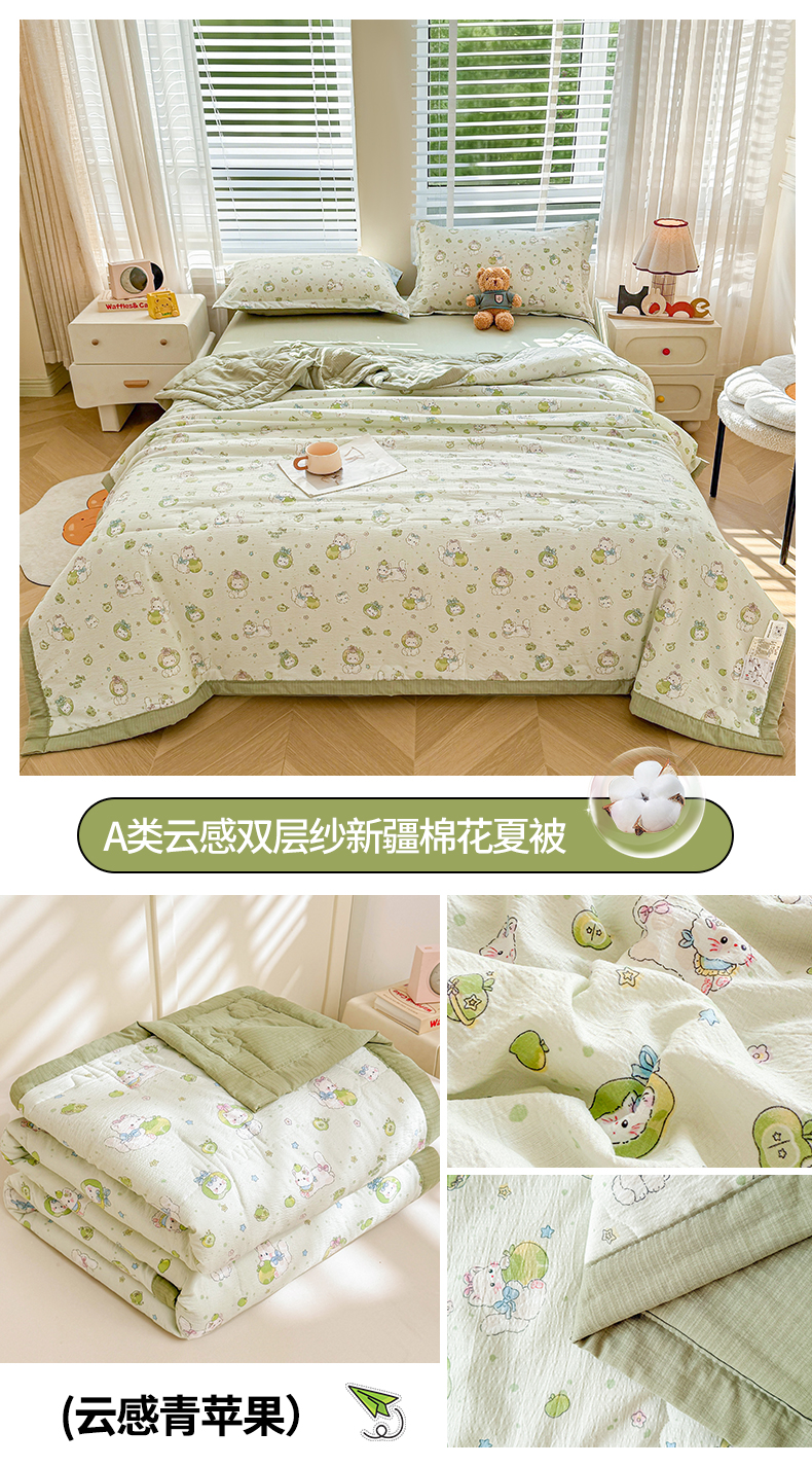 商品名称:西域种棉人·千百笠 2026新款A类新疆棉花夏凉被加宽包边水洗棉卡通印花吸湿透气棉花夏被空调被 云感青苹果