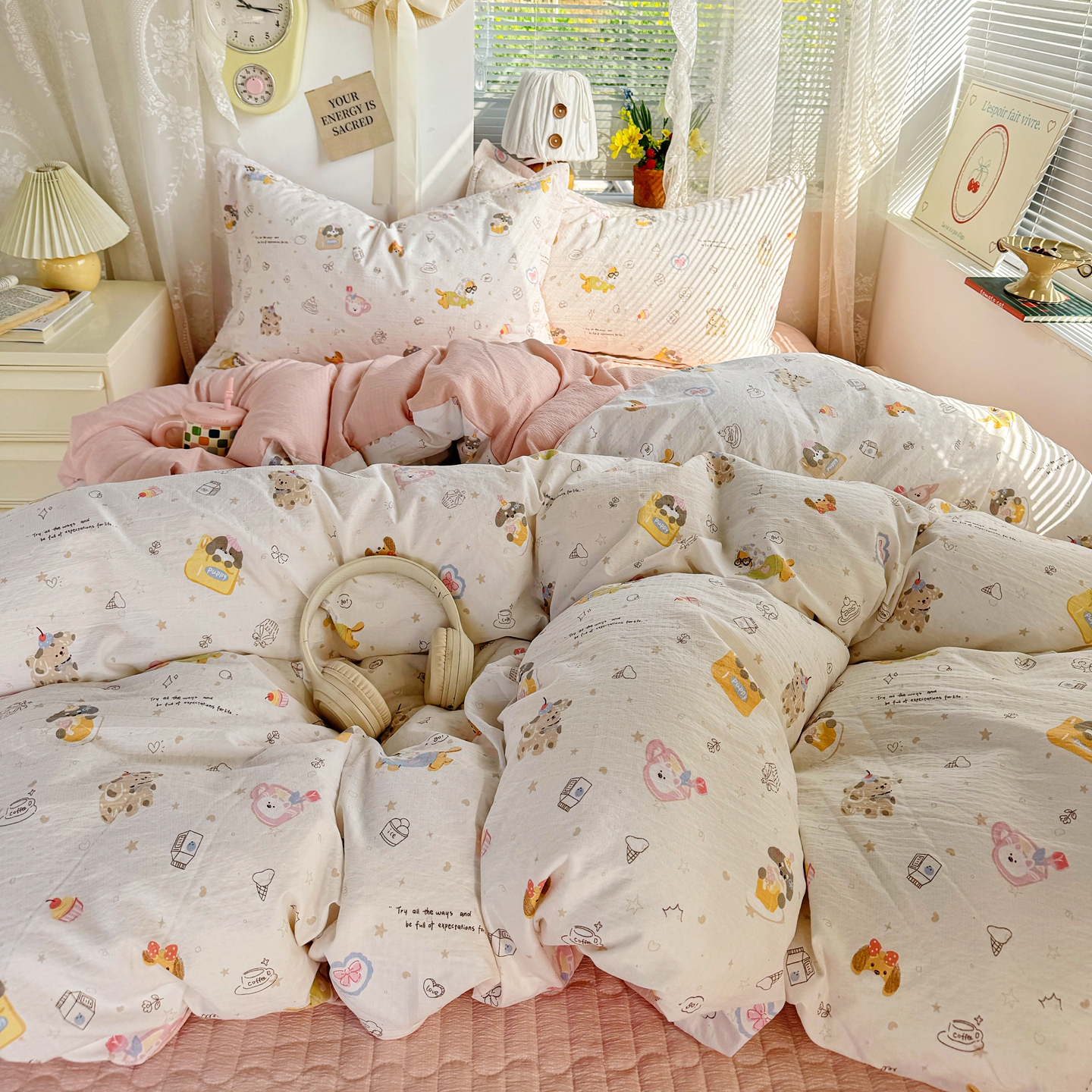商品名称:麦朵家居 2026新款双层皱皱纱仿棉床盖款四件套水洗棉小清新三件套 樱桃小狗