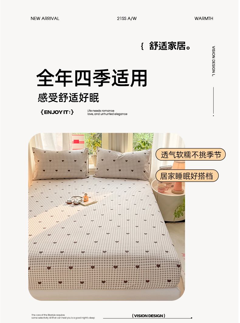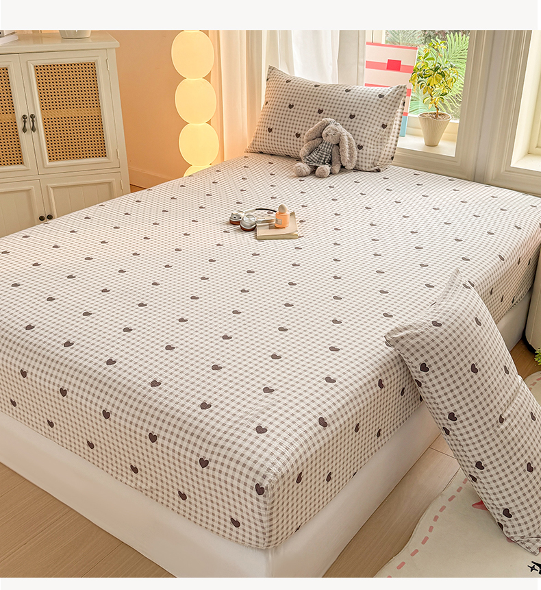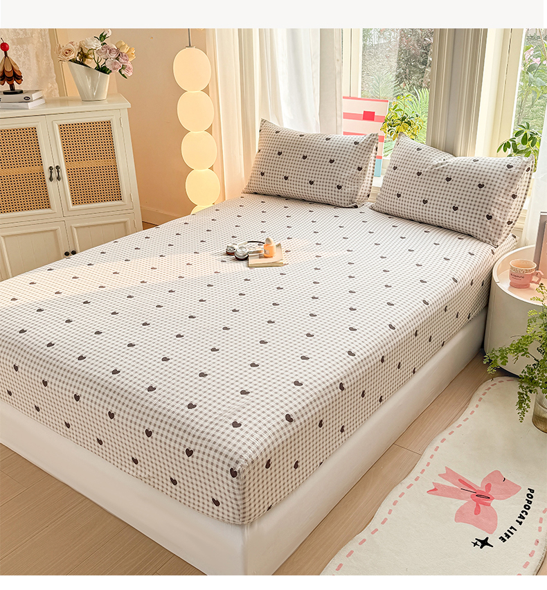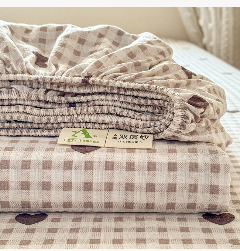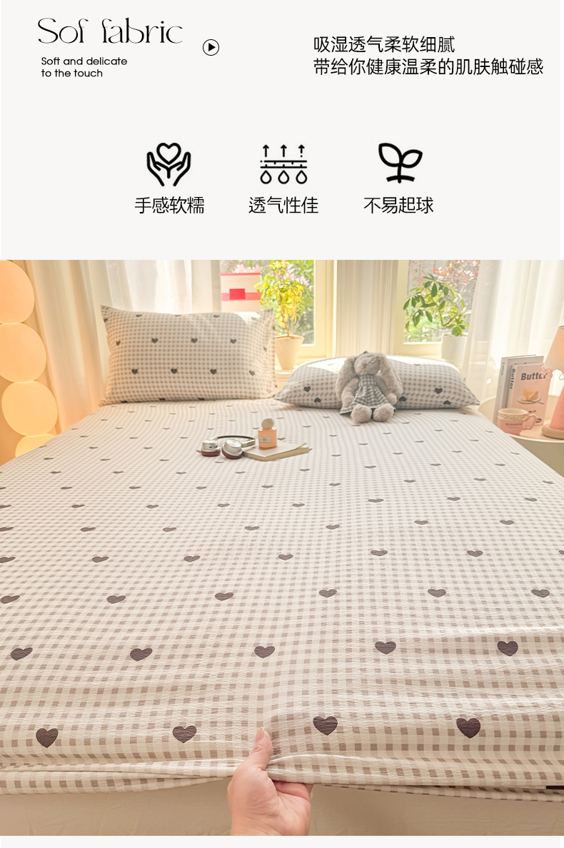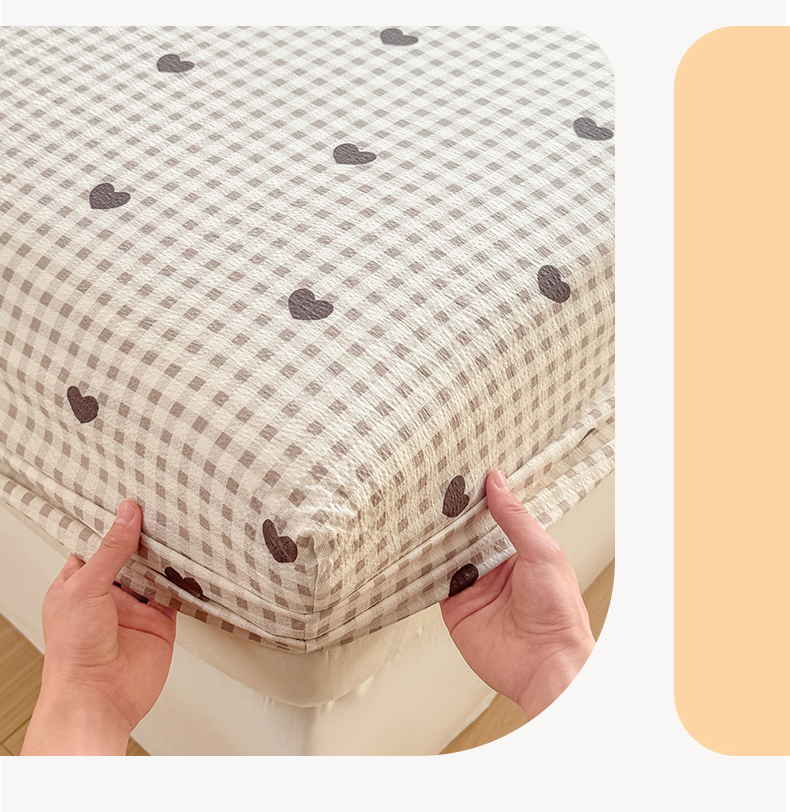 • 91家纺网 家纺一手货源 找家纺 丝芙妮家居 2026新款四季皱皱棉柔软透气不闷汗木棉床笠单件三件套-系列三 格纹爱心