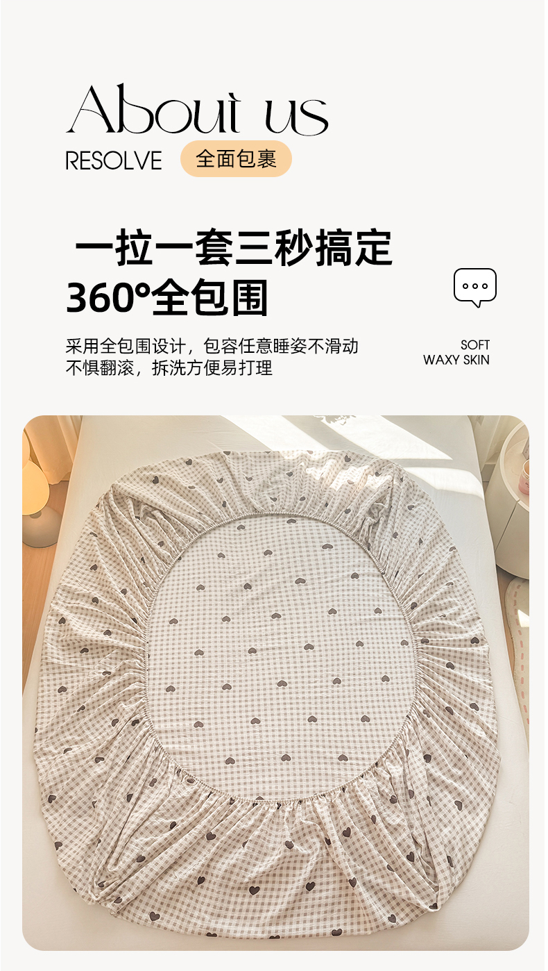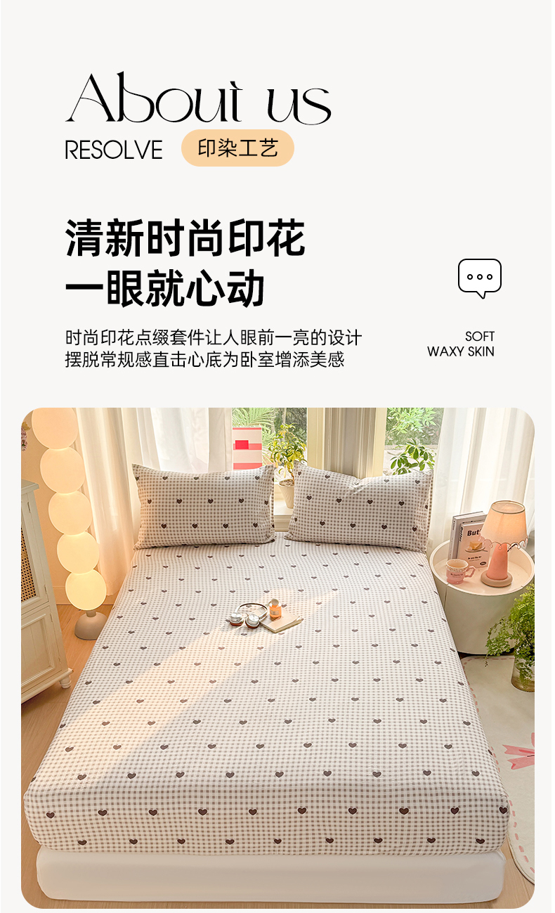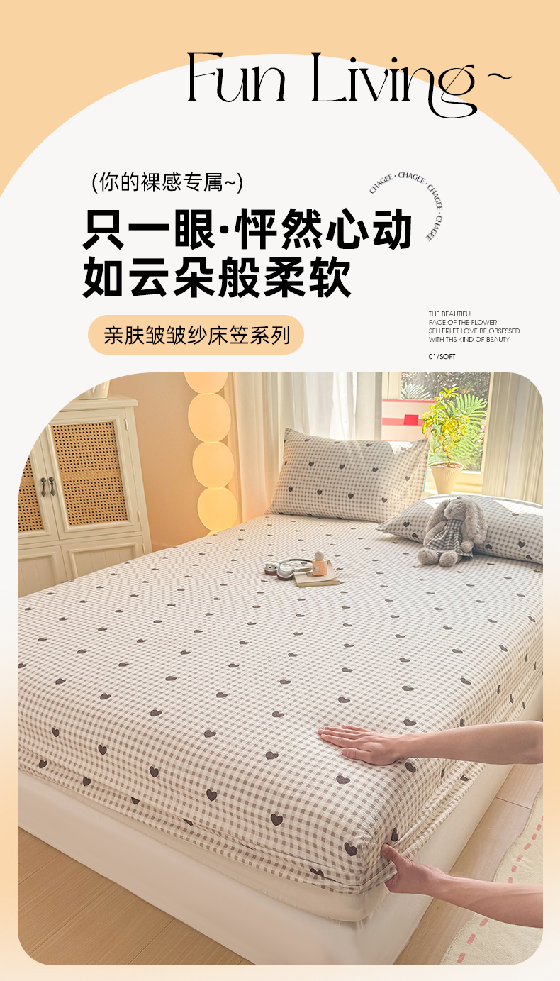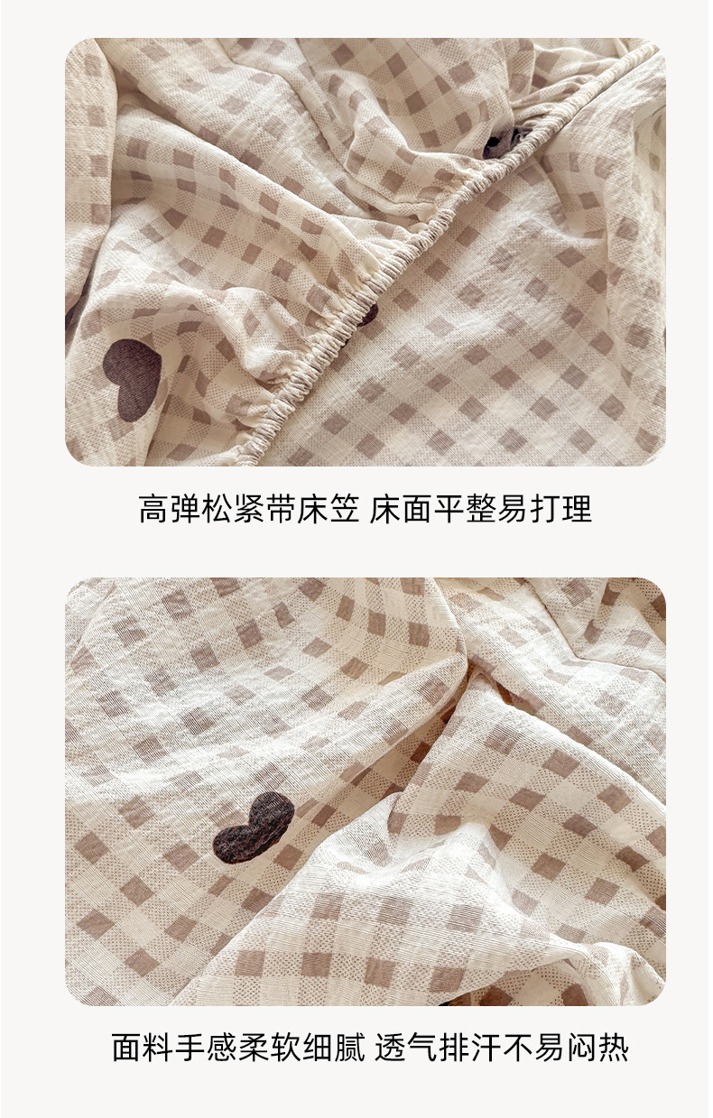 丝芙妮家居 2026新款四季皱皱棉柔软透气不闷汗木棉床笠单件三件套-系列三 格纹爱心