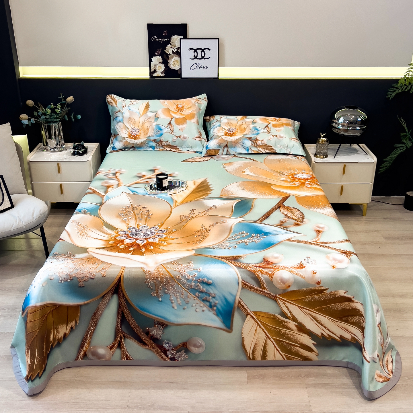 商品名称:梵克保罗 2026春夏新款数码印花大版高克重冰丝凉席三件套 牡丹