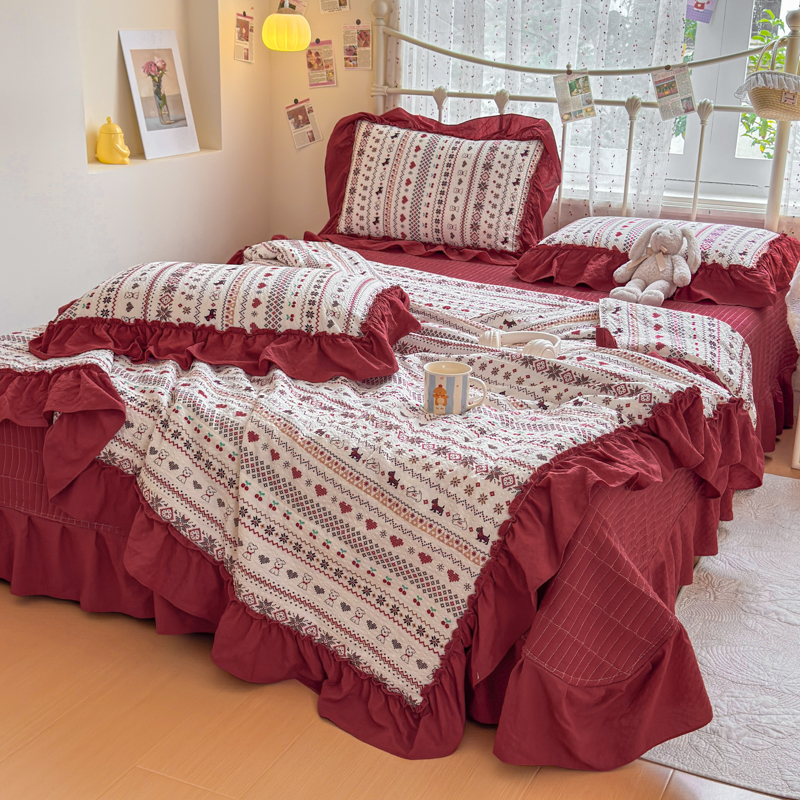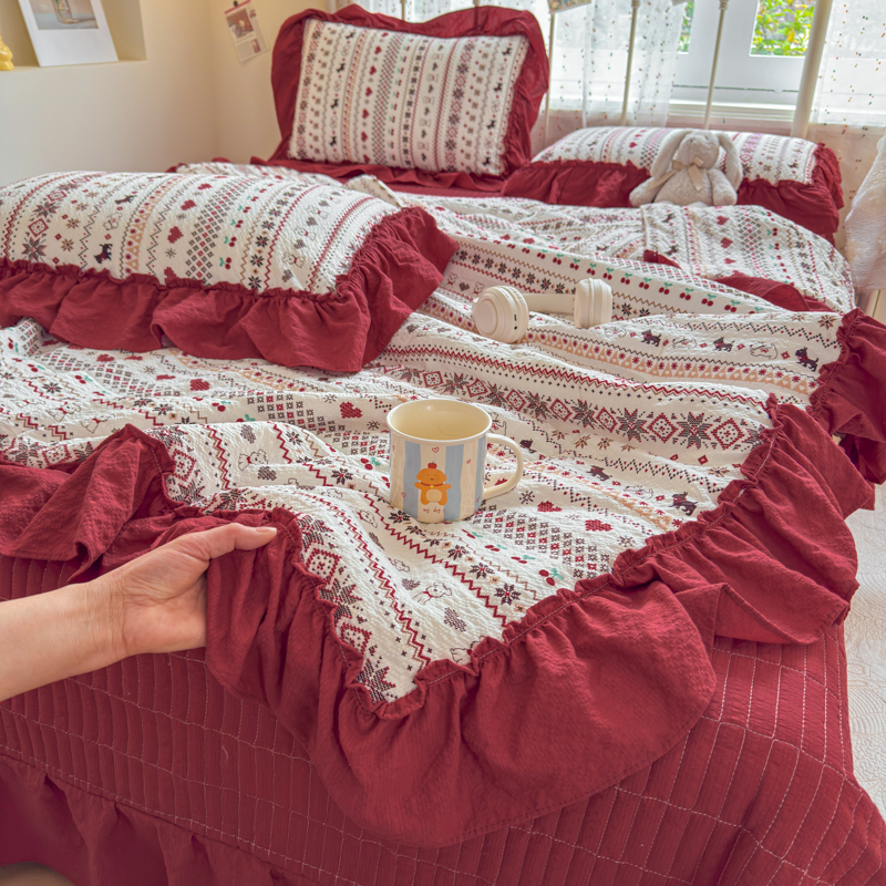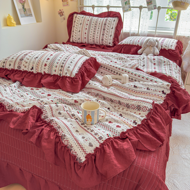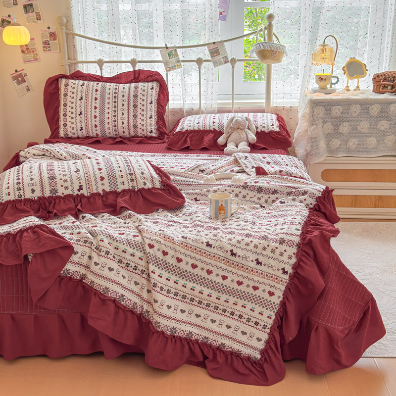 梵希雅 2026新款泡芙纱纯棉蕾丝花边夏被四件套 莓系花伐,莓系花伐