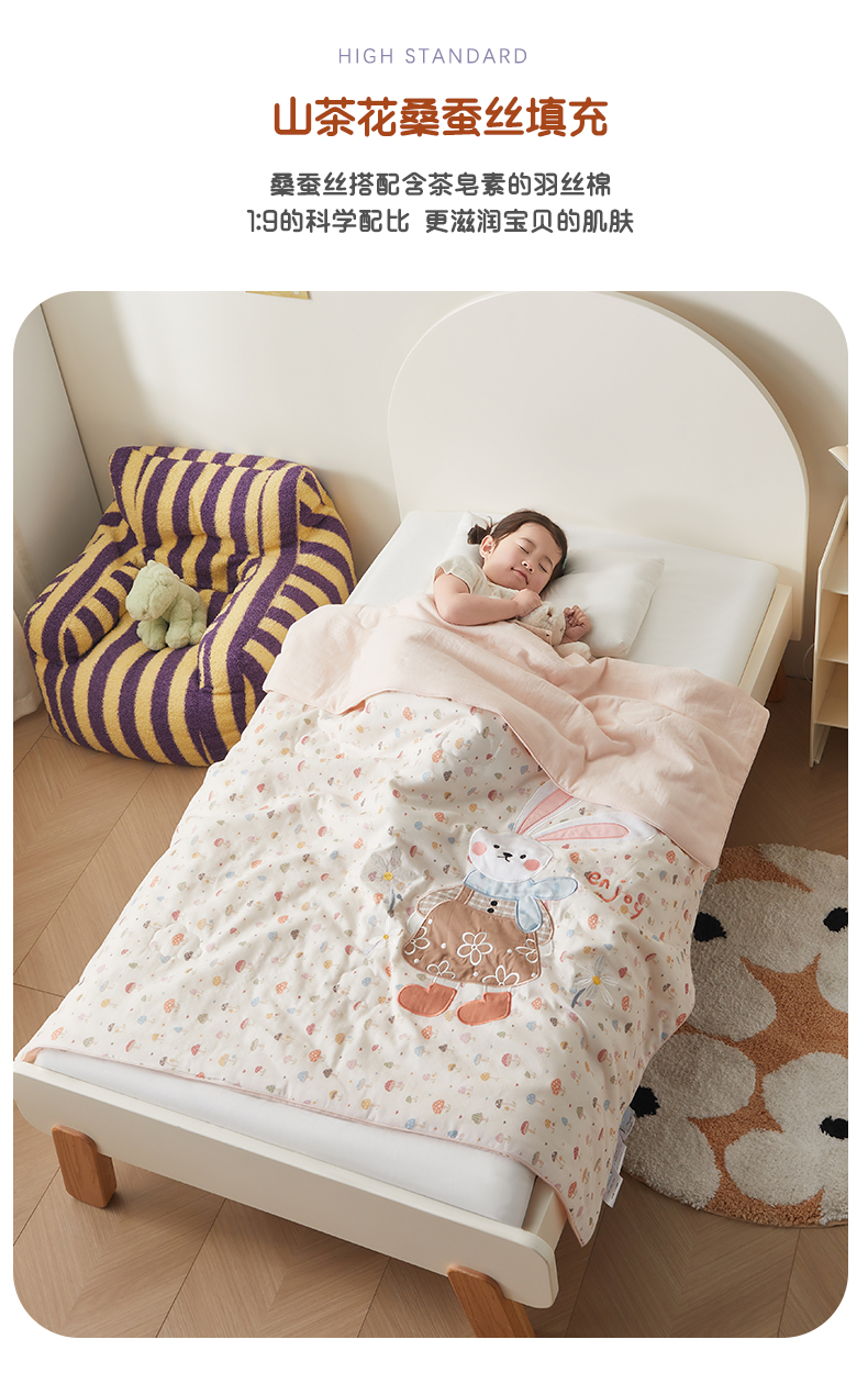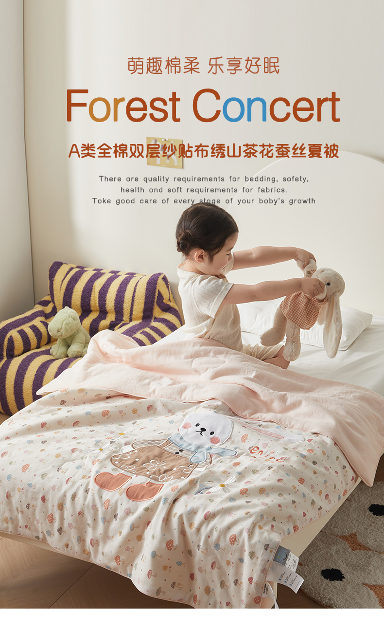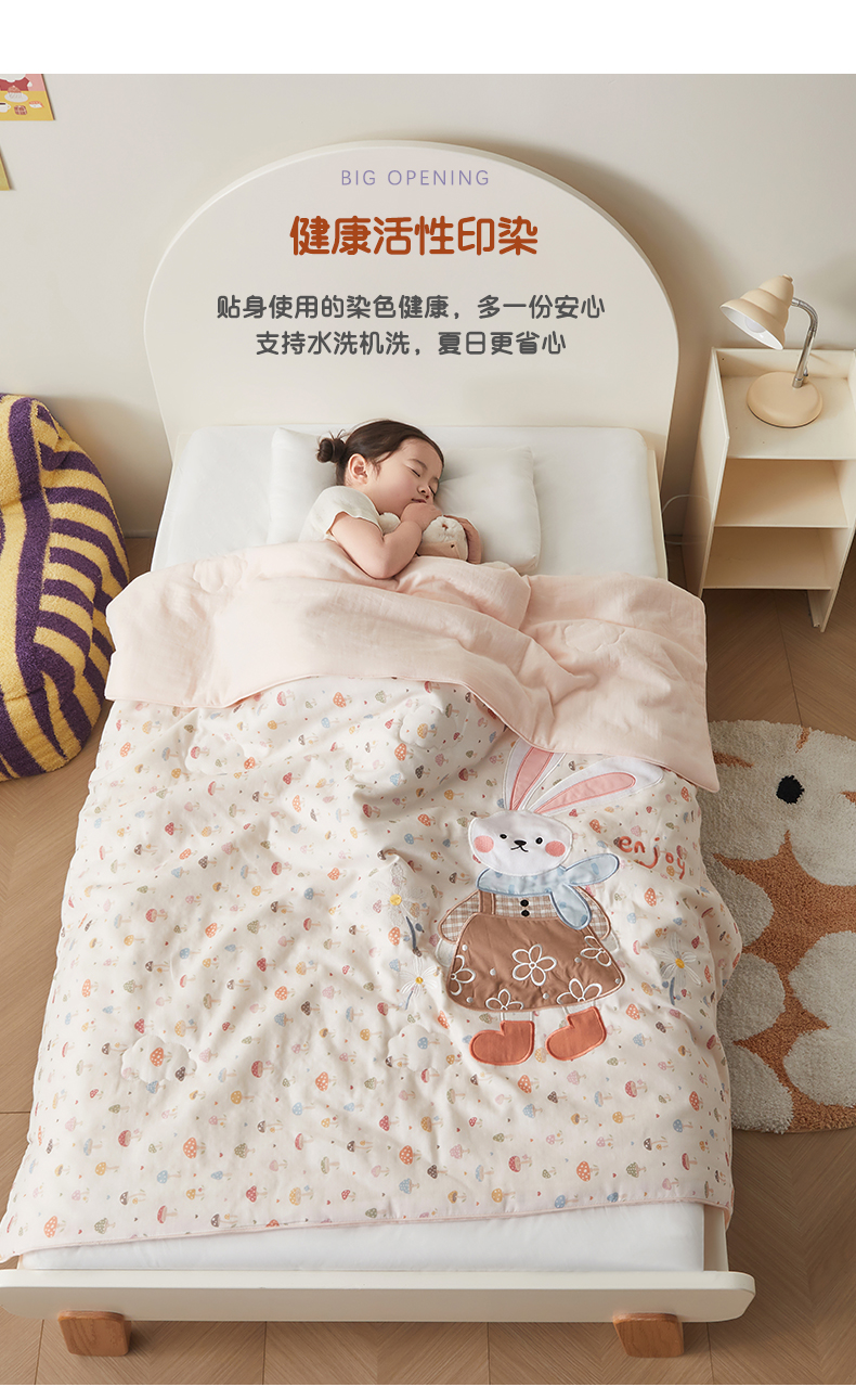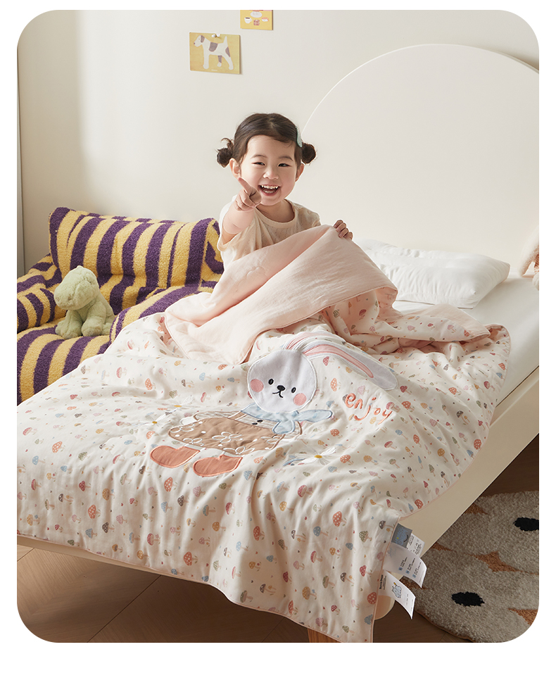 商品名称:荷马之梦 2026新款全棉纯棉双层纱印花贴布绣卡通山茶蚕丝儿童夏被-轻芯系列 花花小兔