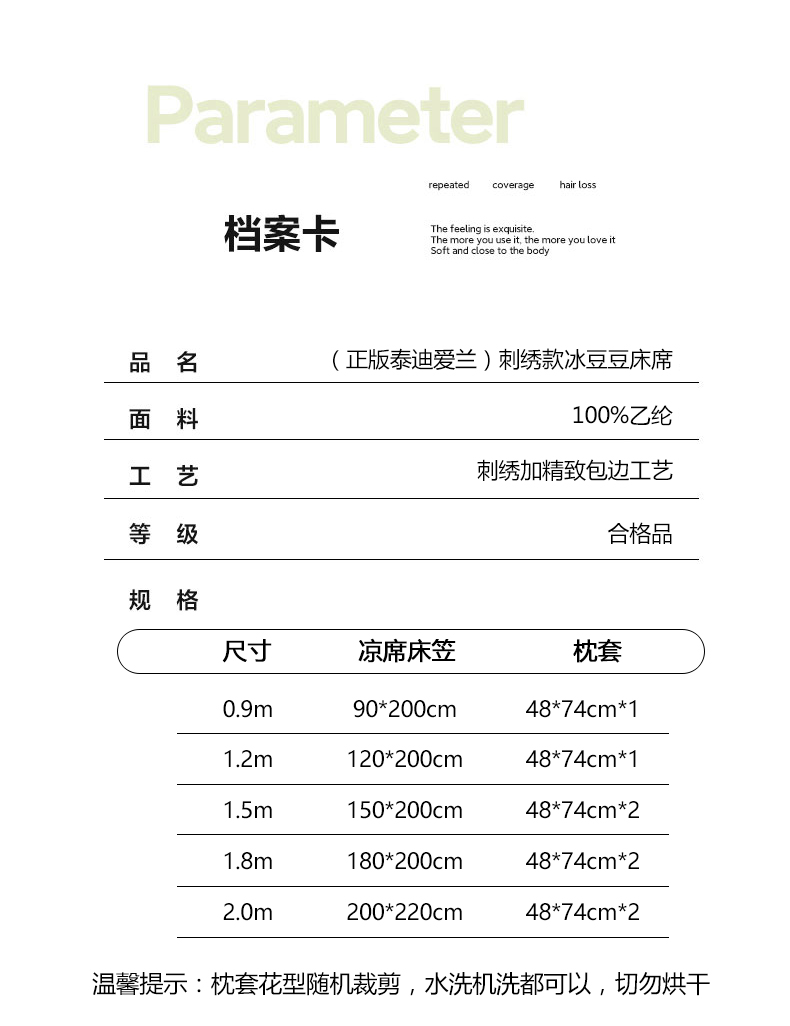 商品名称:(总)慕木家纺 2026新品A类高端刺绣PE乙纶冰豆豆凉席泰迪爱兰系列正版授权(提供买家秀)
