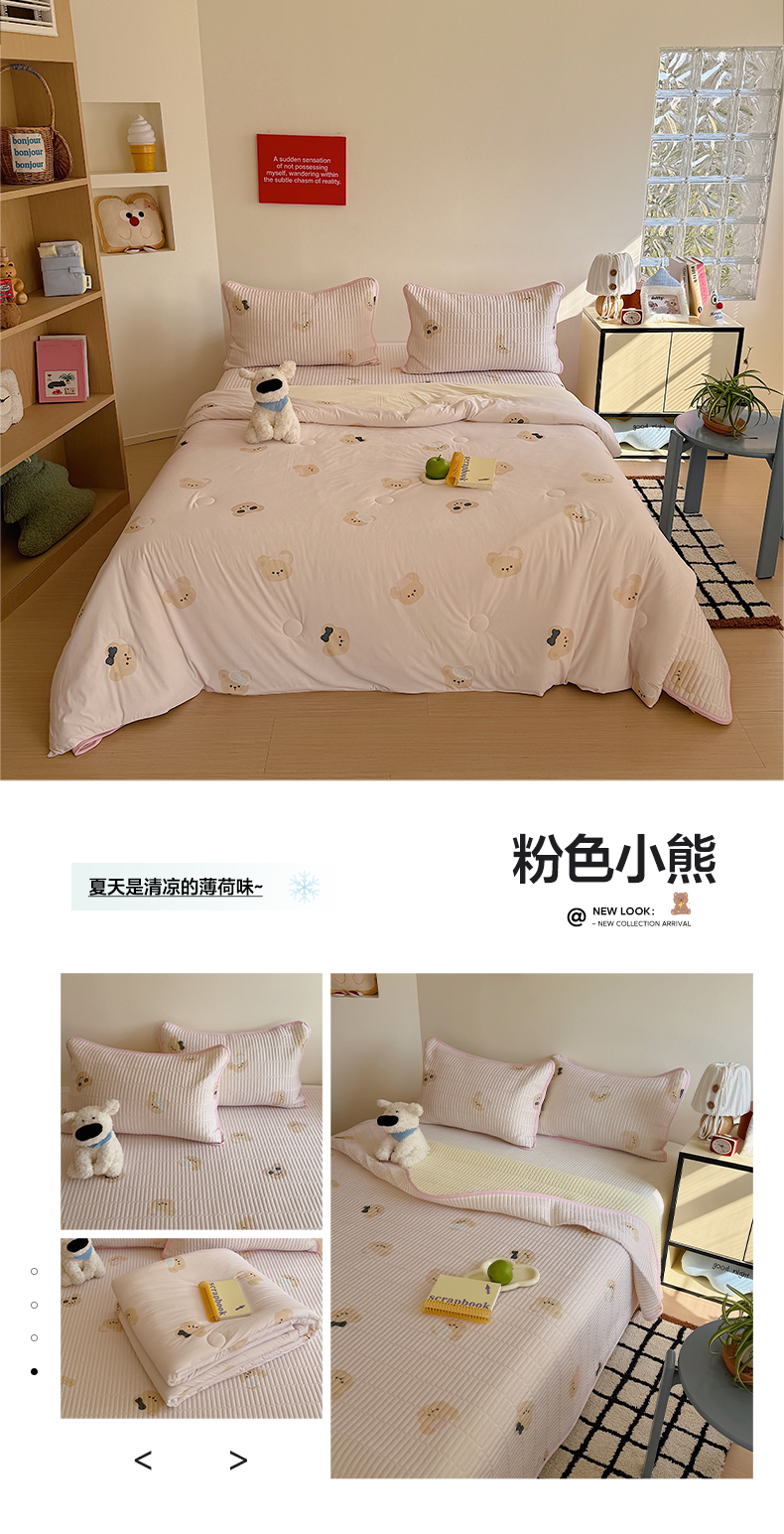 (总)美乐迪家纺 2026春夏新款水光冰丝床盖夏被夏凉被空调被四件套,组合图仅供展示不可下单,彩色小花,粉色费尔岛,粉色小熊,苹果,小草莓,小碎花蓝,星星猫咪,樱桃粉,樱桃蓝