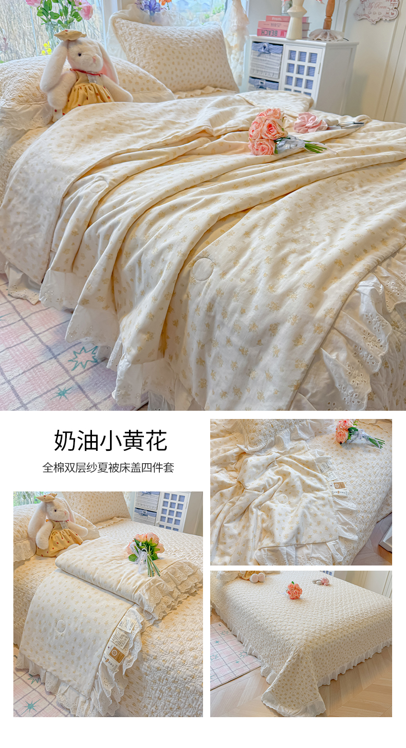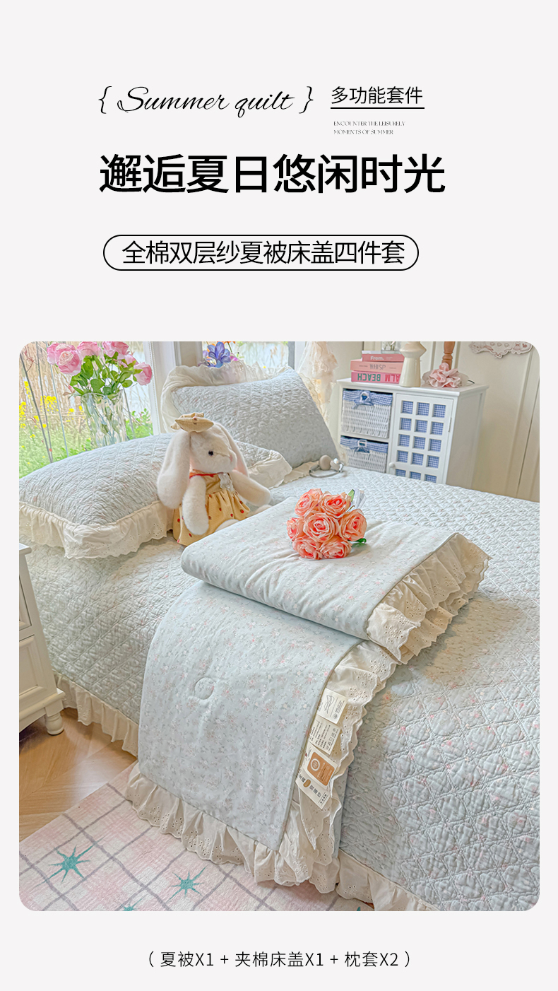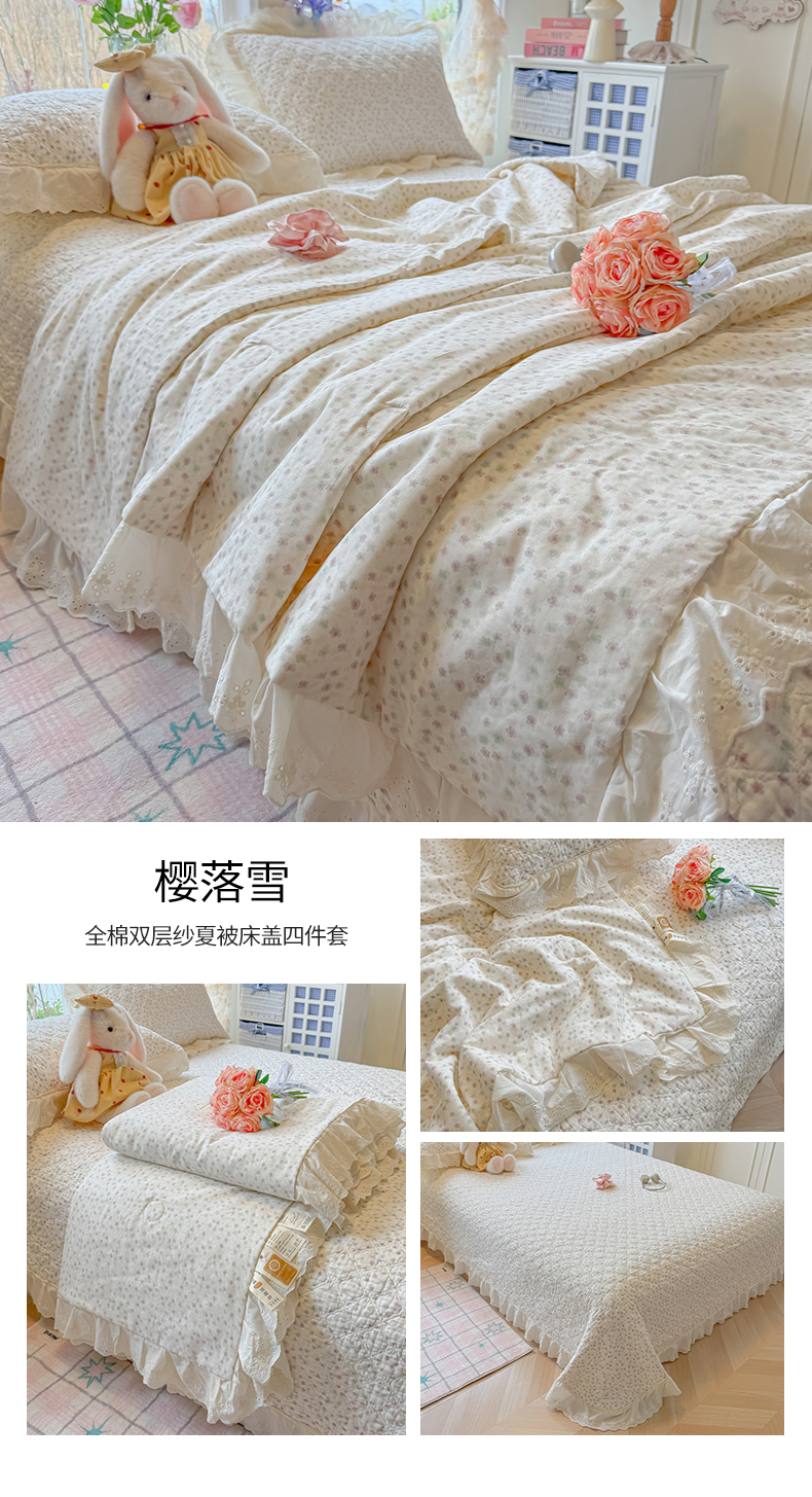 (总)慕晨 2026新款大花边全棉双层纱多功能夏凉被床盖四件套高温水洗床盖夹棉三件套,栗色蔷薇,奶糖兔,柔蓝花,浅灰枝语,奶油小黄花,海盐莓语,草莓奶昔,冰蓝星,松雾花,桃雾,樱落雪